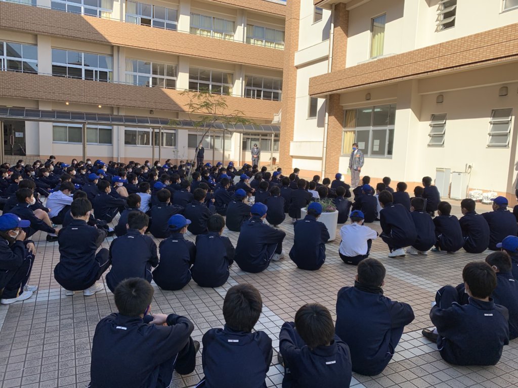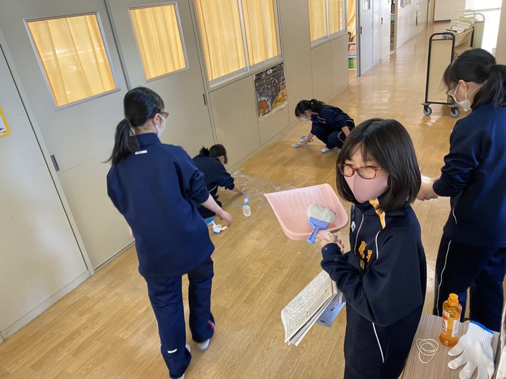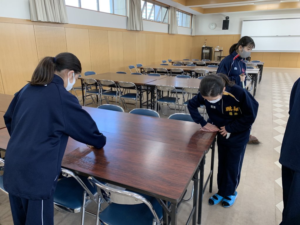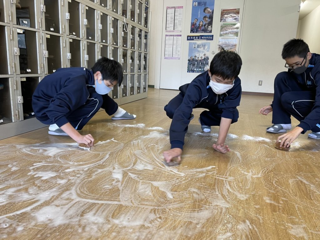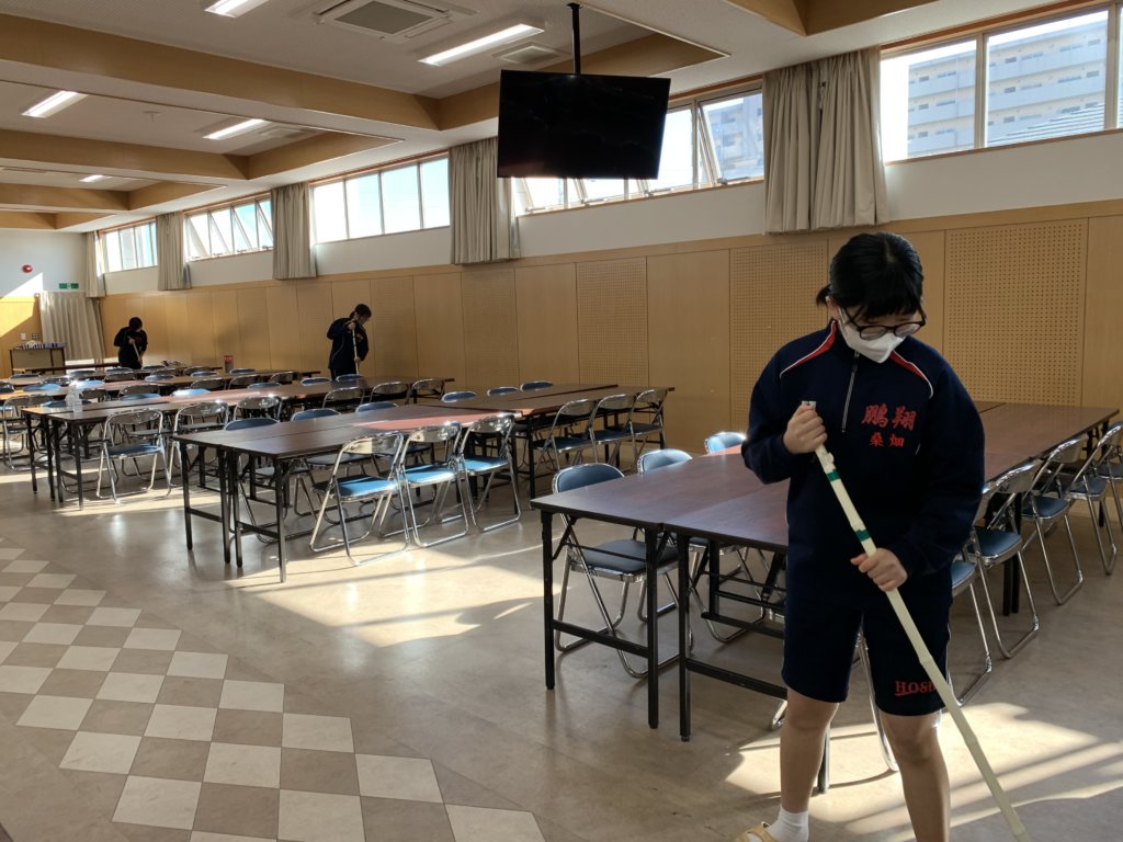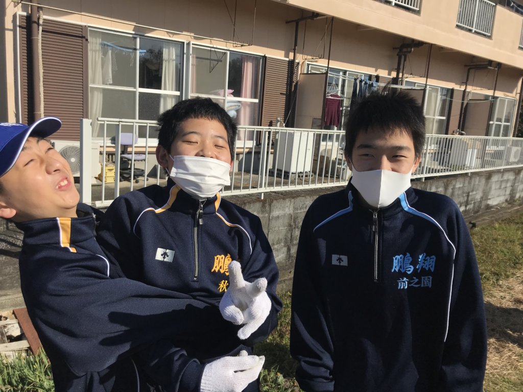 今日は、ファミリー交流会を行いました。交流会で行った清掃ボランティアの様子をお届けします。鵬翔中学校では、ファミリー制度という縦割りの班活動を取り入れています。各ファミリーにわかれて、学校の清掃を行いました。