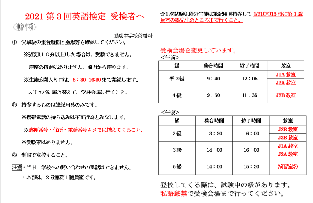 24日(日)第3回英語検定です。受検をする生徒は集合時間、受検会場を確認しておきましょう。