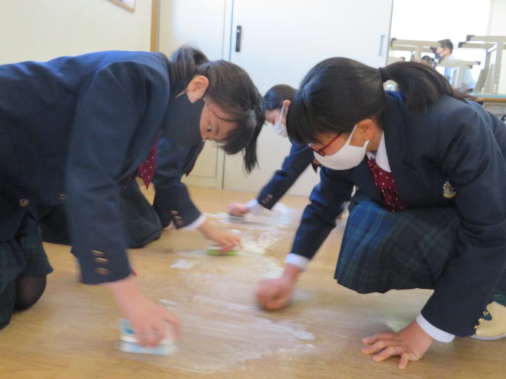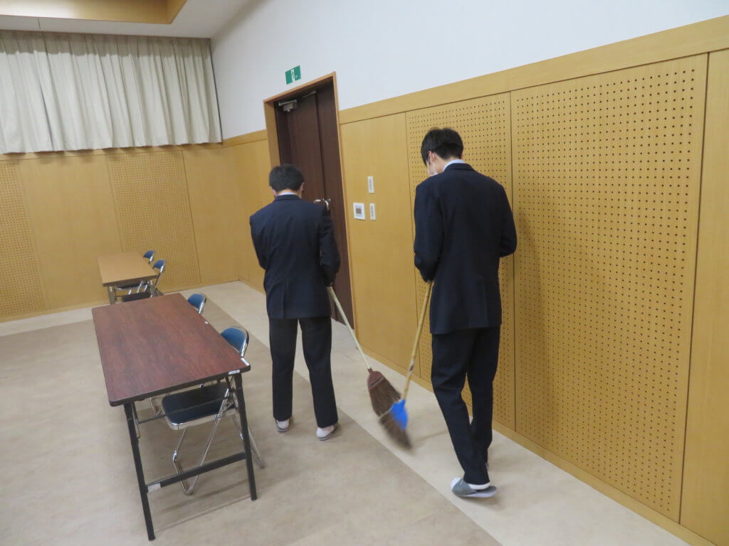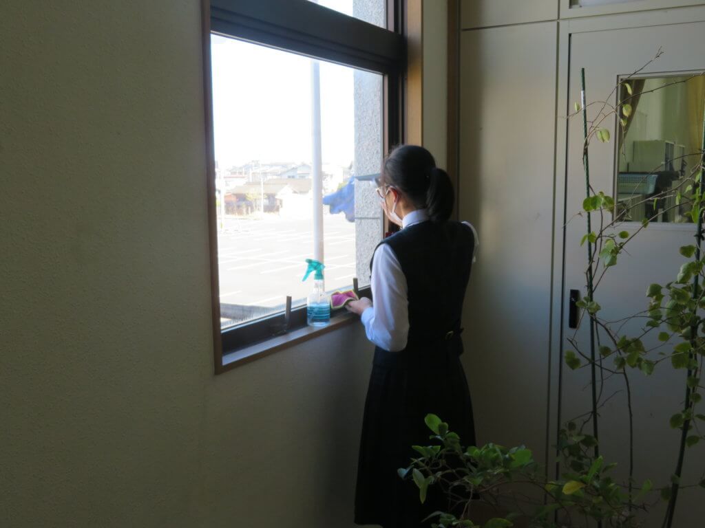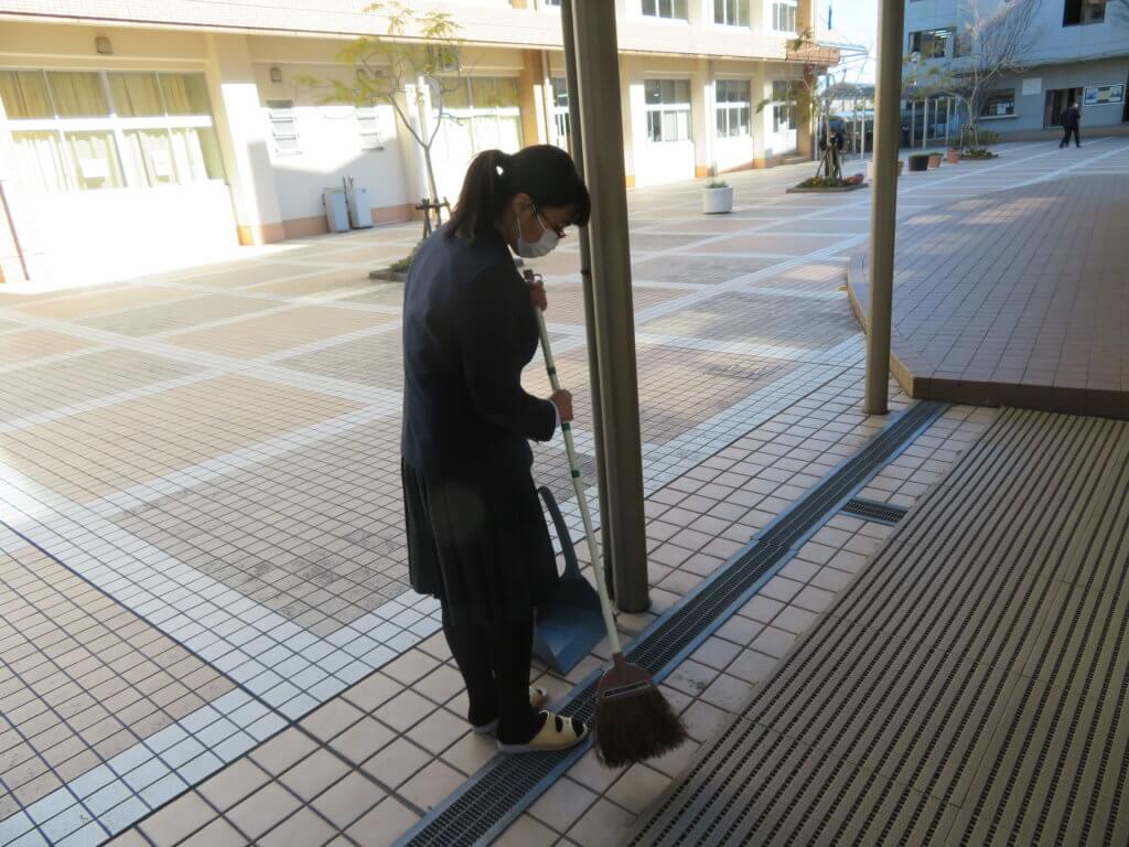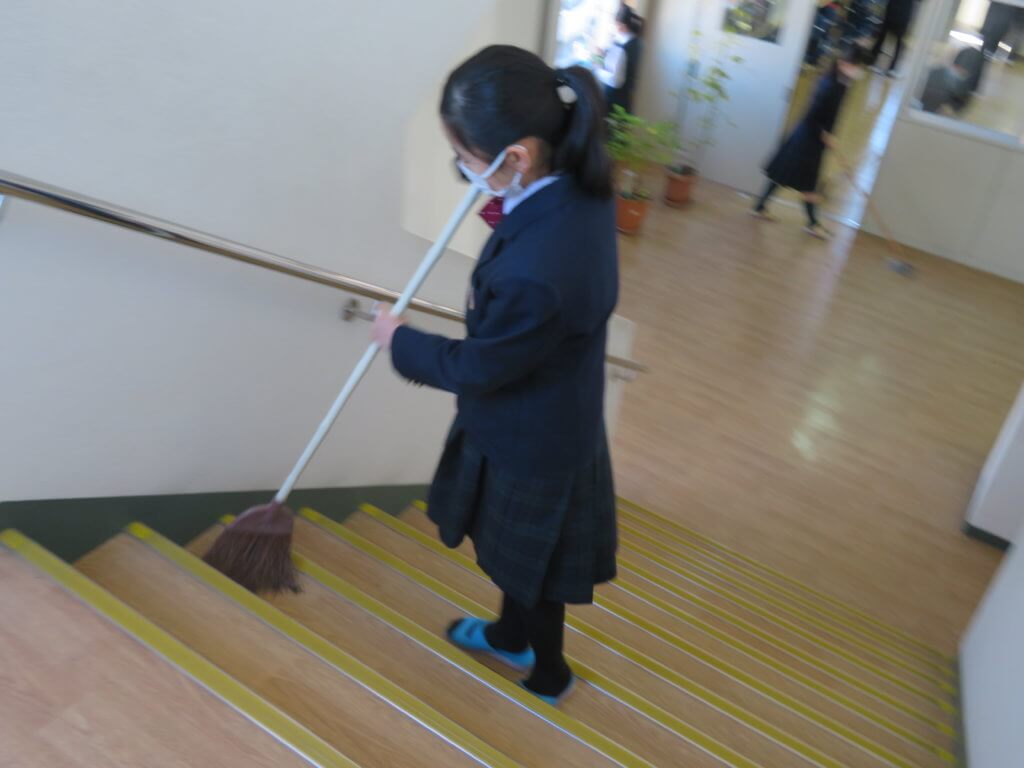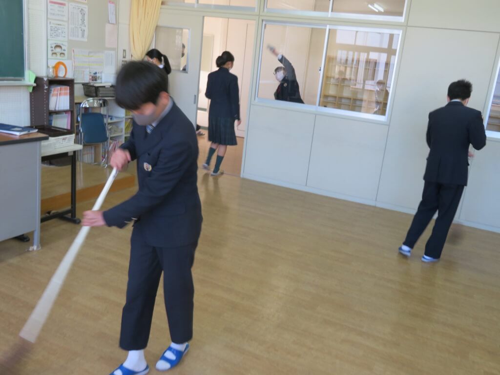 昼食後は全校生徒で清掃に取り組みます。各教室や廊下、中庭など校舎内を毎日清掃します。 清掃場所ごとにみんなで協力しながら清掃していました。明日は各種委員会が行われます。委員会活動もしっかりと行っていきましょう。