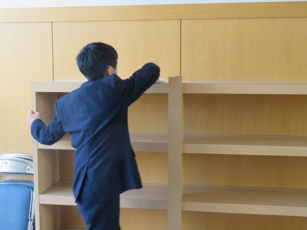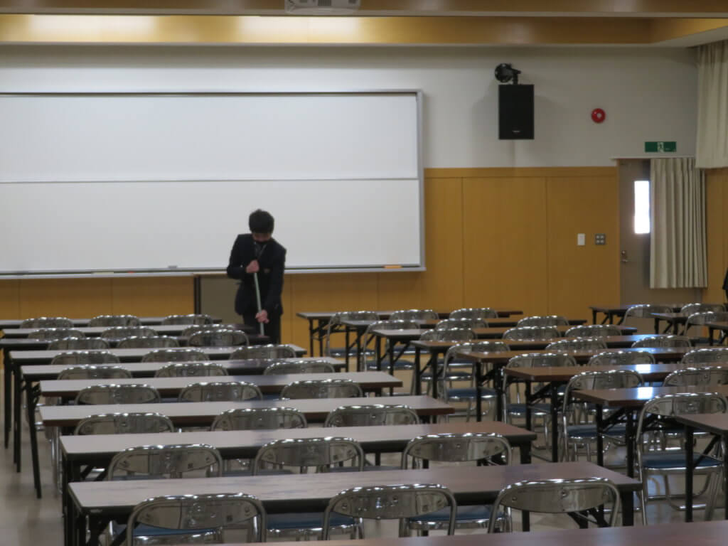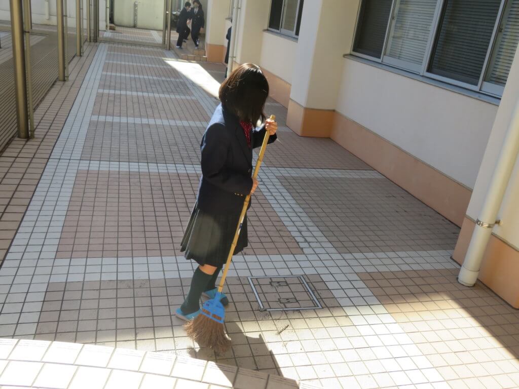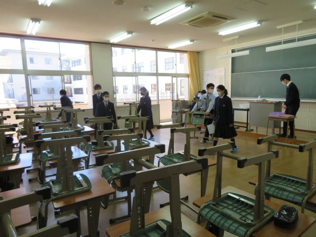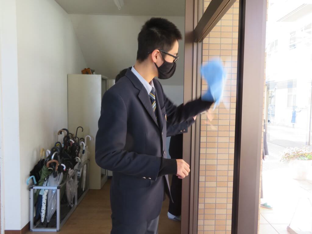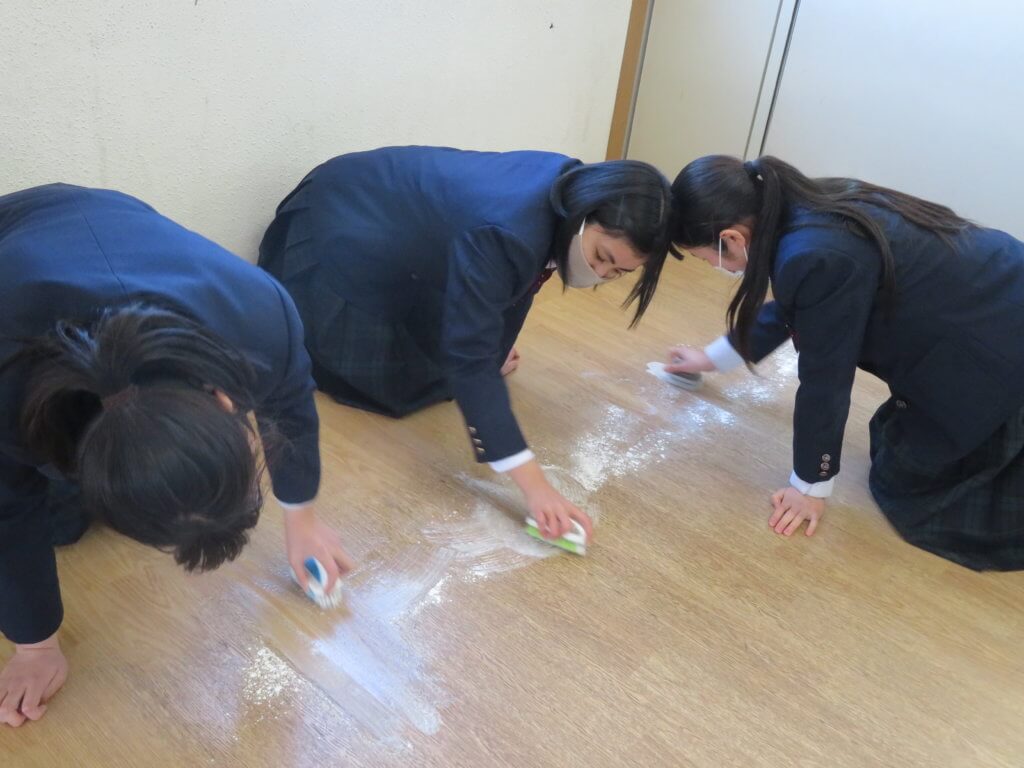 昼食後は全校生徒で清掃に取り組みます。各教室や廊下、中庭など校舎内を毎日清掃します。 清掃場所ごとにみんなで協力しながら清掃していました。明日は各種委員会が行われます。委員会活動もしっかりと行っていきましょう。