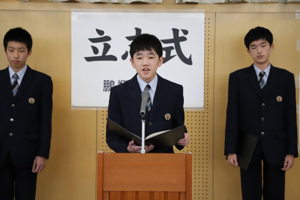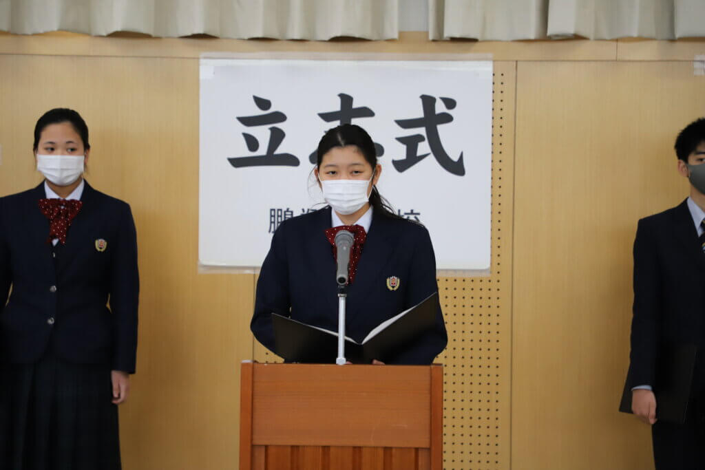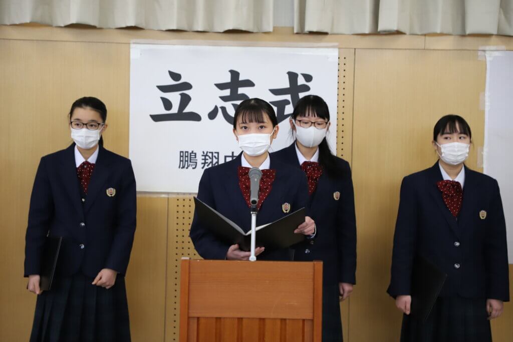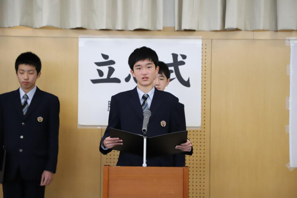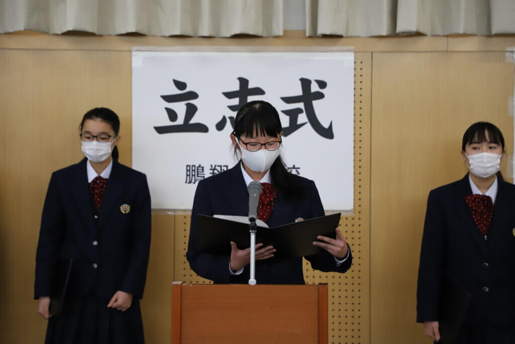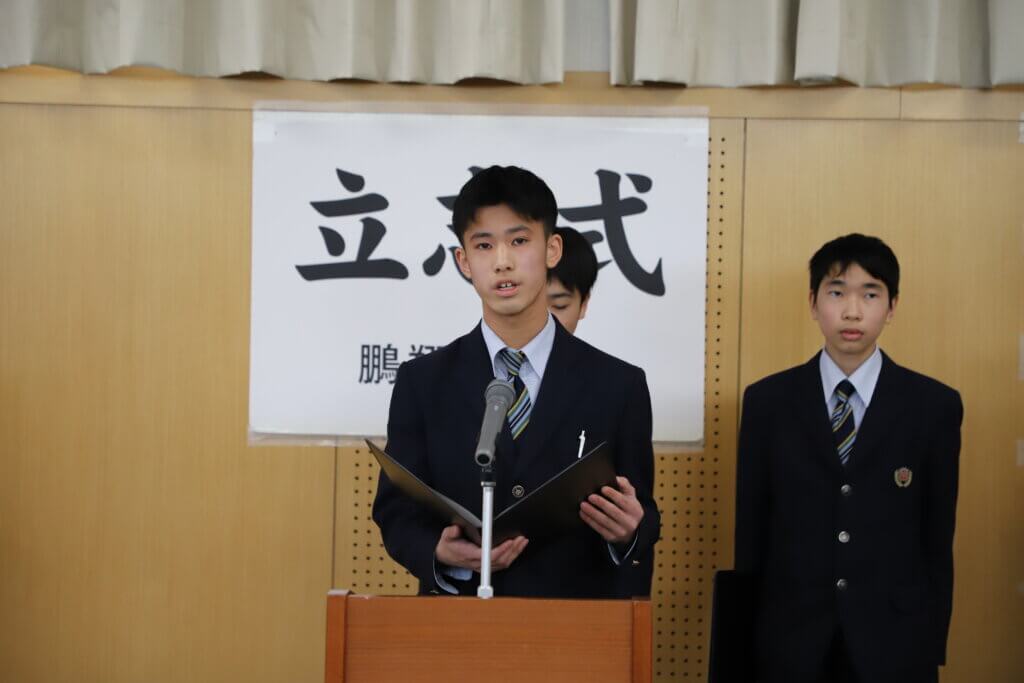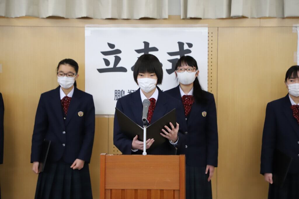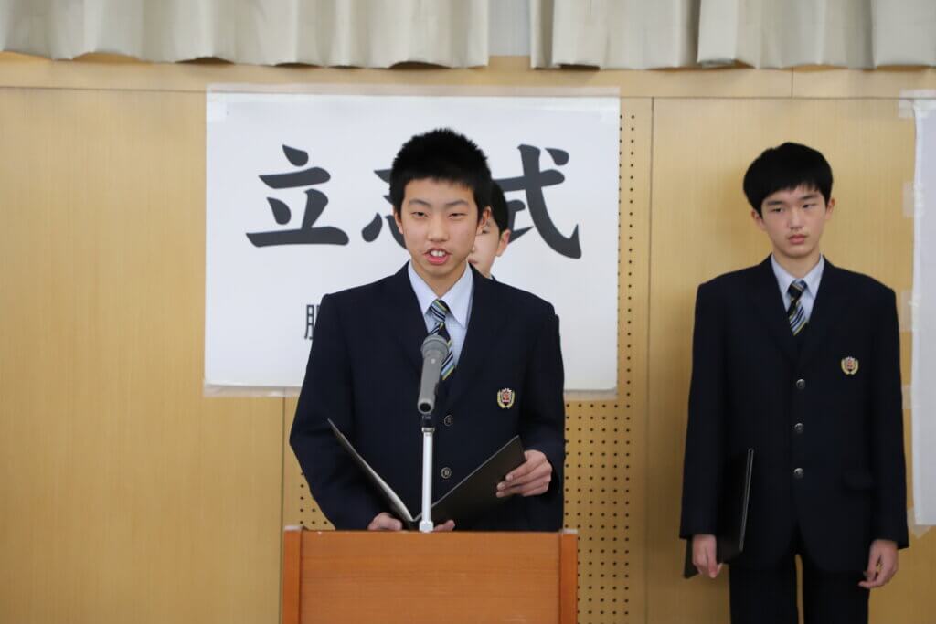 先日行われた立志式の様子です。 伴奏 J2B平田萌音さん(宮崎小出身)指揮 J2A赤池瑛仁さん(宮﨑南小出身) J2Aの立志宣言の様子です。それぞれの思いを堂々と発表していました。 次回はJ2Bの立志宣言の様子をお届けします。