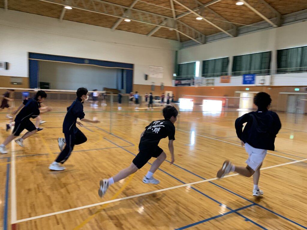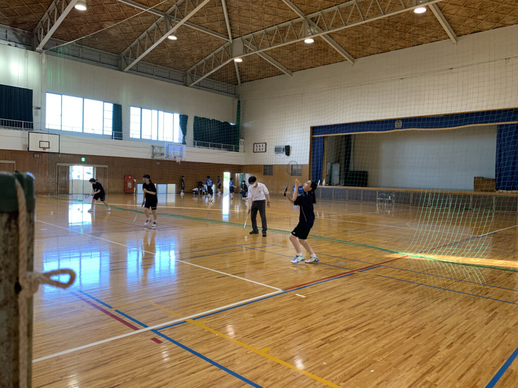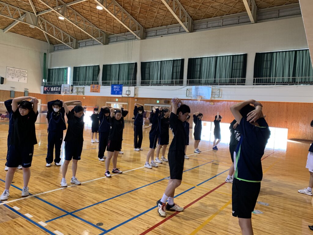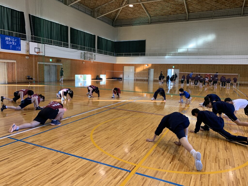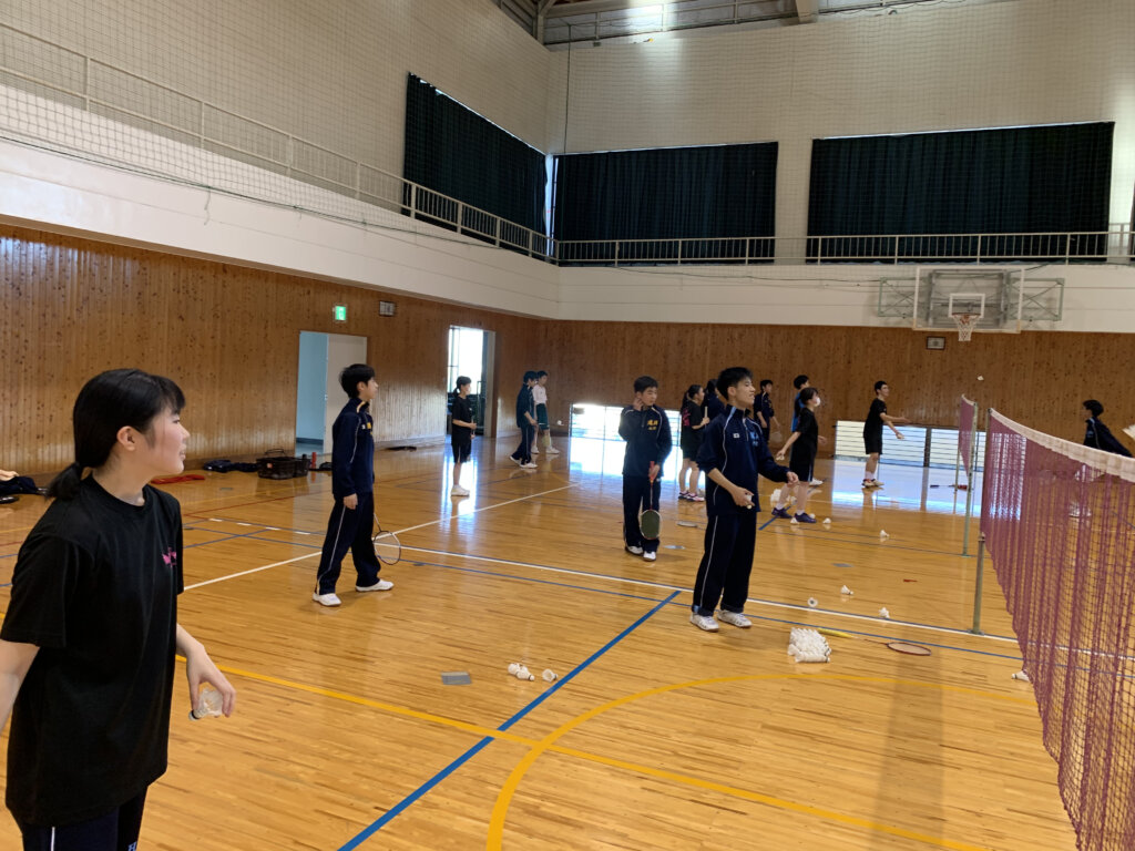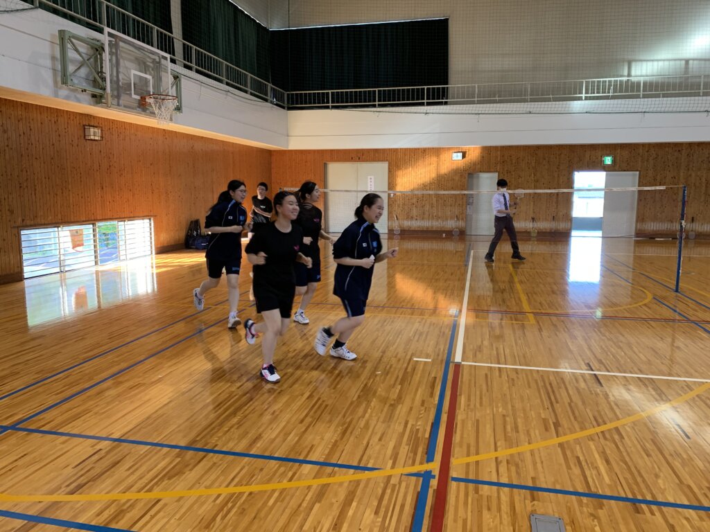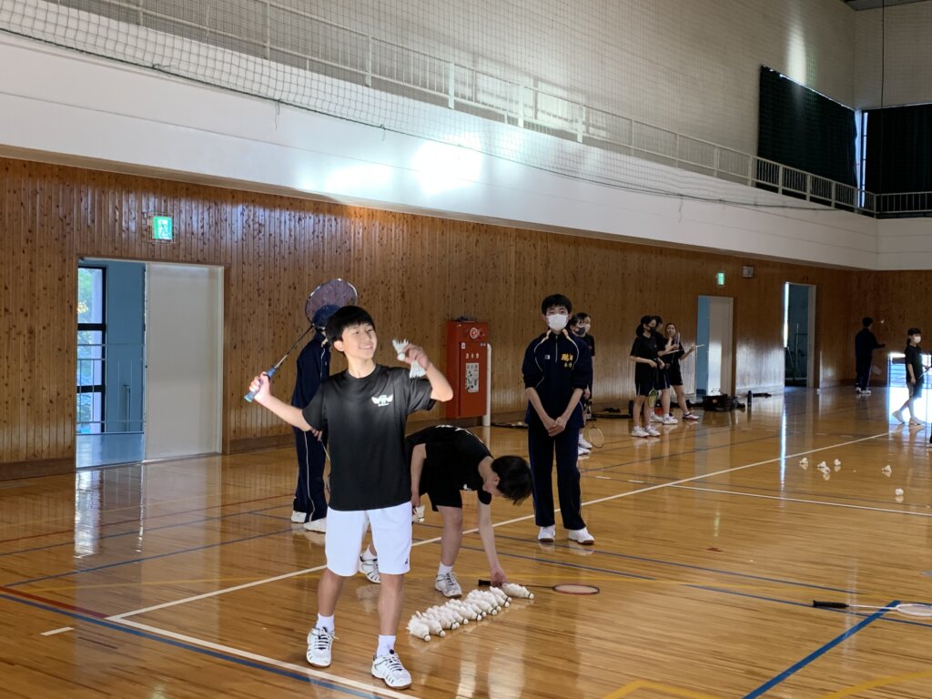 体育館では、バドミントン部とバスケットボール部が活動しています。両部活とも、準備運動ウォーミングアップを十分行い、それぞれ今日の練習メニューに取り掛かっていました。