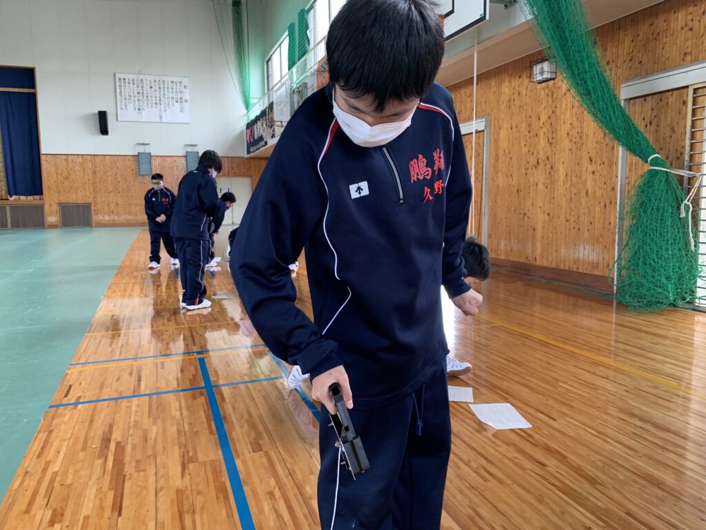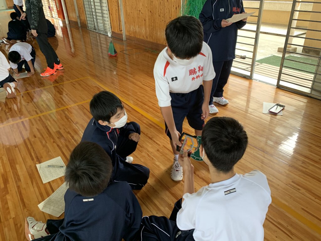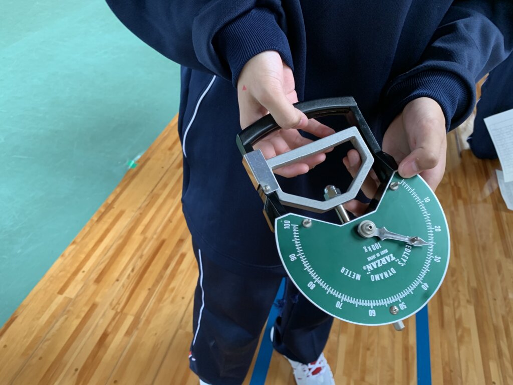 本日5限目、体育館ではJ1生が新体力テストを行っていました。自分自身の体力を把握し、健康増進、体力向上への関心を高めることを目的としています。まずは、握力測定の様子です。