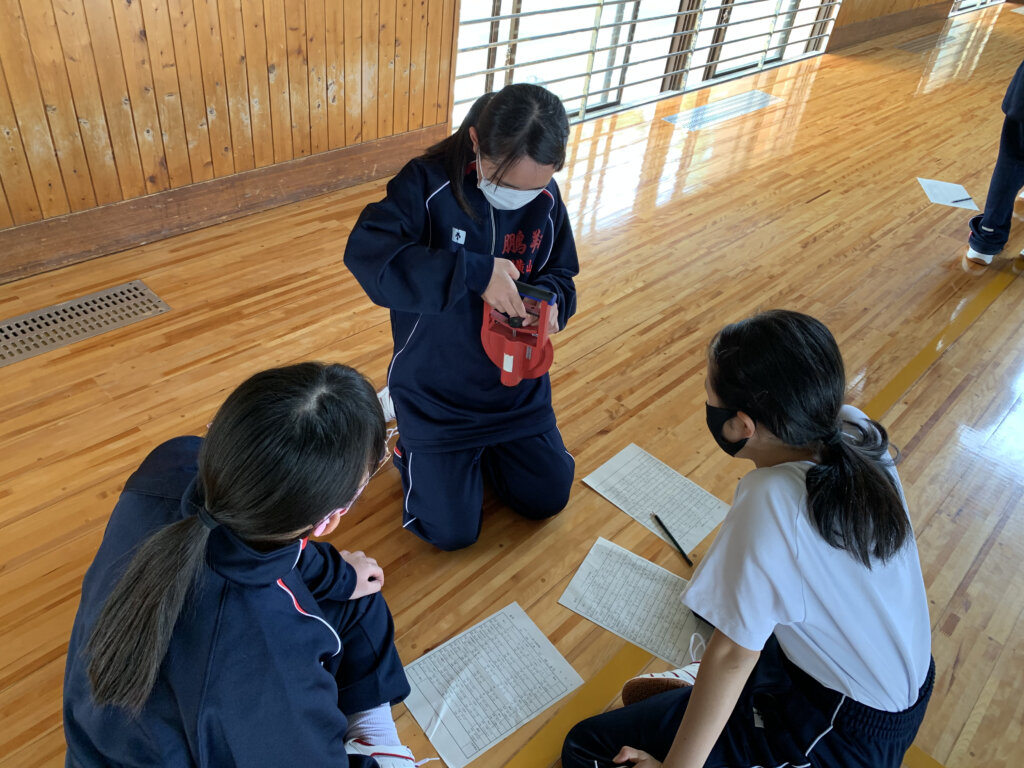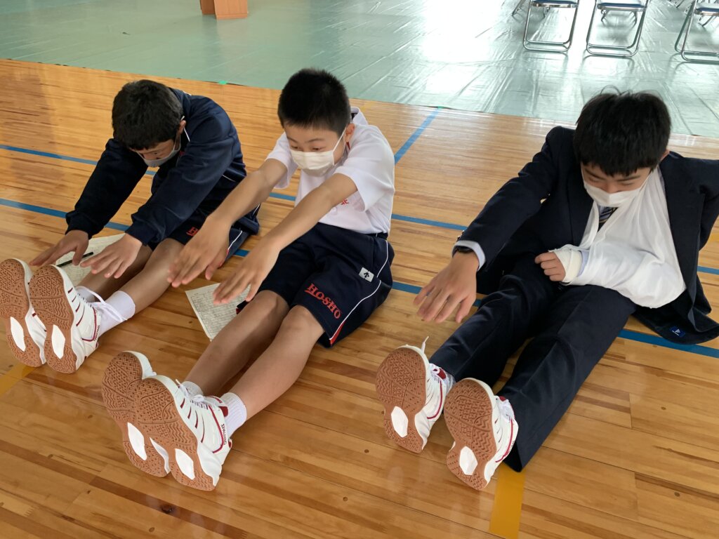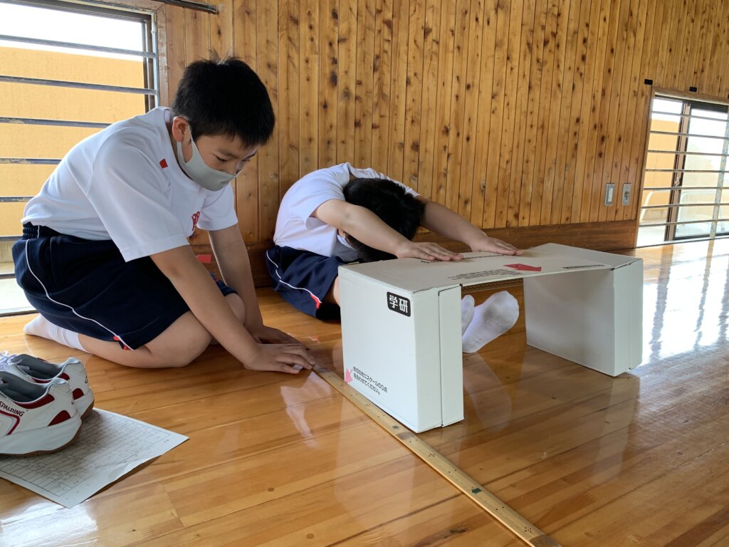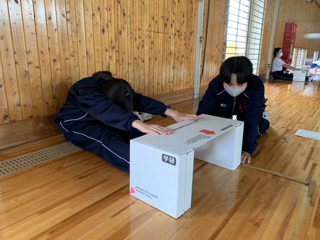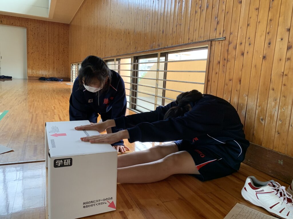 次に、座ったまま膝を曲げずに前屈する長座体前屈の様子です。測定前に練習をしている生徒もいました‼︎