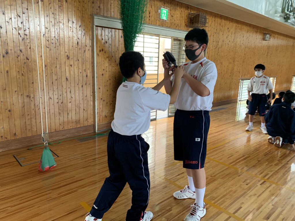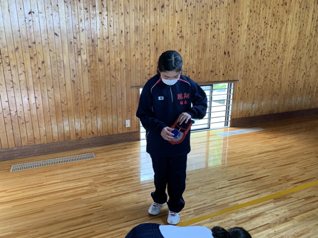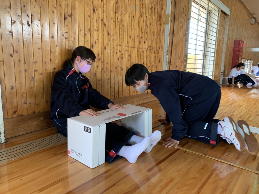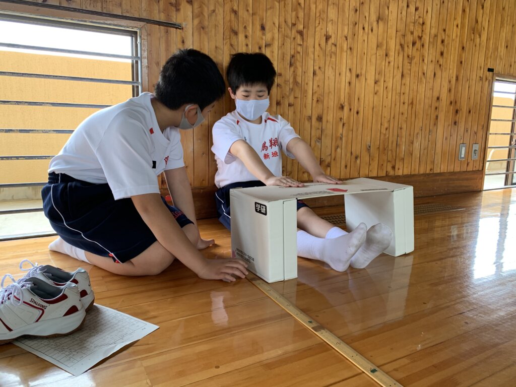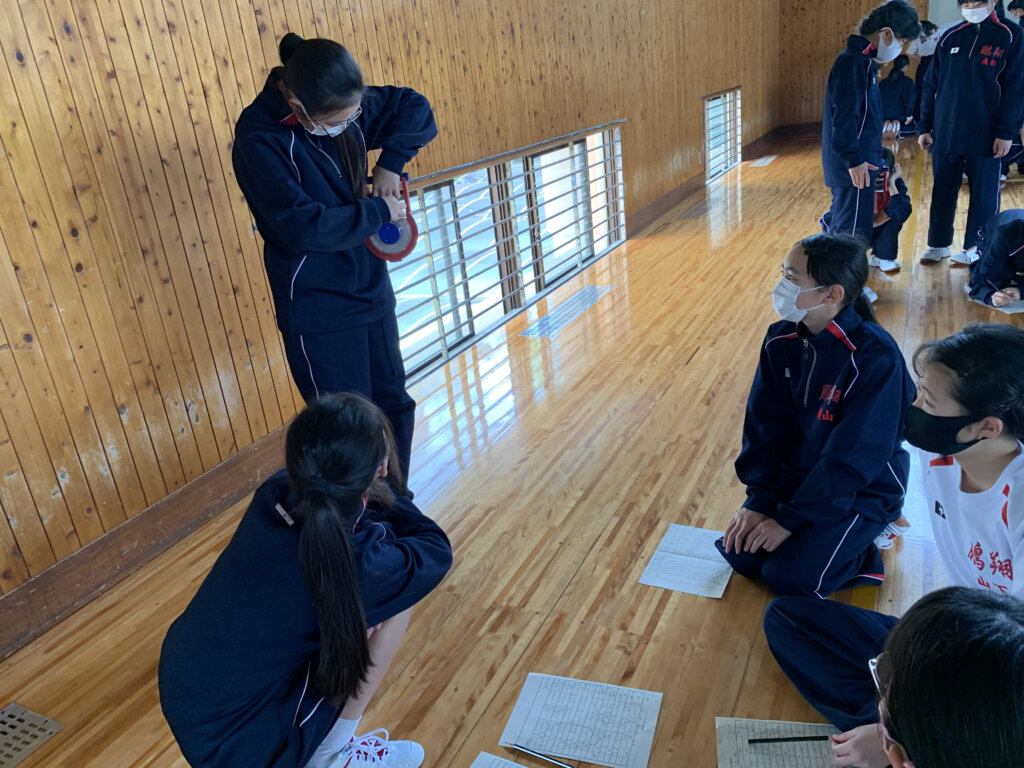 次に、座ったまま膝を曲げずに前屈する長座体前屈の様子です。測定前に練習をしている生徒もいました‼︎