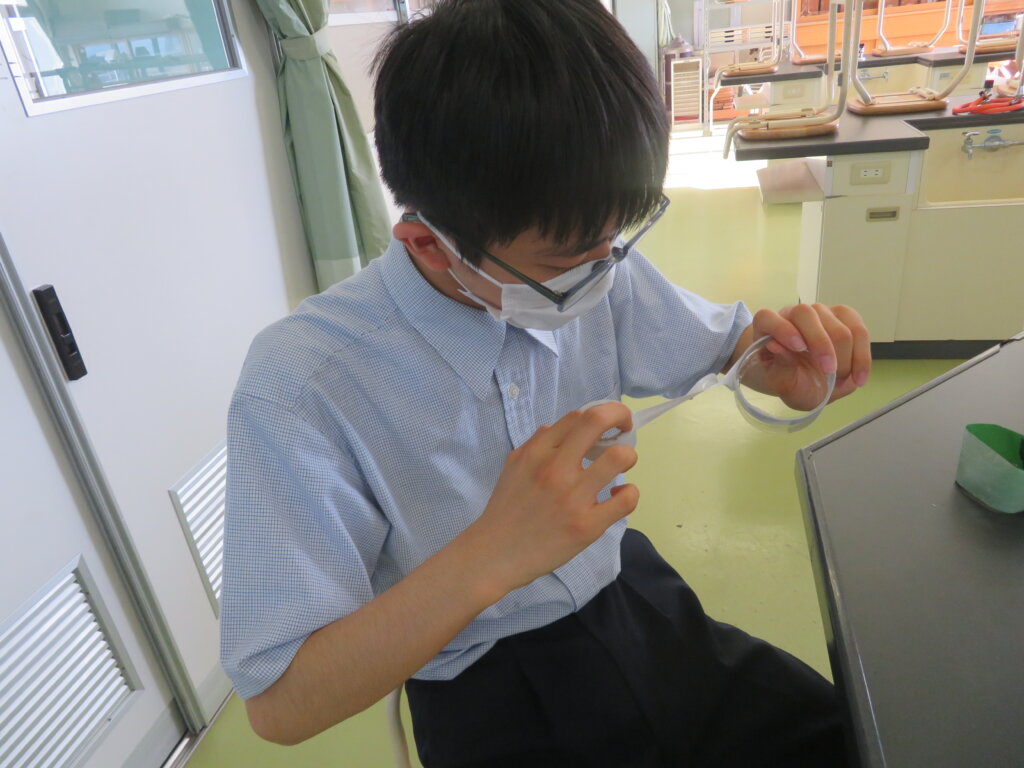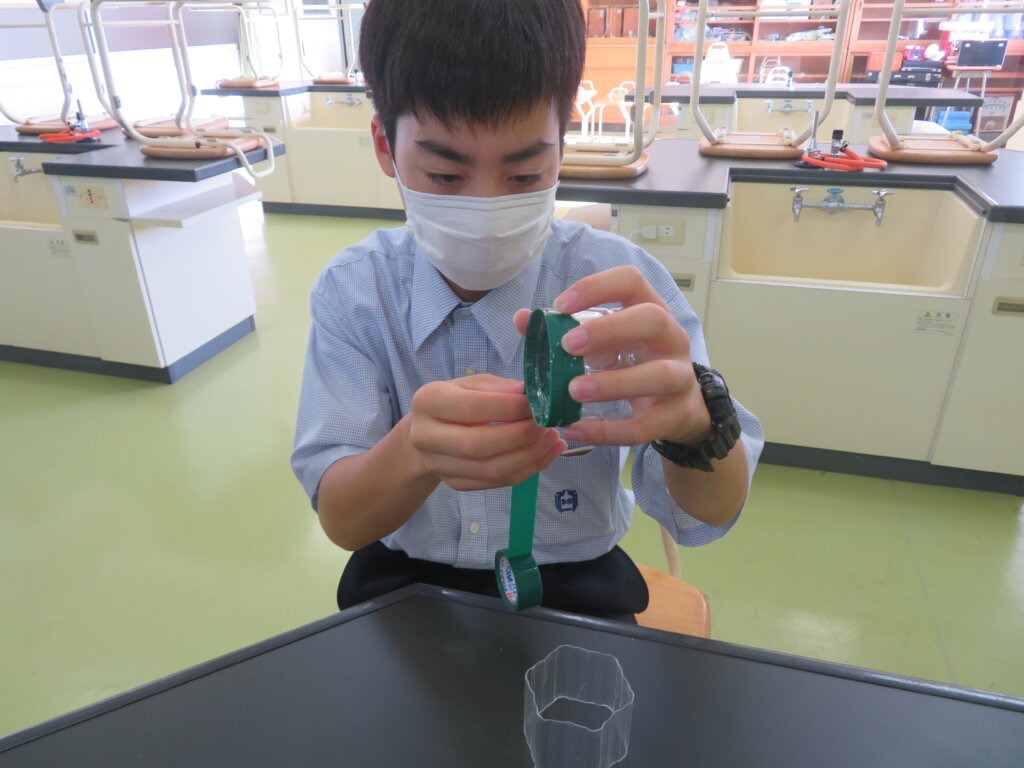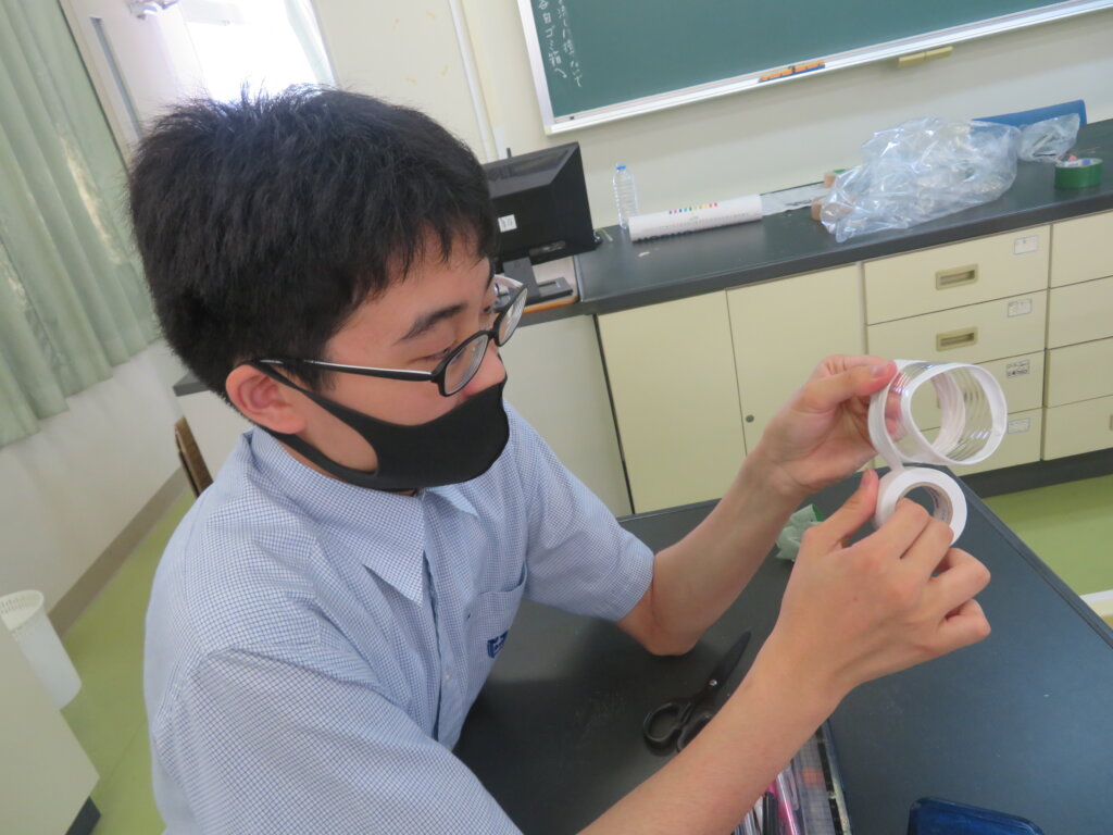 また、今日はサイエンス部の活動の様子を紹介します。先日の部活動で、ペットボトルジャイロを作り、どれだけ飛ぶか競い合っていました。