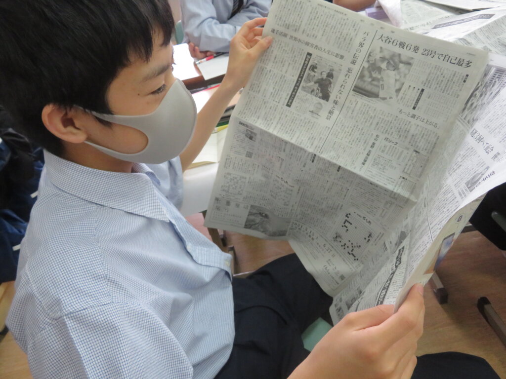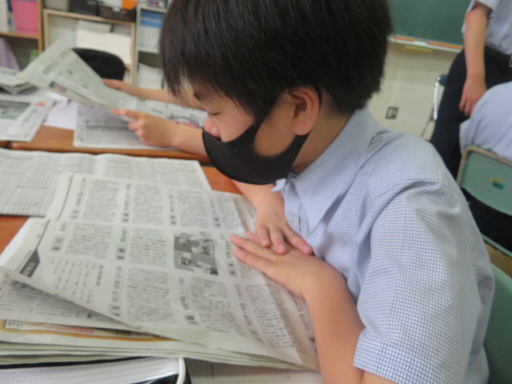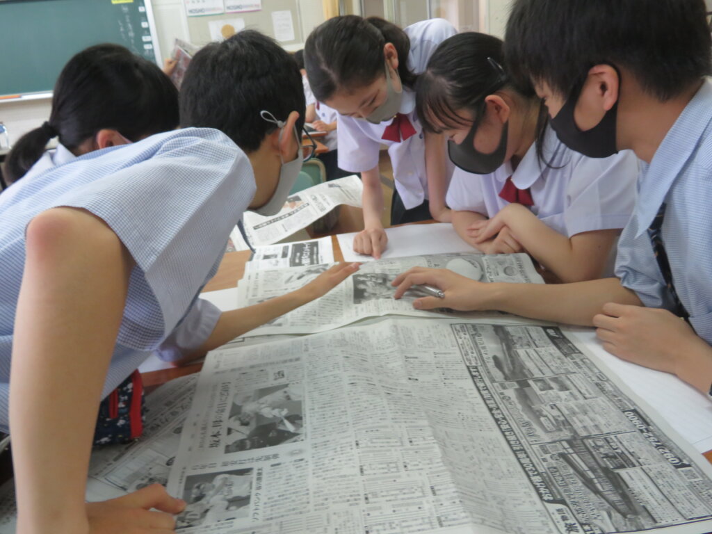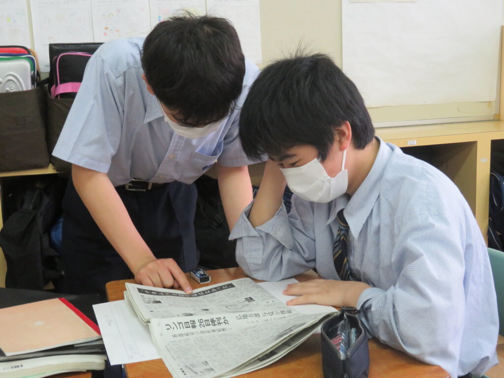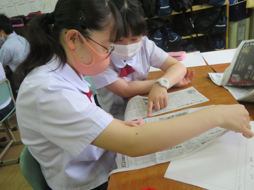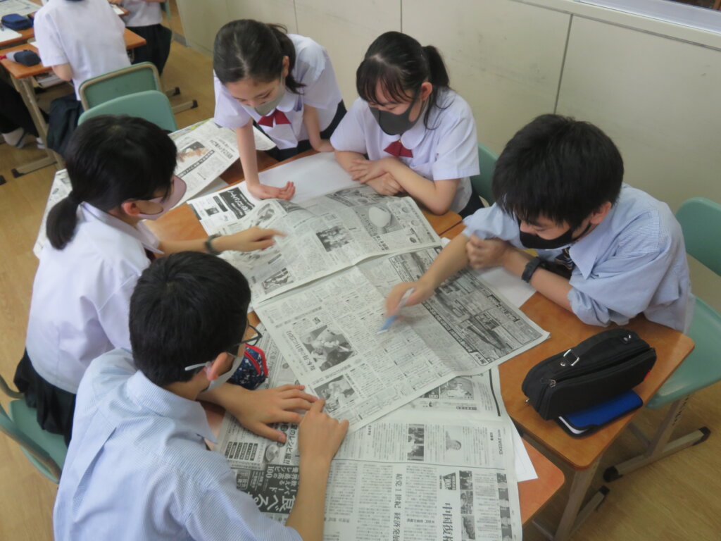 今日は班ごとに新聞を読み、記事の内容などを話していました。その後それぞれが気になった記事を1つ選び、記事の要約や感想を1枚にまとめています。