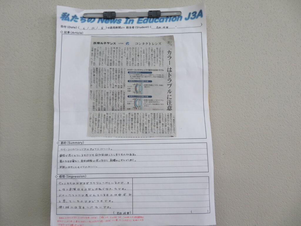 このNIE活動を通して様々なニュースを知り自分の意見を明確に記述できるようになりましょう。