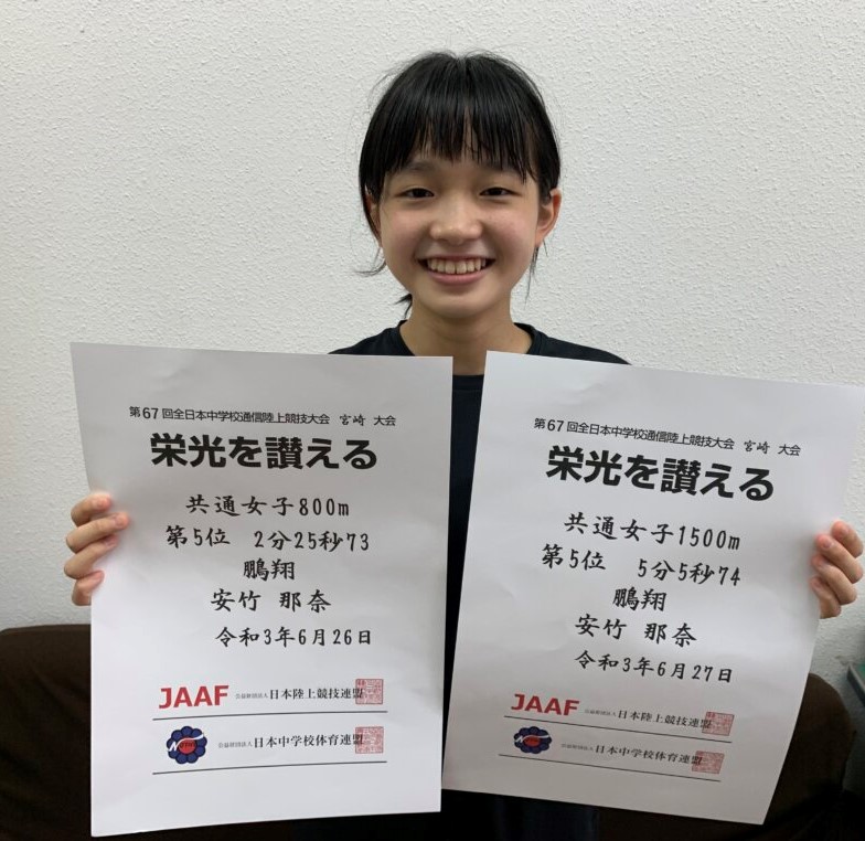 第67回全日本中学校通信陸上競技大会へ、J2-A安竹那奈さんが出場しました。見事、5位!!おめでとうございます!次の大会に向け、練習頑張ってください!