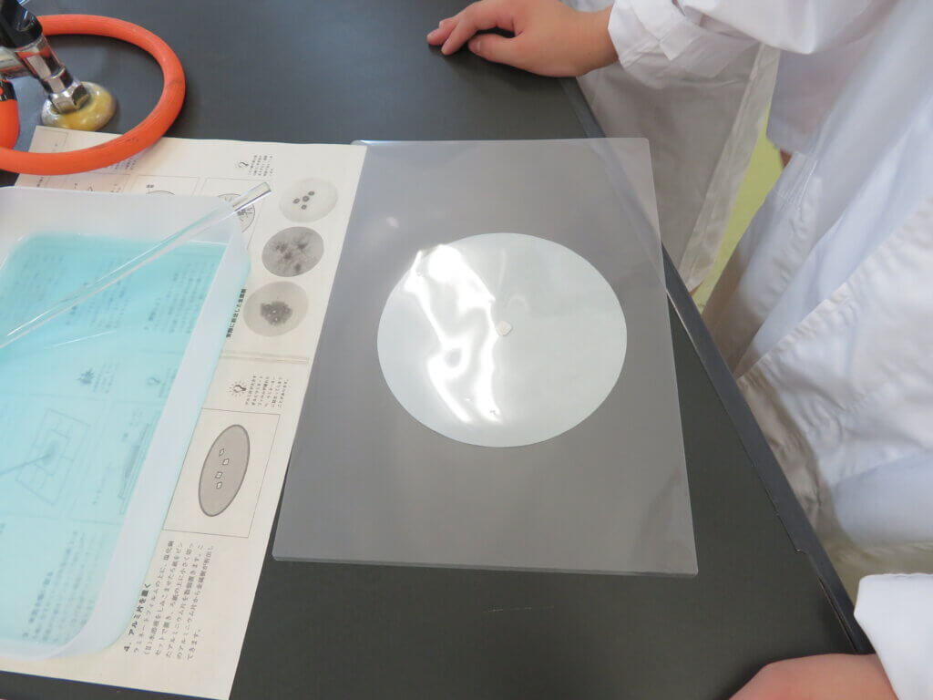 硫酸銅(Ⅱ)水溶液を浸したろ紙にアルミニウム片を置き、金属樹を生成させる実験を行いました。