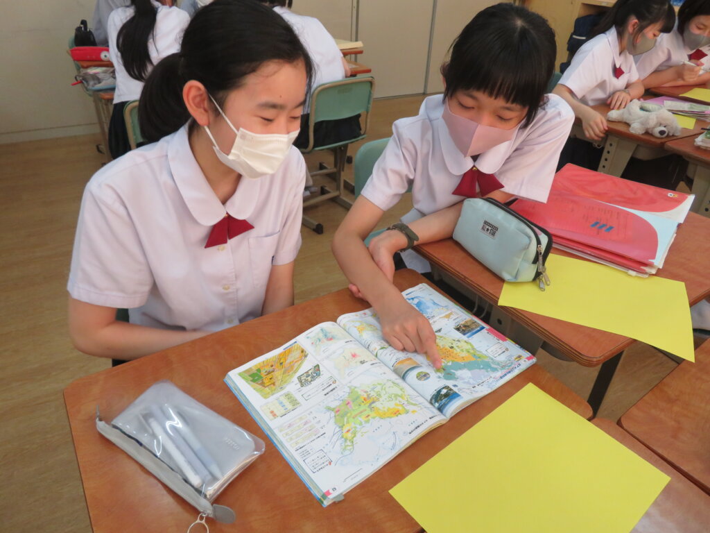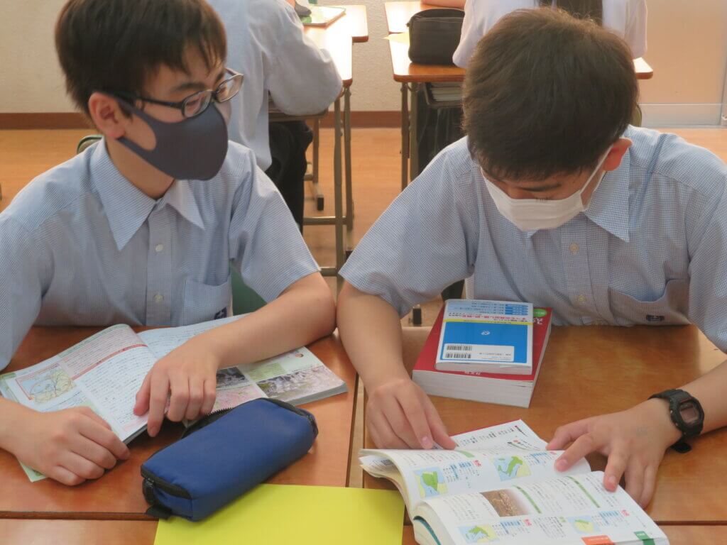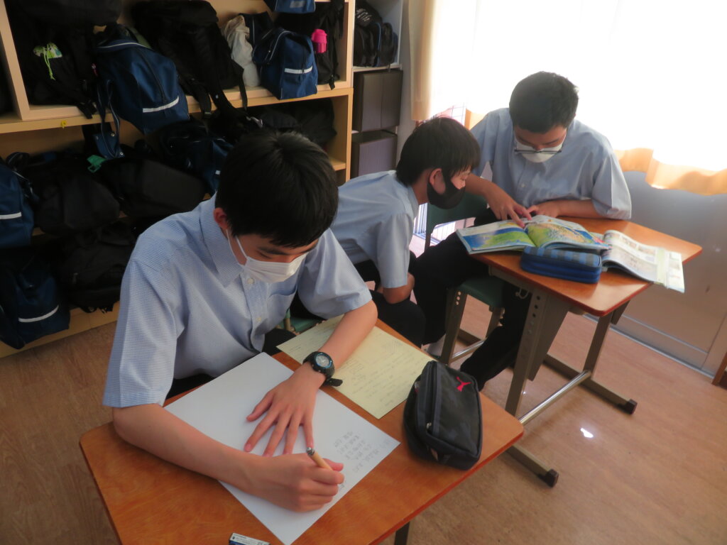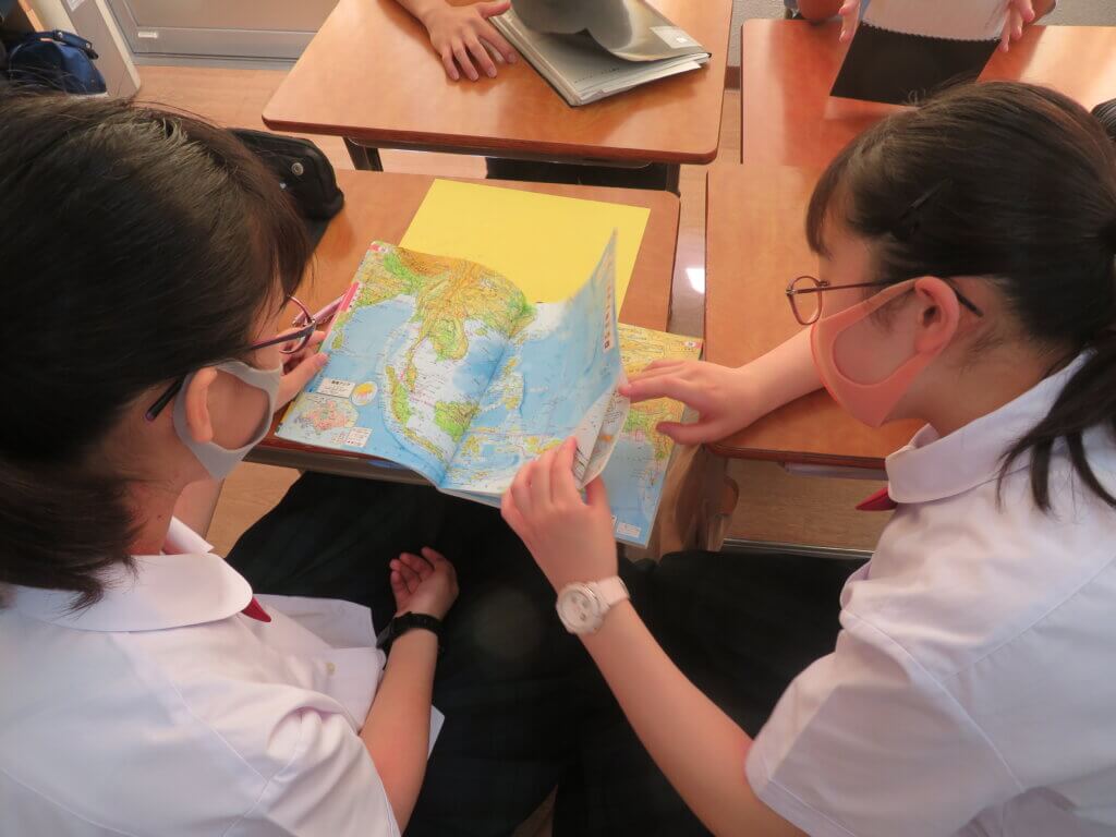 J2生は、何やら地図帳を広げ、調べ物をしていました。文化発表会の準備をしているようです。