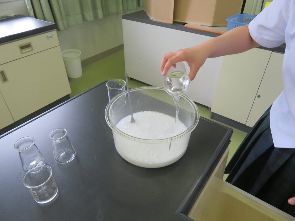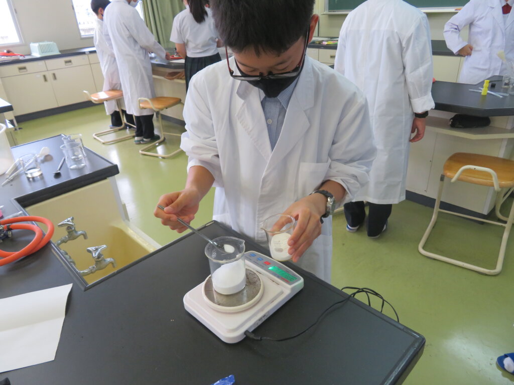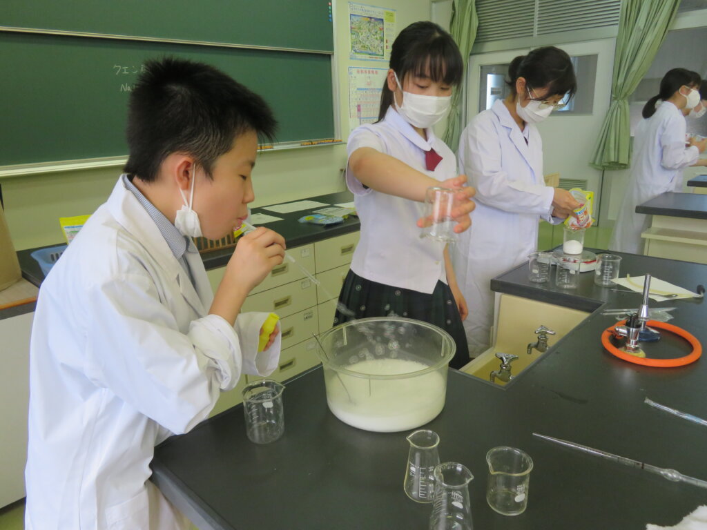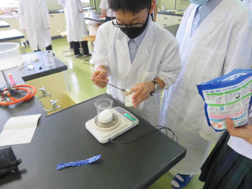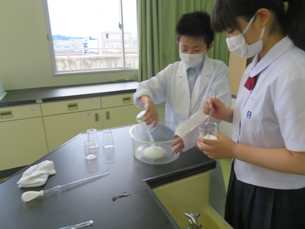 昨日サイエンス部では、炭酸水素ナトリウム(重曹)とクエン酸に水を加え、二酸化炭素を発生させる実験を行いました。吸熱反応を手のひらで体験し、冷たくなることを感じたようです。
