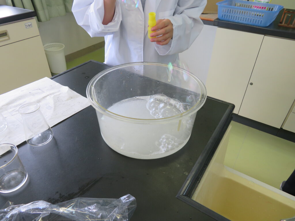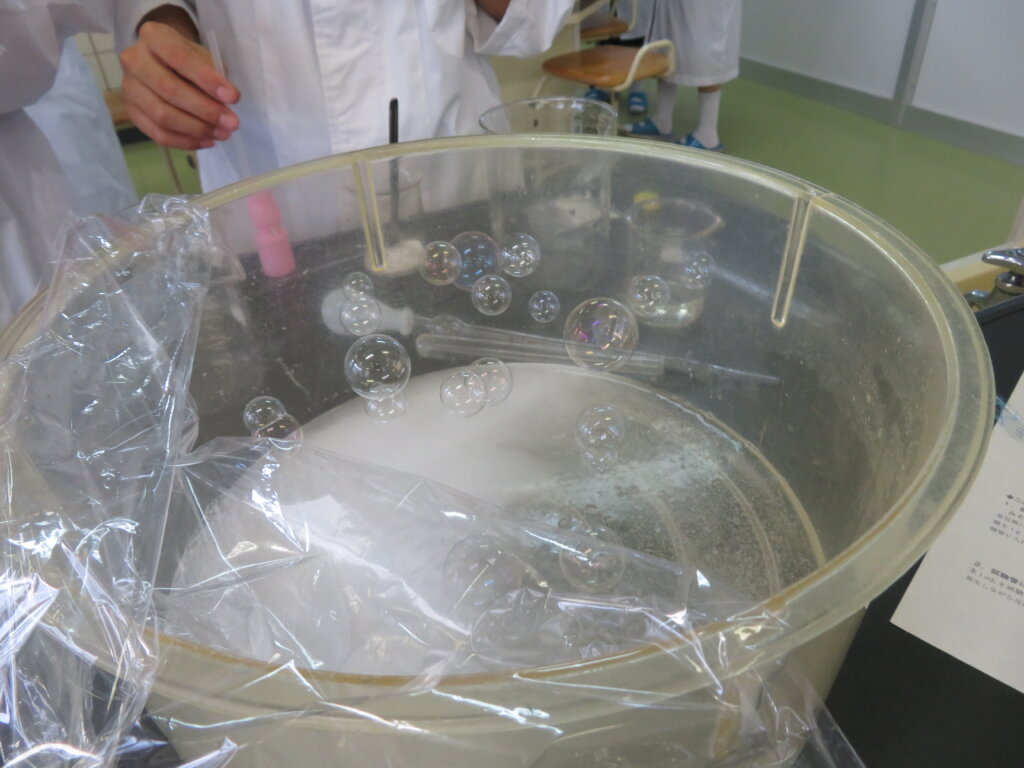 また、二酸化炭素を溜めた容器の上にシャボン玉をのせると、シャボン玉が下まで落ちず、浮いた状態になることを確認しました。これは、二酸化炭素が空気より重たいからです。