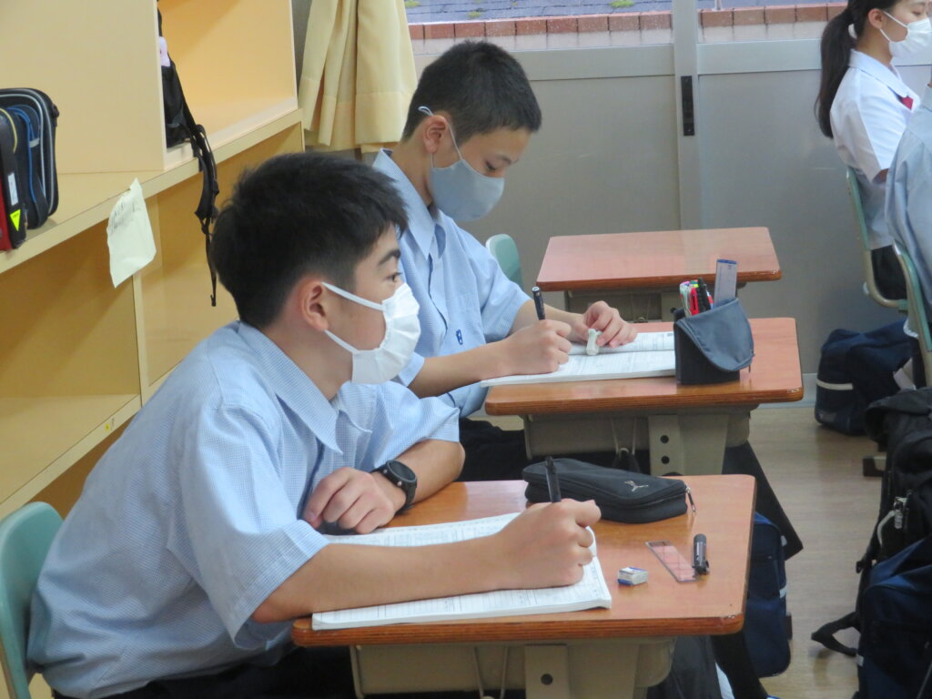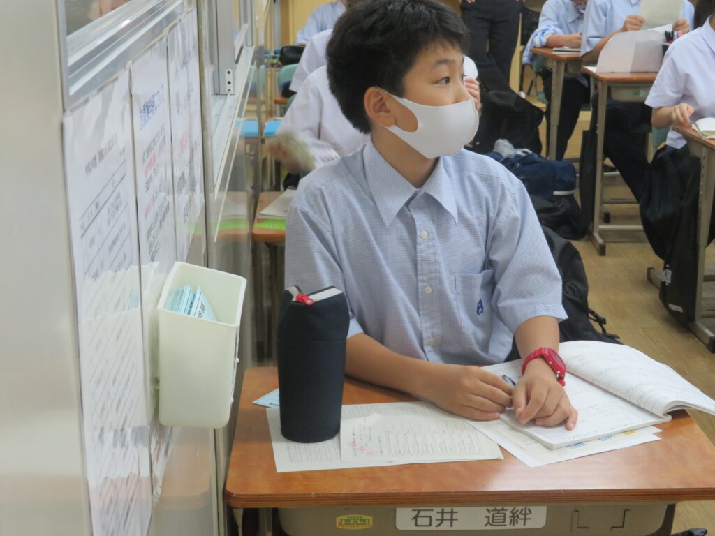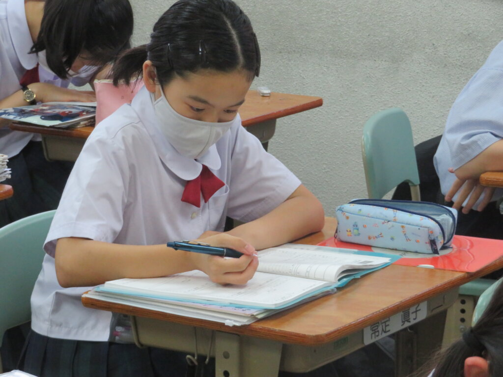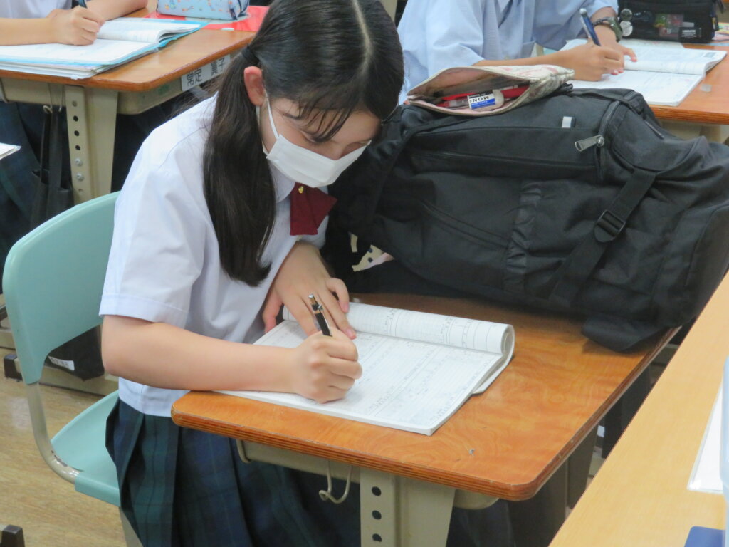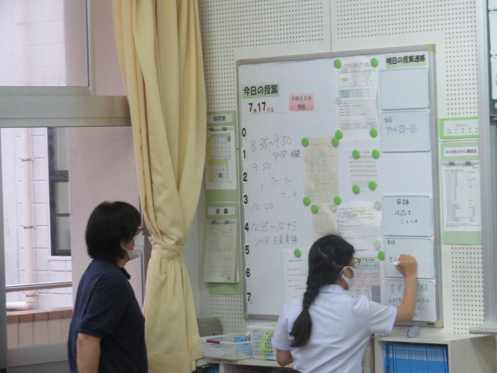帰りの会では、先生や係の生徒からいろんな伝達が行われます。生徒たちは忘れ物をしないよう、生活の記録に記入しています。