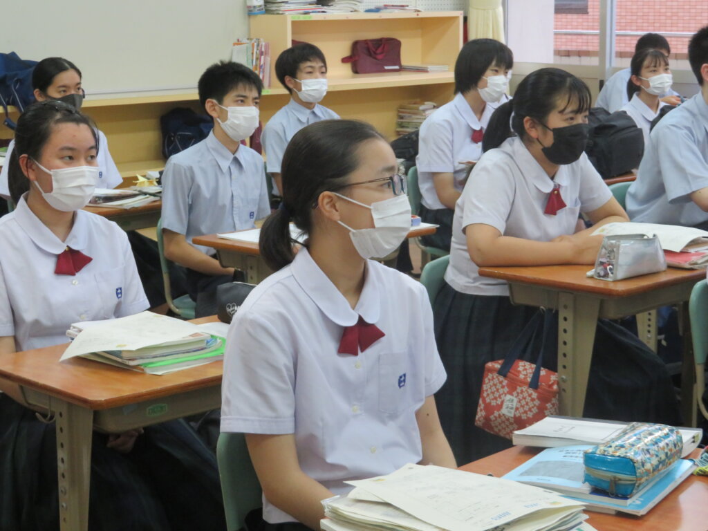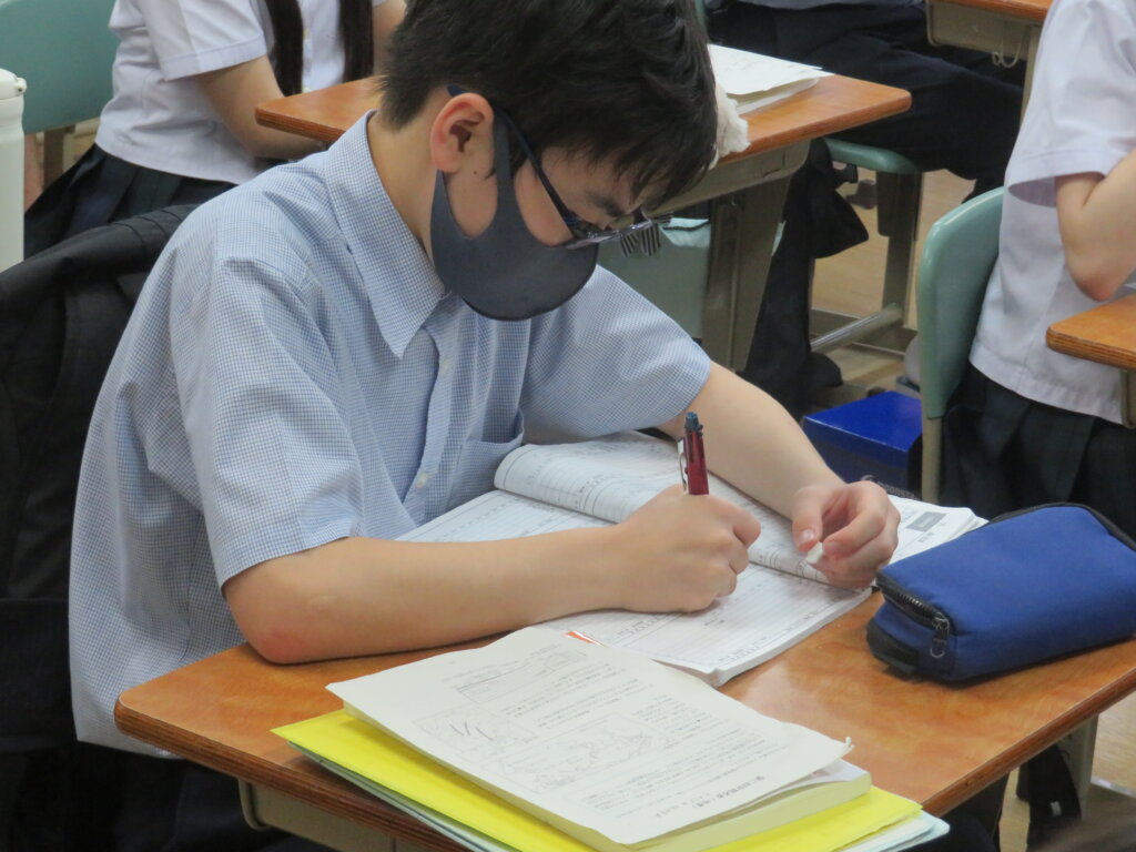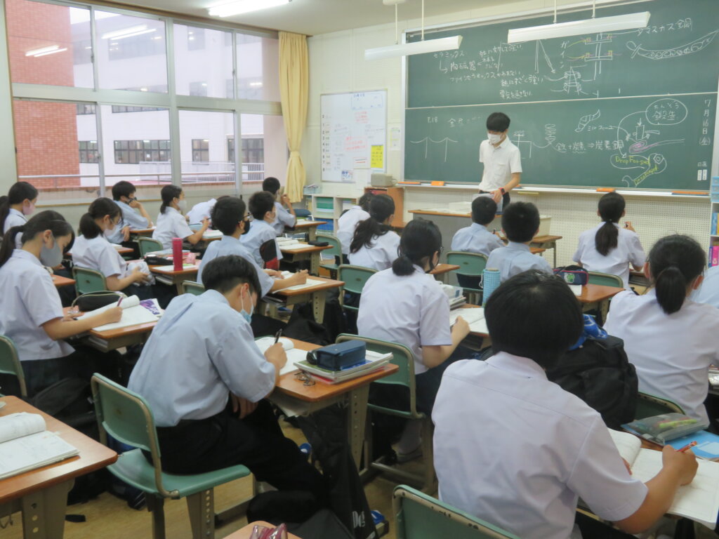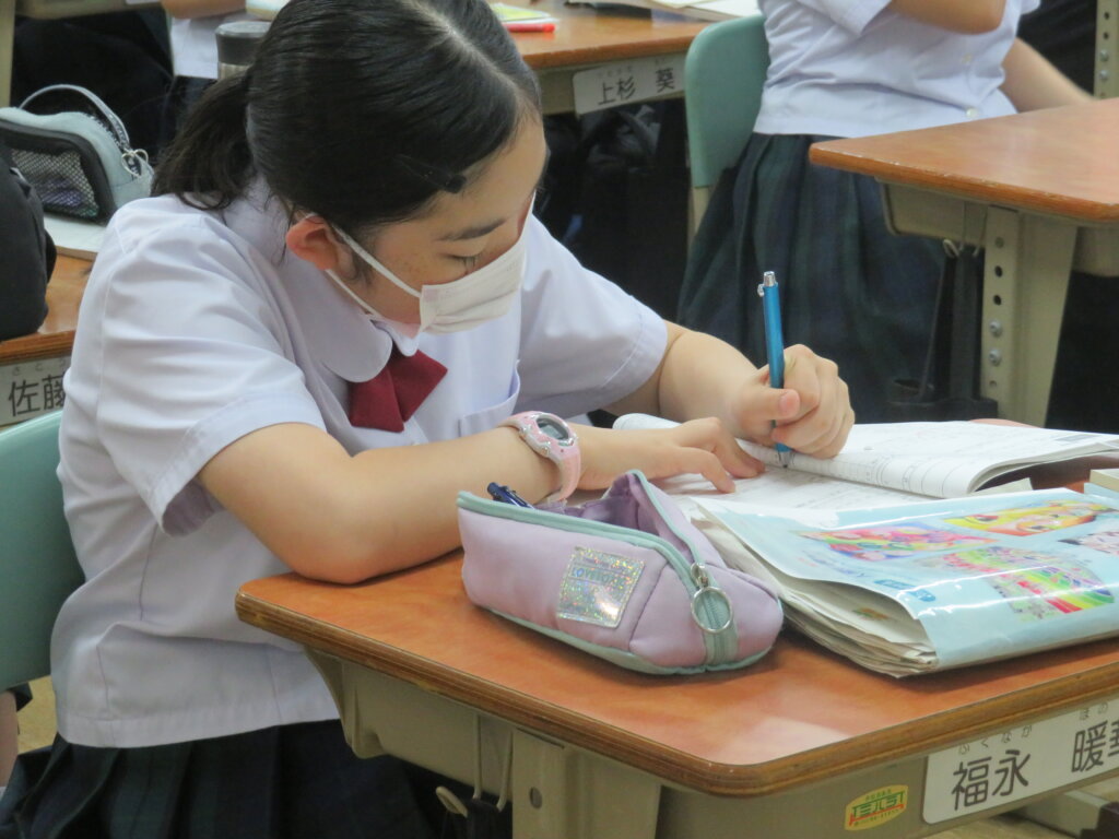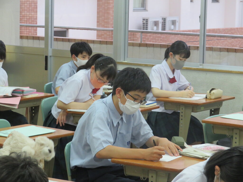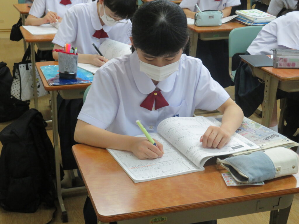 帰りの会では、先生や係の生徒からいろんな伝達が行われます。生徒たちは忘れ物をしないよう、生活の記録に記入しています。