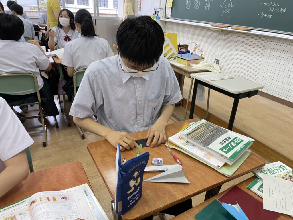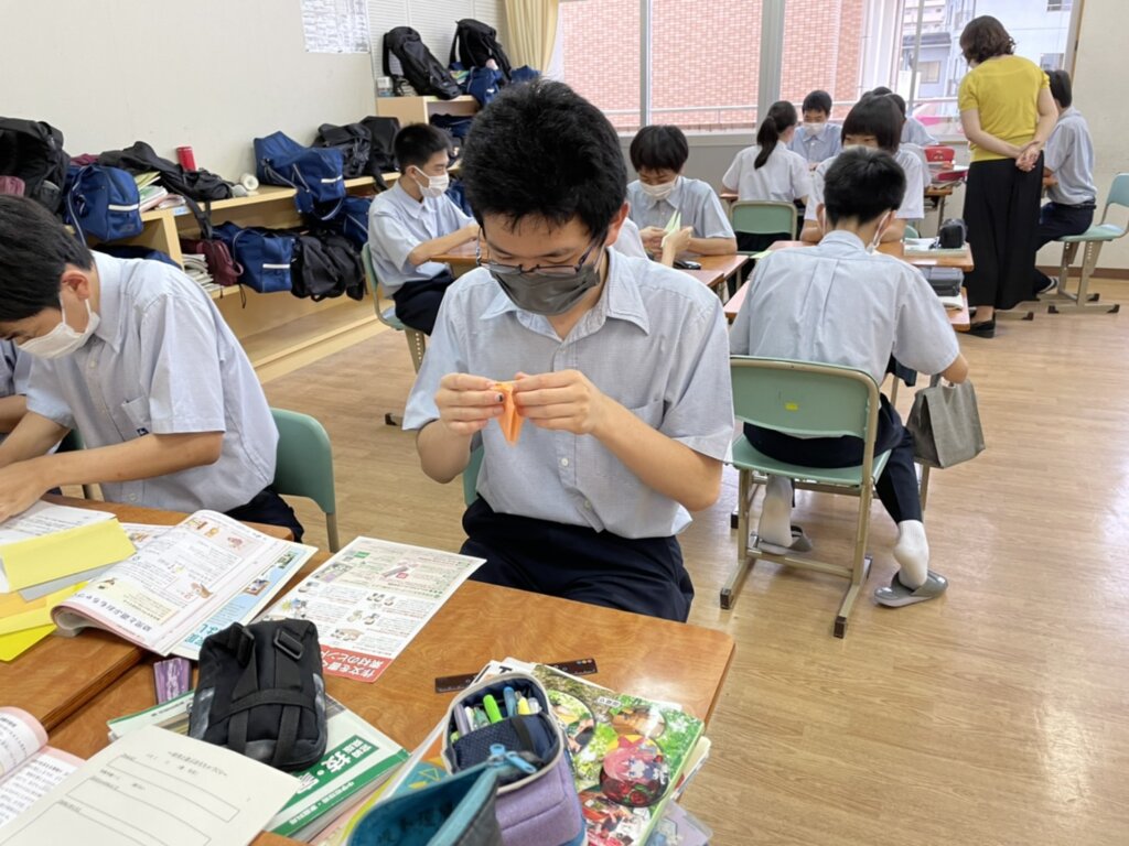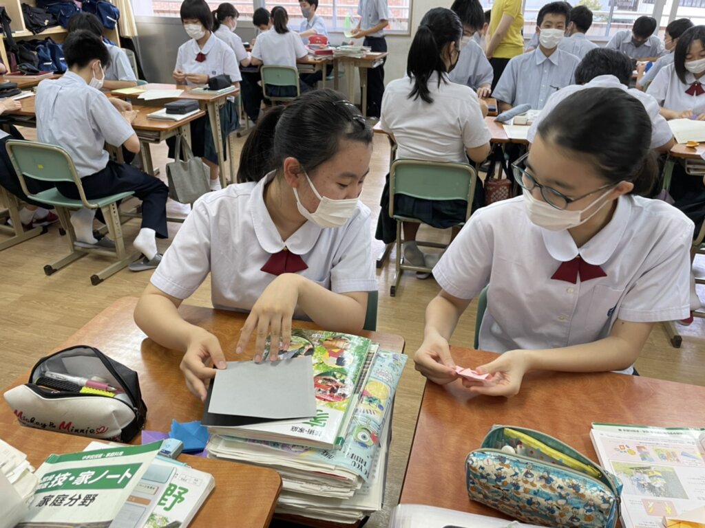 J3-Aの家庭科では、幼児と遊ぶおもちゃづくりをしていました。今回は、おりがみでおもちゃを作っていました。