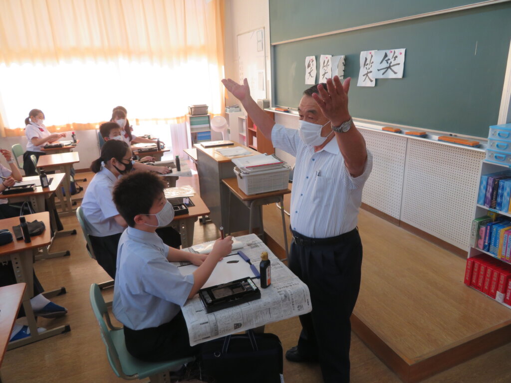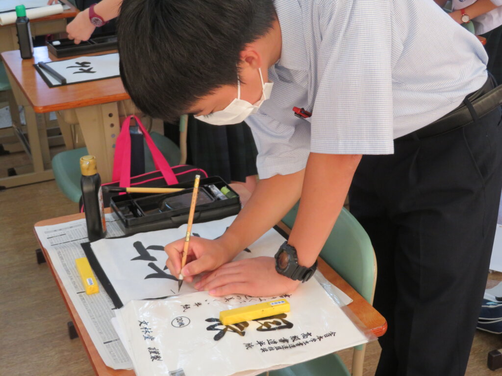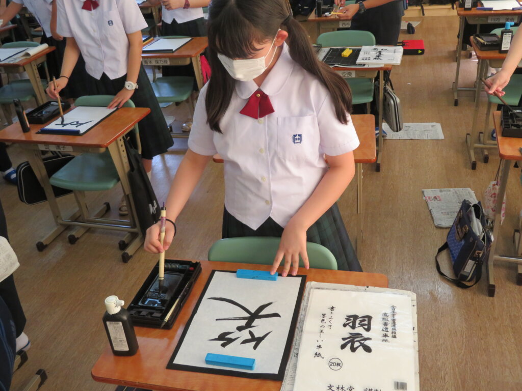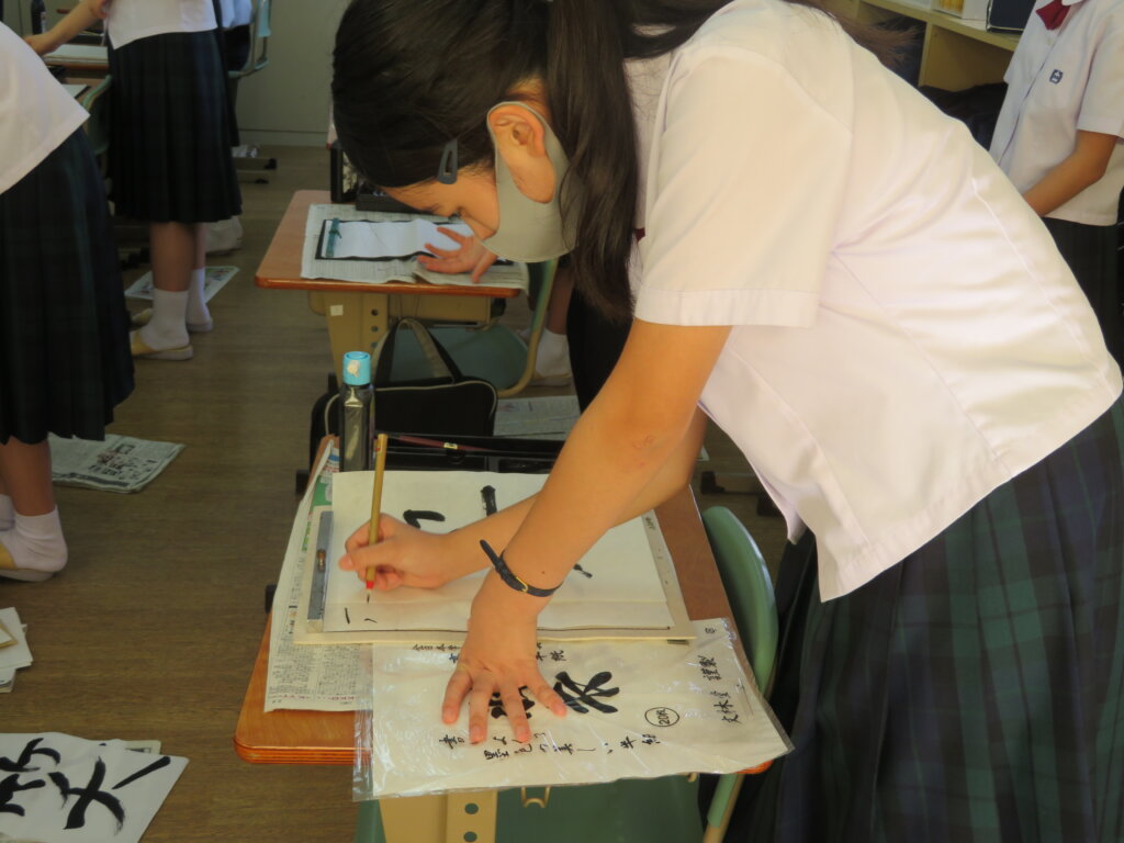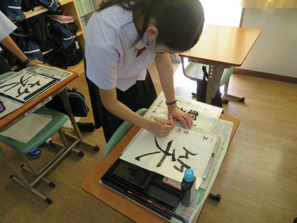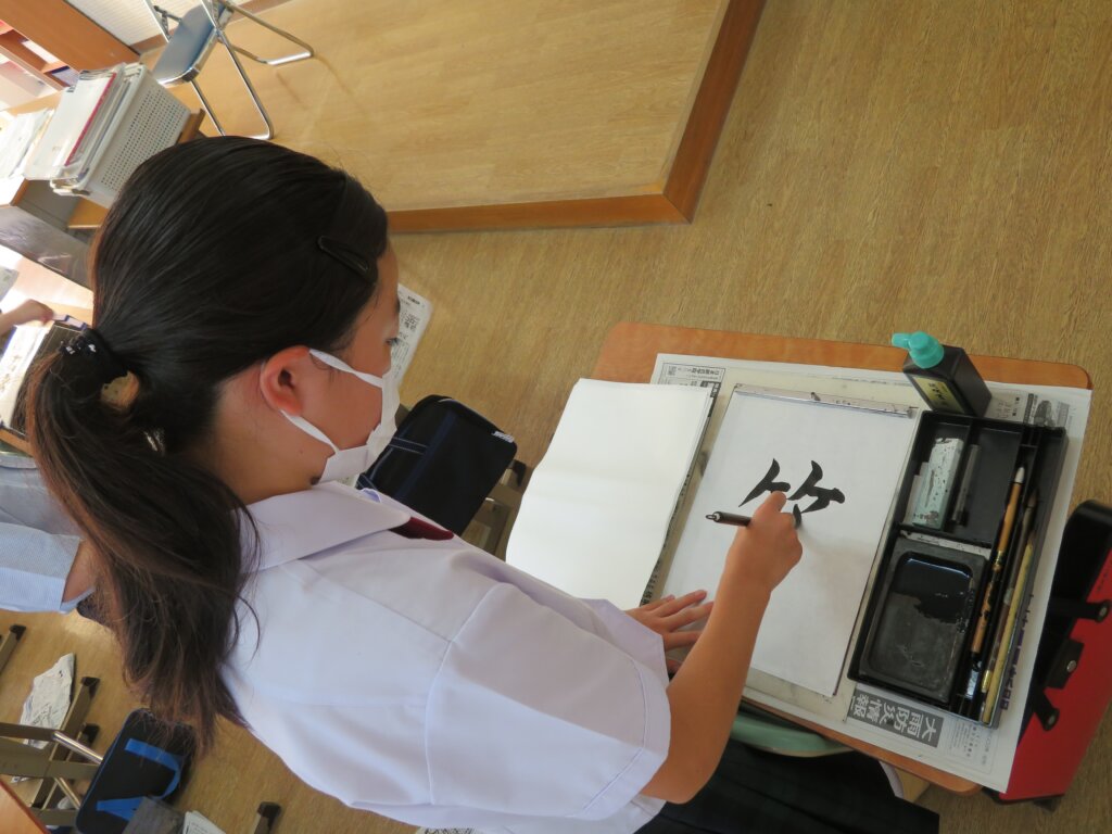 本日1限目、J1-Aは書道でした。年間テーマの「笑」を書いています。いつもは、姿勢や筆の持ち方等こまかく指導をしていただきますが、今日は遊び心をもち自分らしく楽しく書いてみよう!ということで、立って書いたり、筆の上を持ち書いたりしていました。