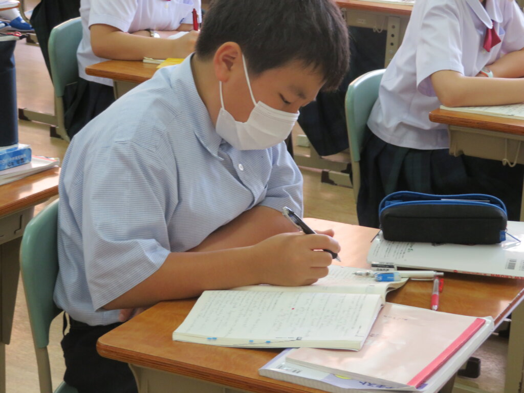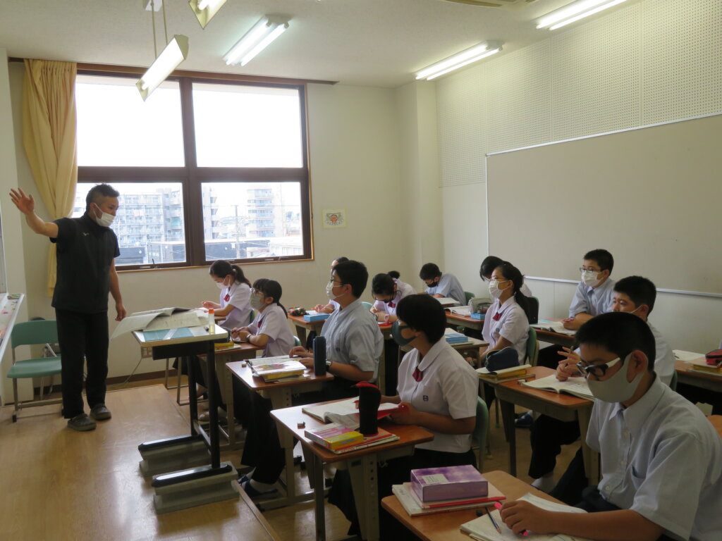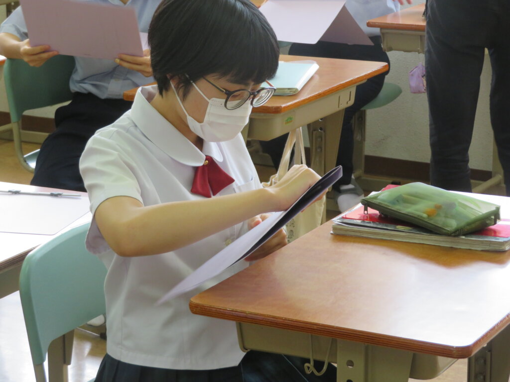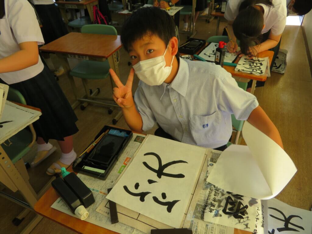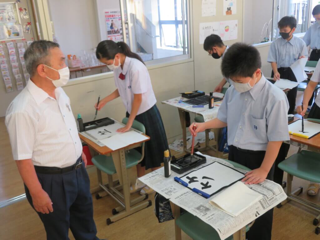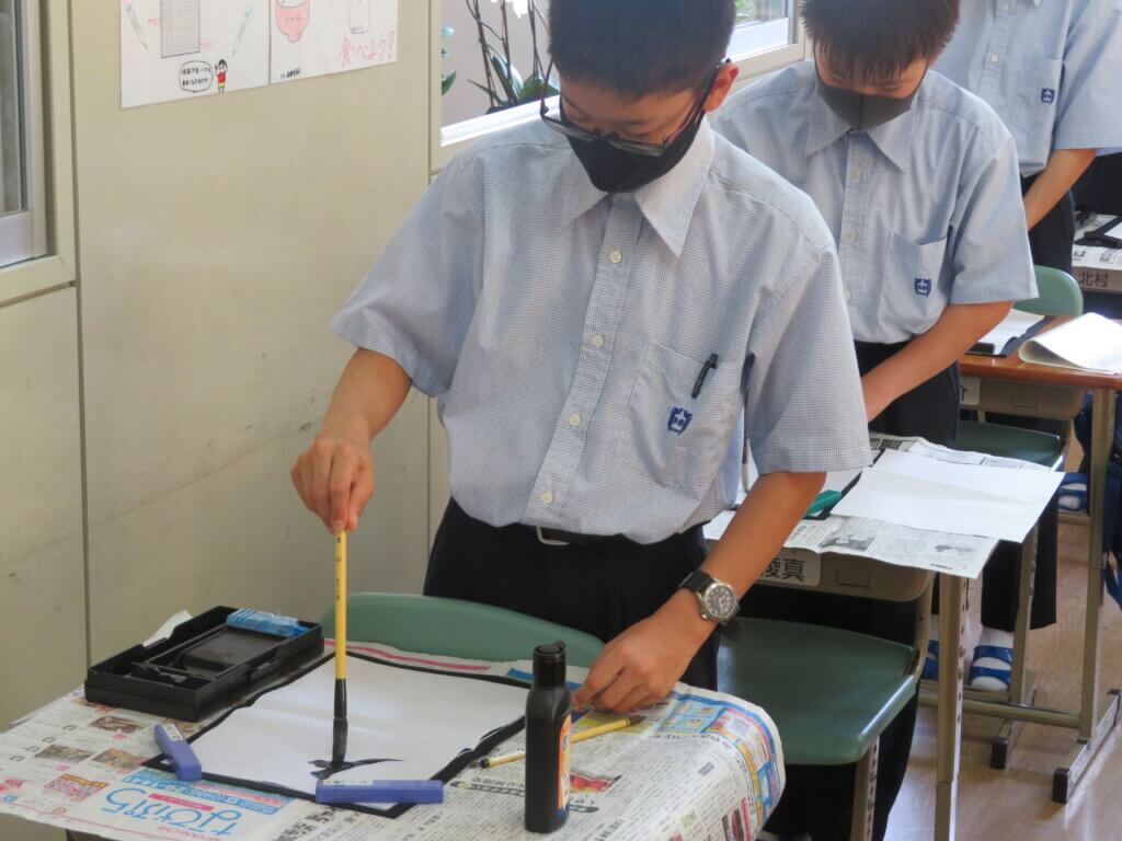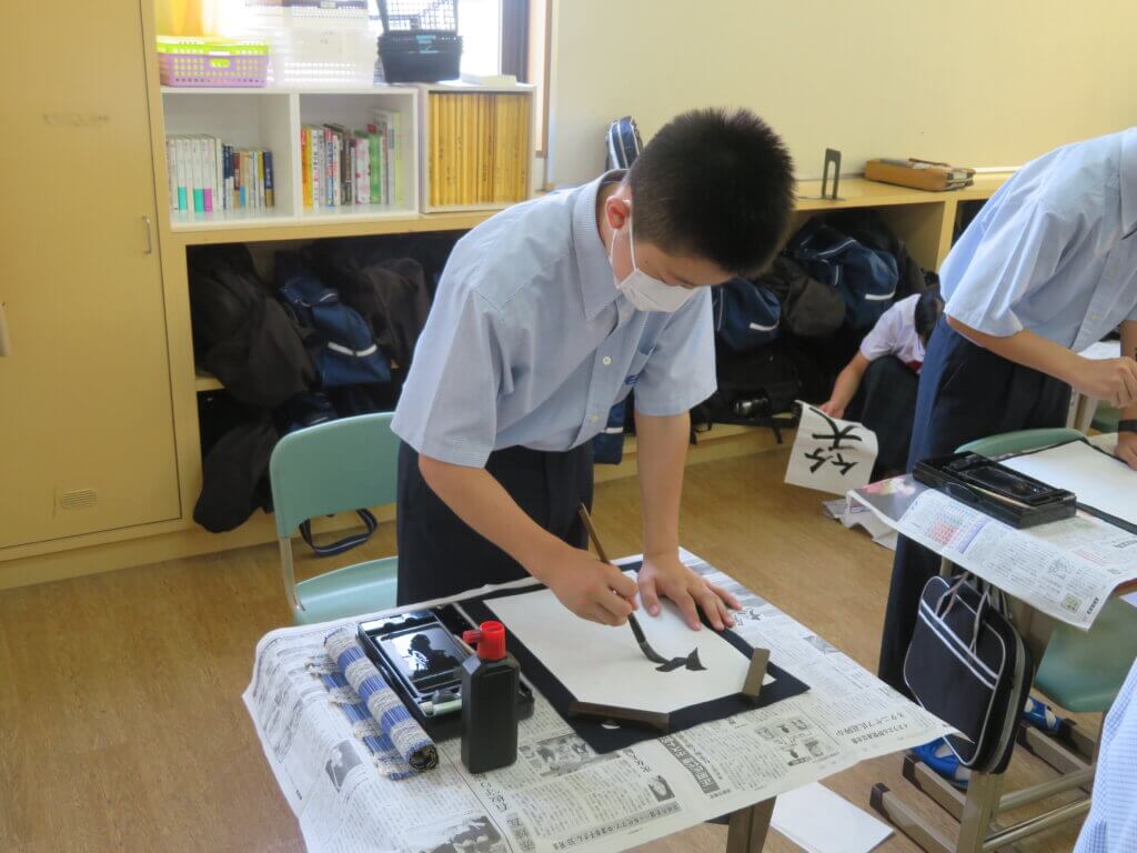 本日1限目、J1-Aは書道でした。年間テーマの「笑」を書いています。いつもは、姿勢や筆の持ち方等こまかく指導をしていただきますが、今日は遊び心をもち自分らしく楽しく書いてみよう!ということで、立って書いたり、筆の上を持ち書いたりしていました。