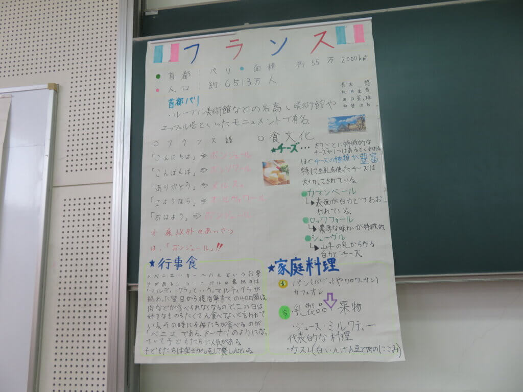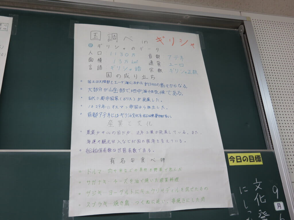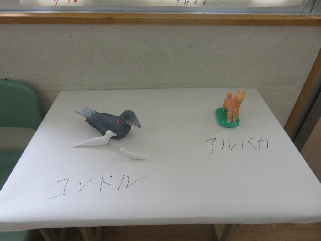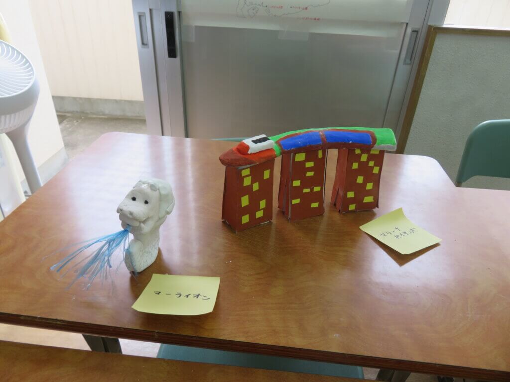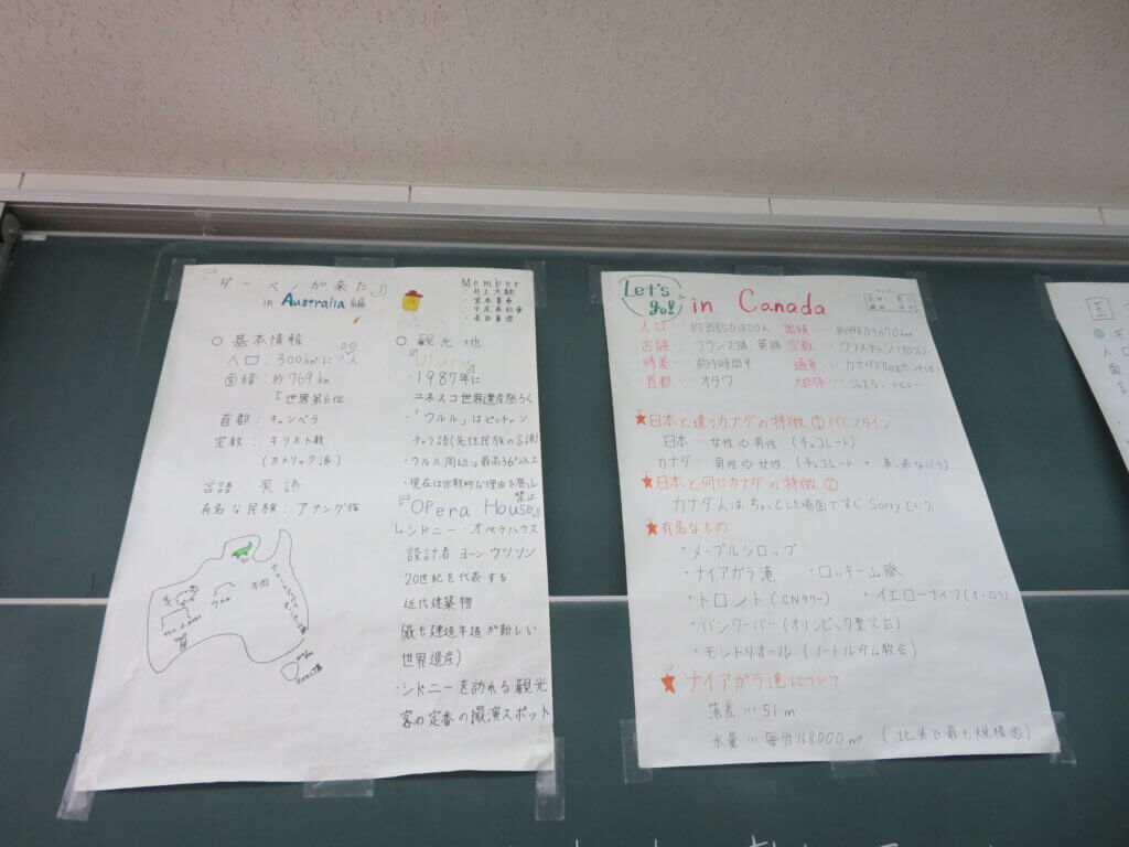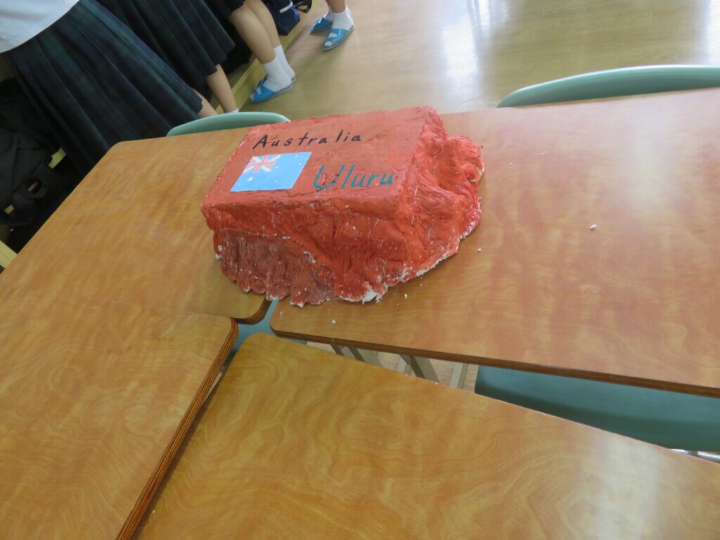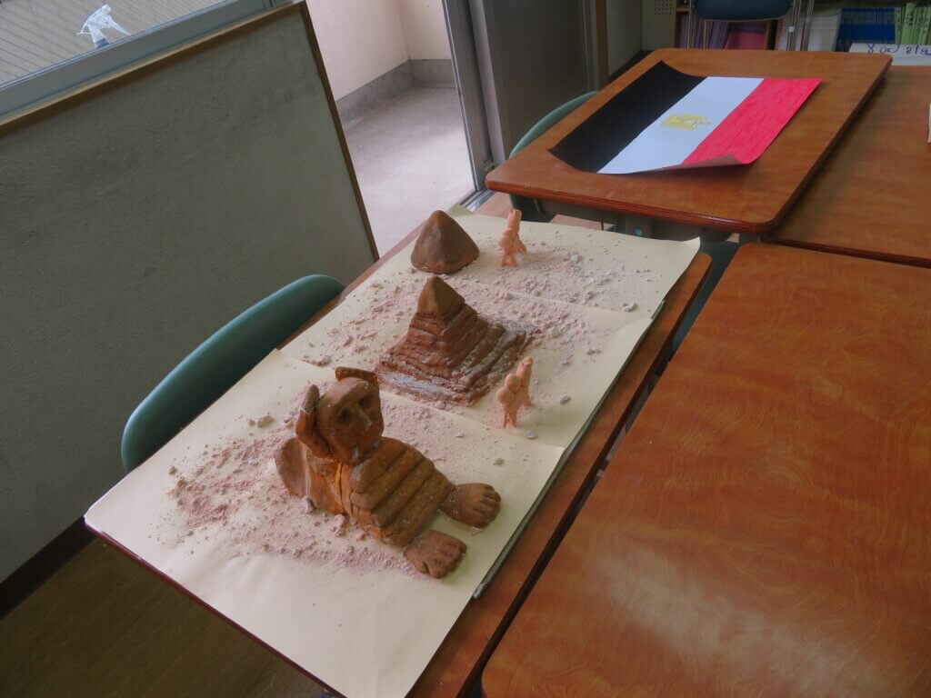 J2は、国調べをしました。各国を調べ模造紙にまとめたり、紙粘土でいろんなものを作り展示しました。
