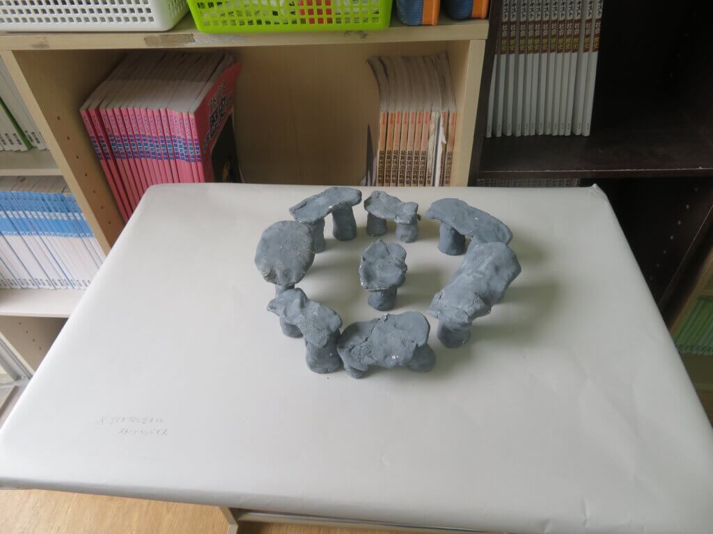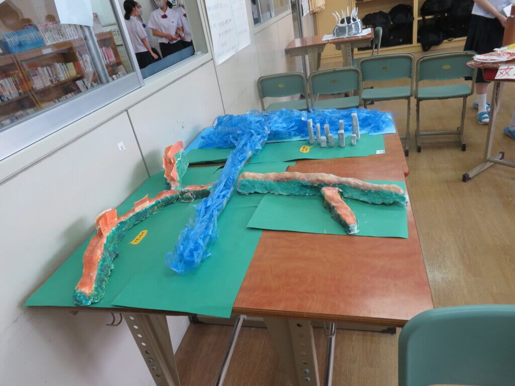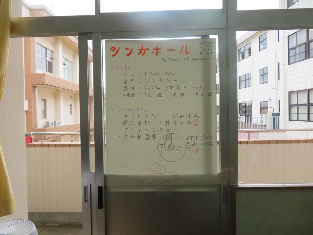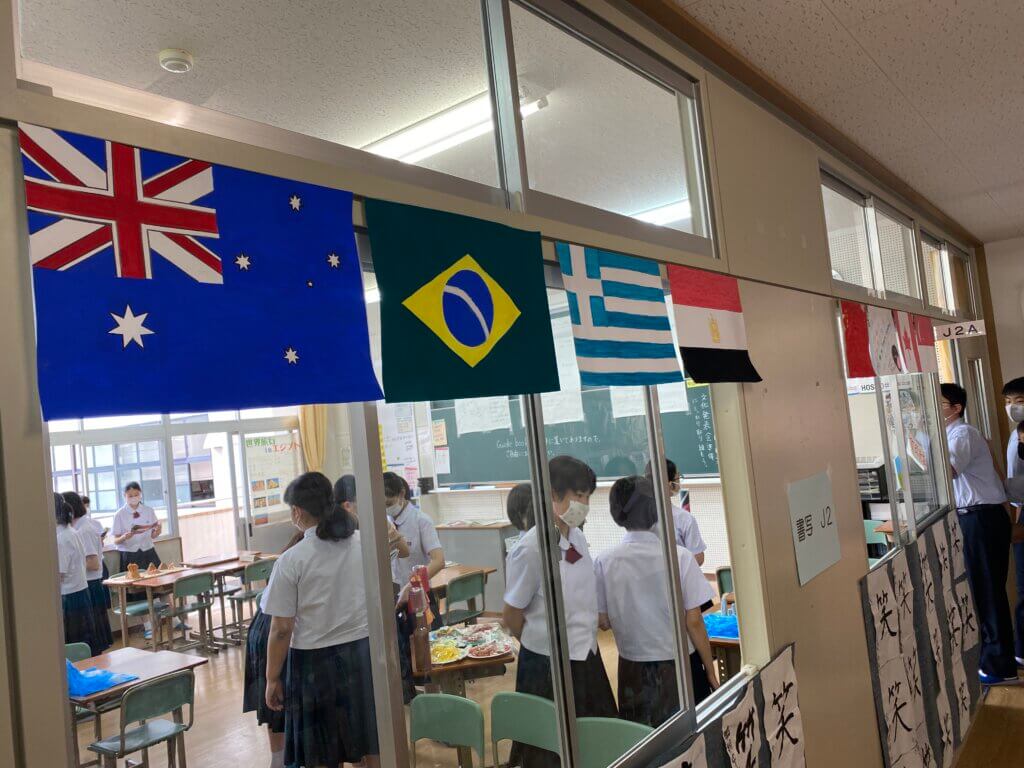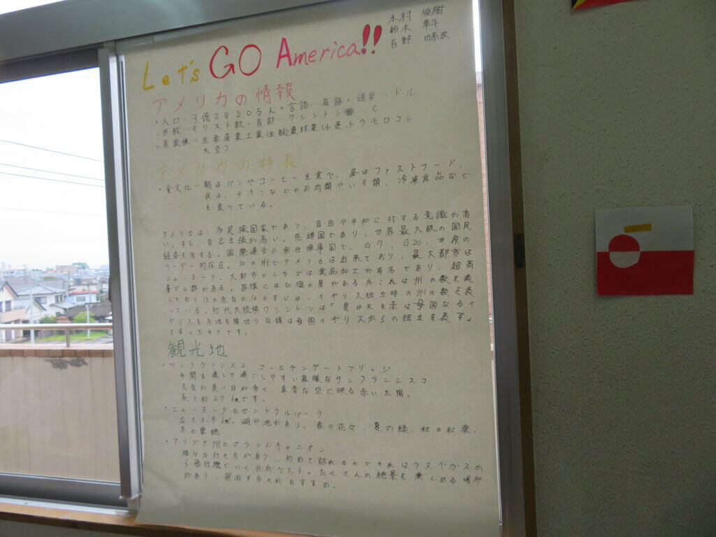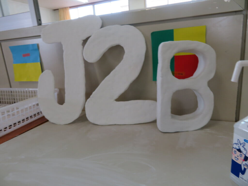 J2は、国調べをしました。各国を調べ模造紙にまとめたり、紙粘土でいろんなものを作り展示しました。