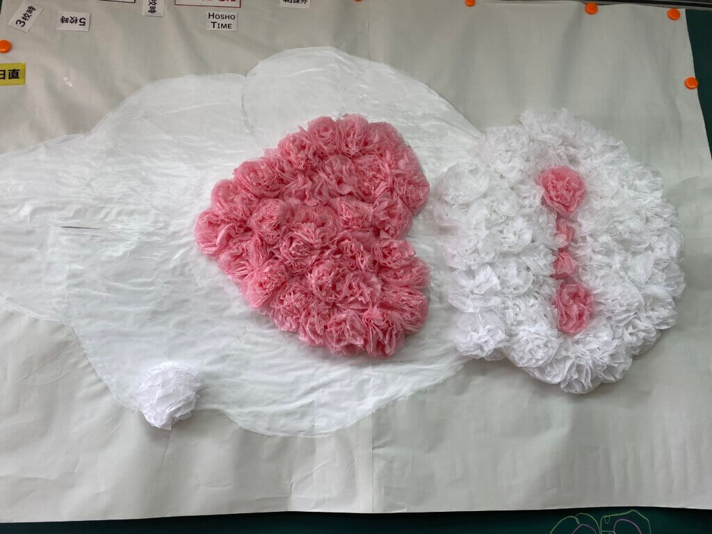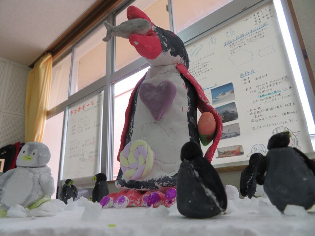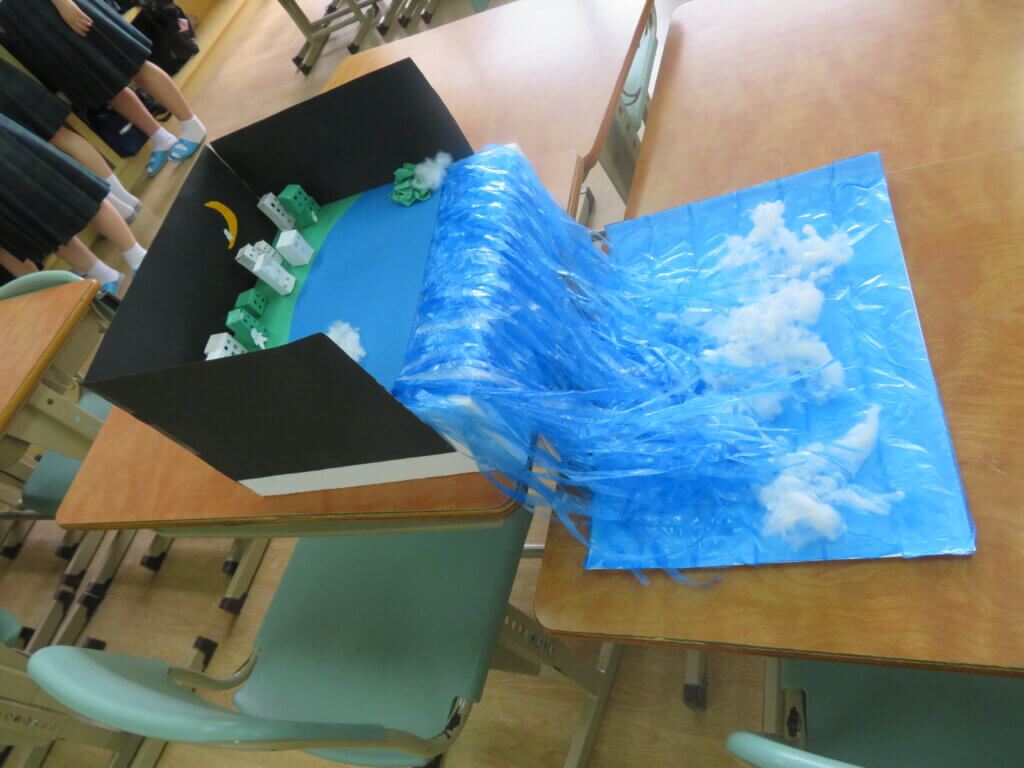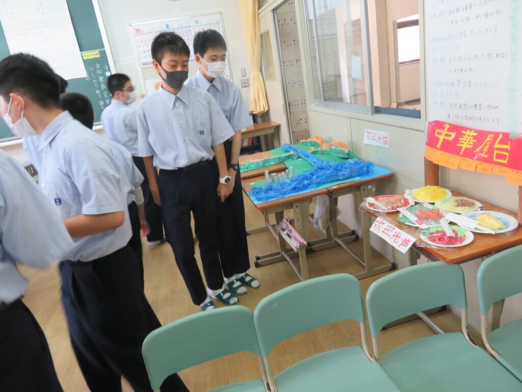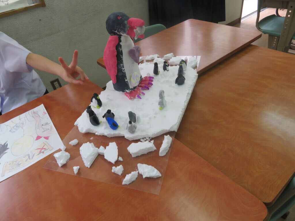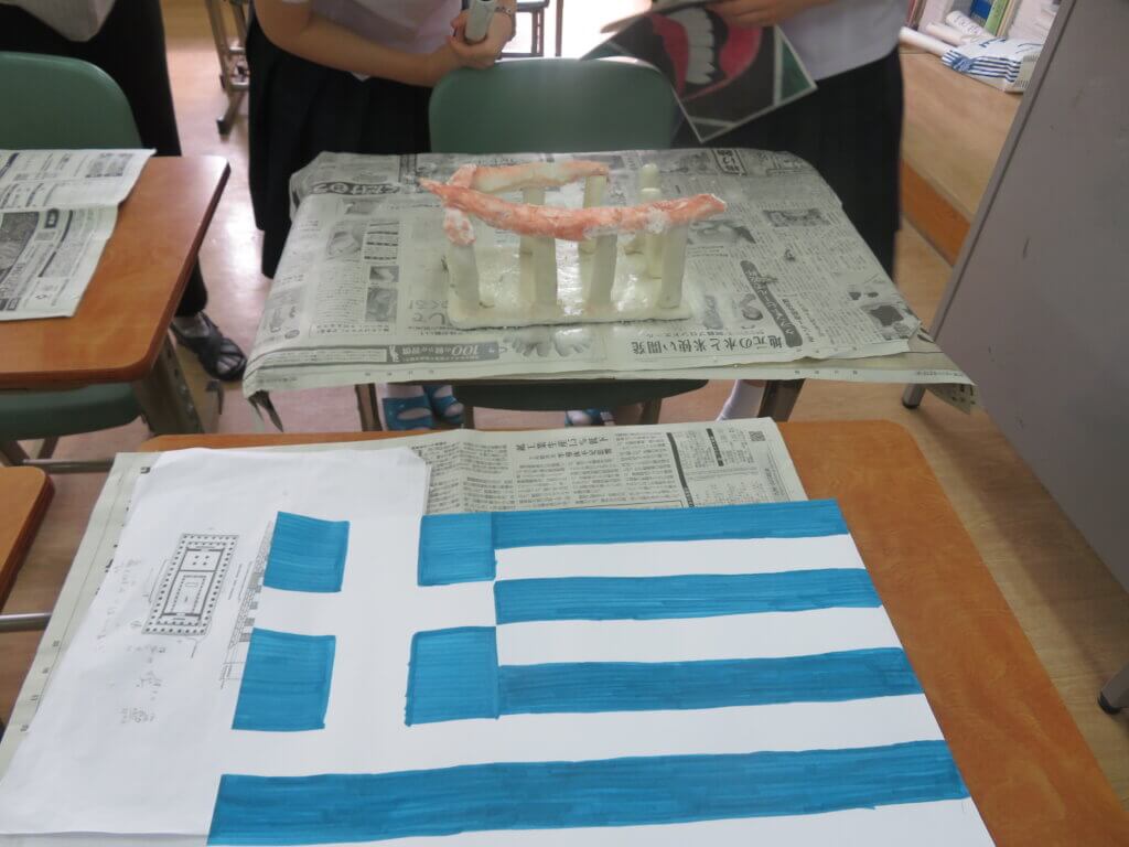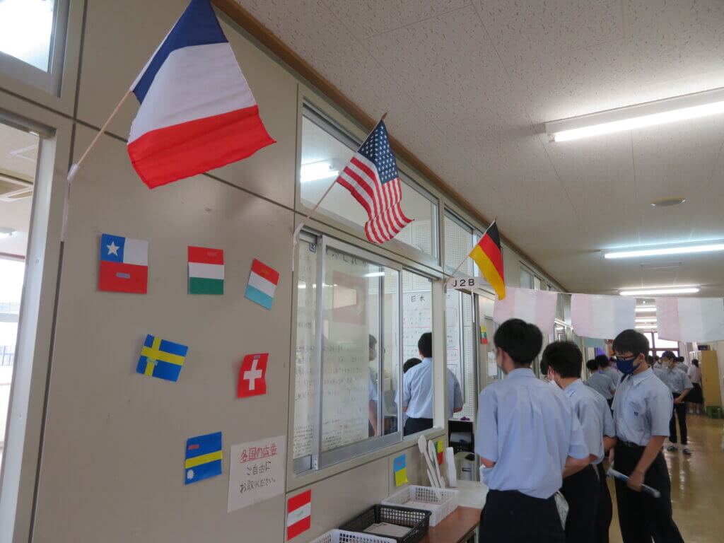 J2は、国調べをしました。各国を調べ模造紙にまとめたり、紙粘土でいろんなものを作り展示しました。