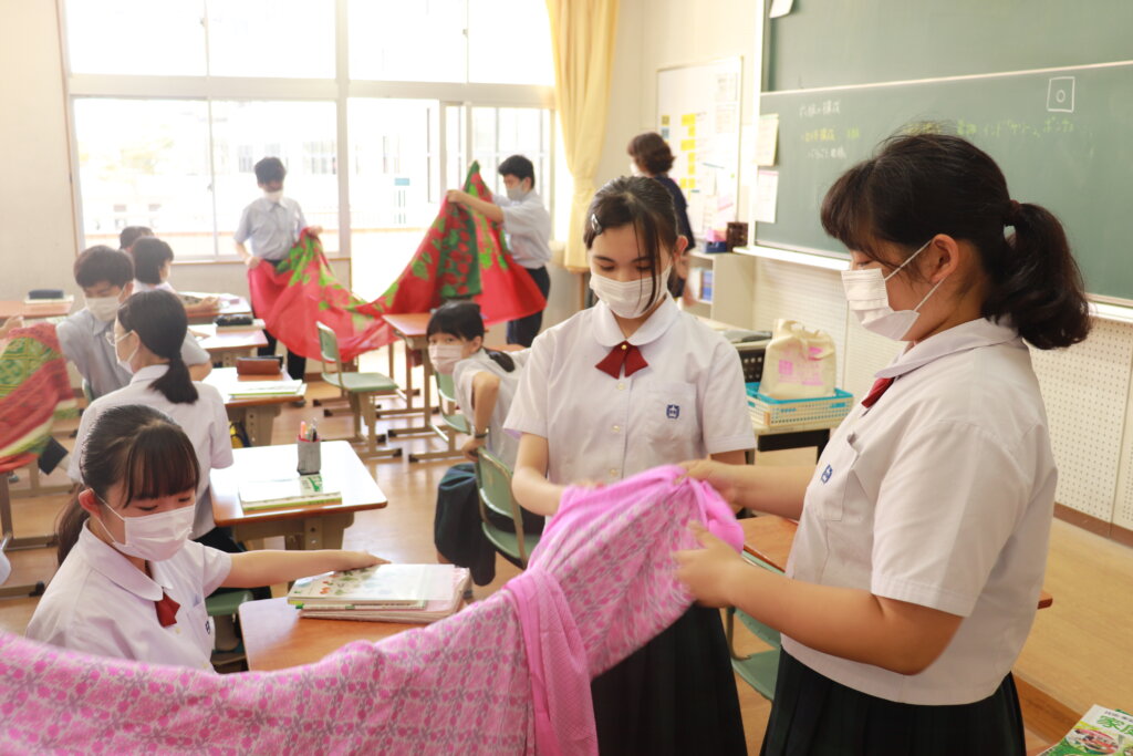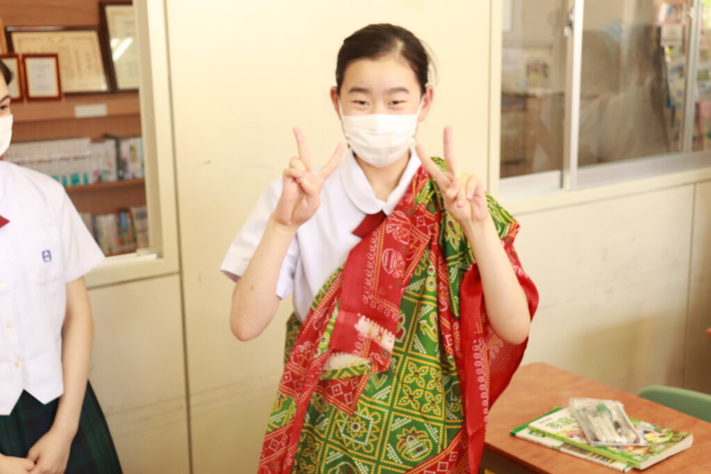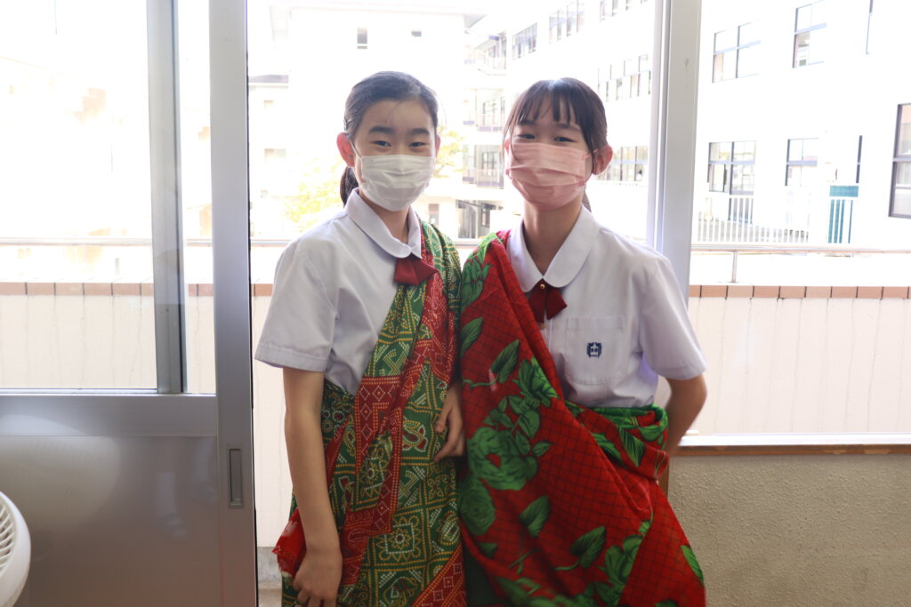 2年生の家庭科の授業では衣服の構成を学習するために実際に南アジア地域の民族衣装であるサリーを着てみていました。実際に触り、どのように着るのかなどを学習しました。普段目にすることのないものを見て、生徒たちは興味津々でした。