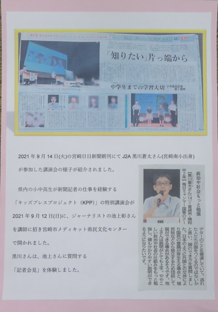 昨日の宮崎日日新聞に、J2-A黒川蒼太さん(宮崎南小出身)が掲載されました。