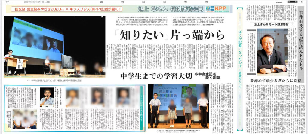 県内の小中高生が新聞記者の仕事を経験する「キッズプレスプロジェクト(KPP)」の特別講演会が12日に、ジャーナリストの池上彰さんを講師に招き宮崎市メディキット県民文化センターで開かれました。そこで、黒川さんは、池上さんに質問する「記者会見」を体験しました。