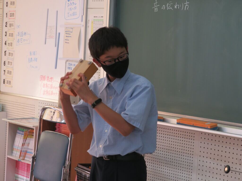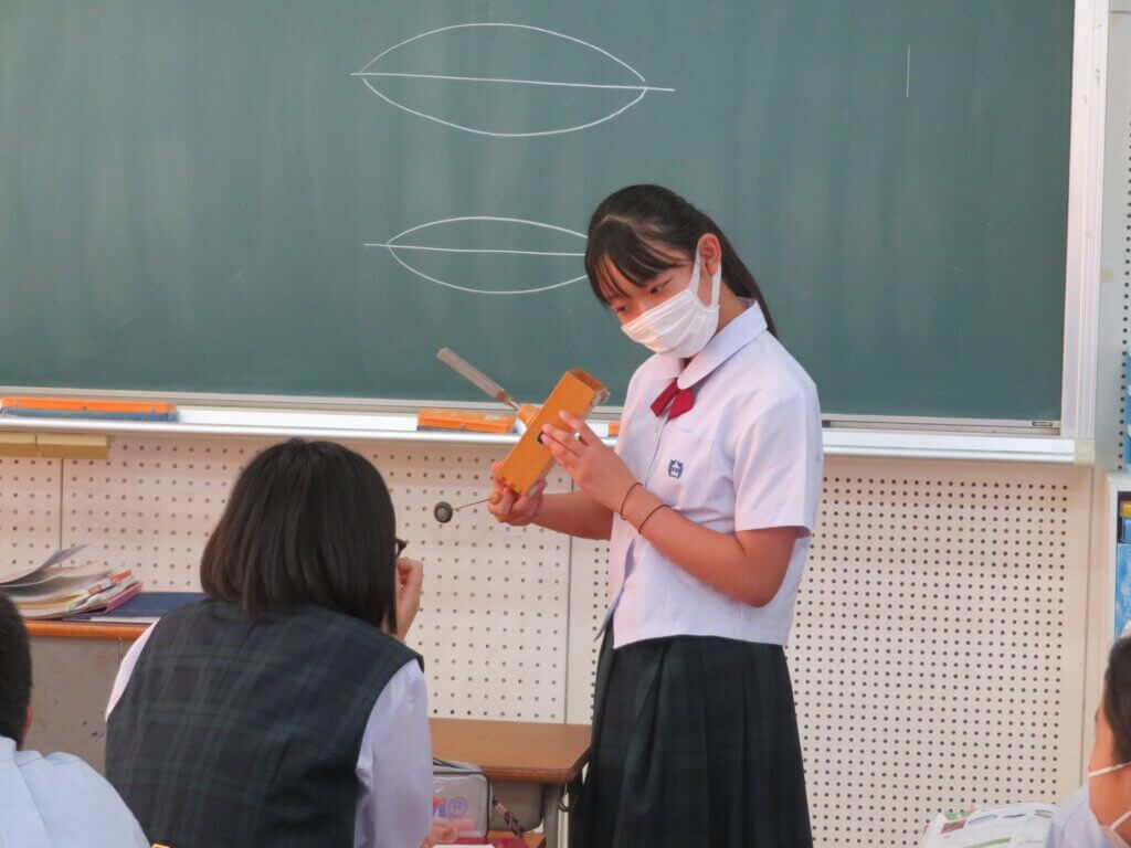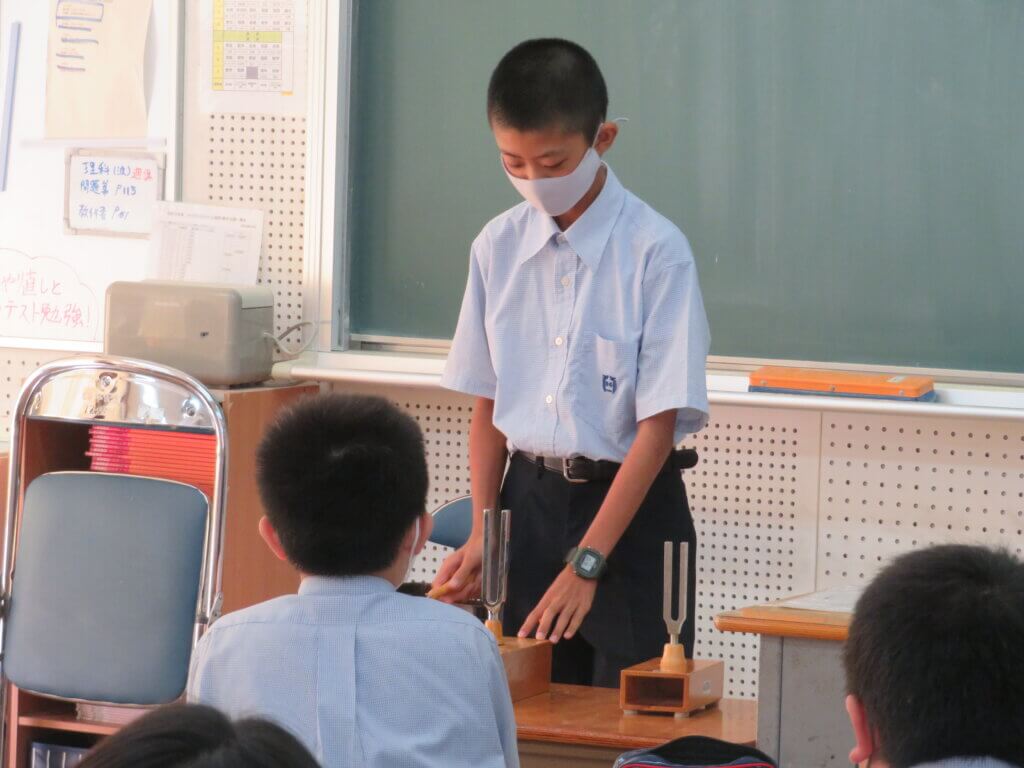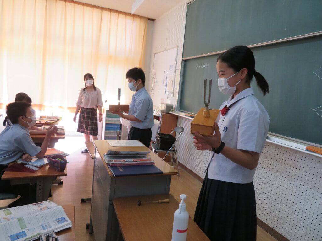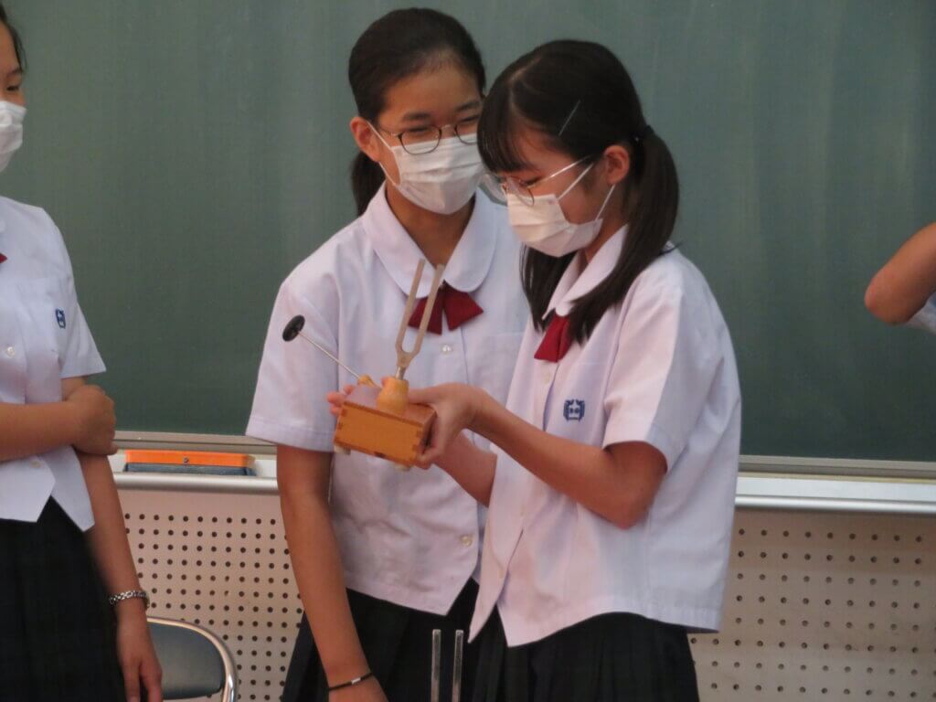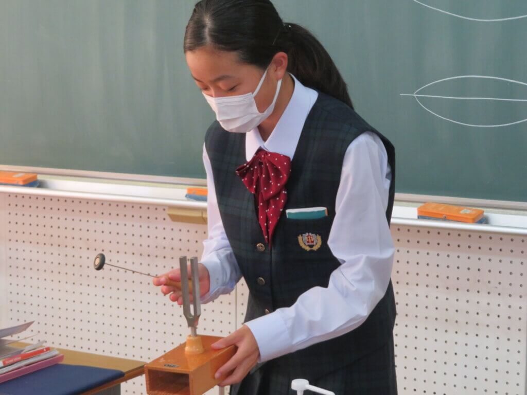 本日、J1-A理科の授業では、音の伝わり方について学習しました。 波江野先生より説明を受けた後、実際におんさを使って音を鳴らし、伝わり方聞こえ方を体験しました。