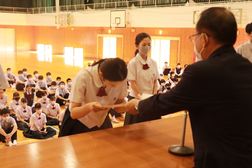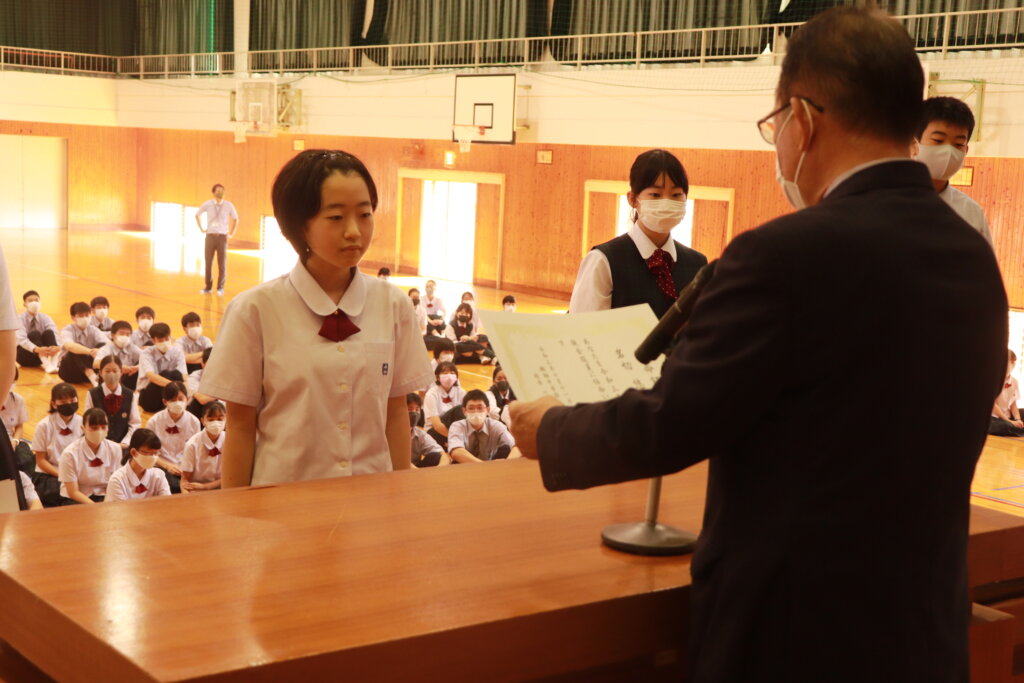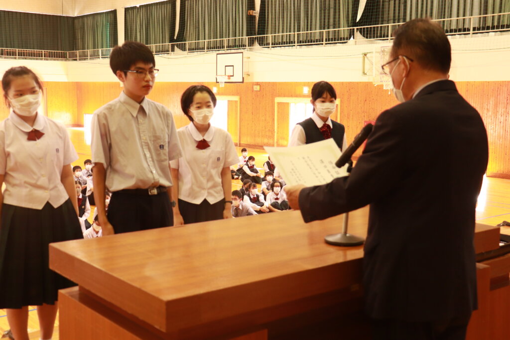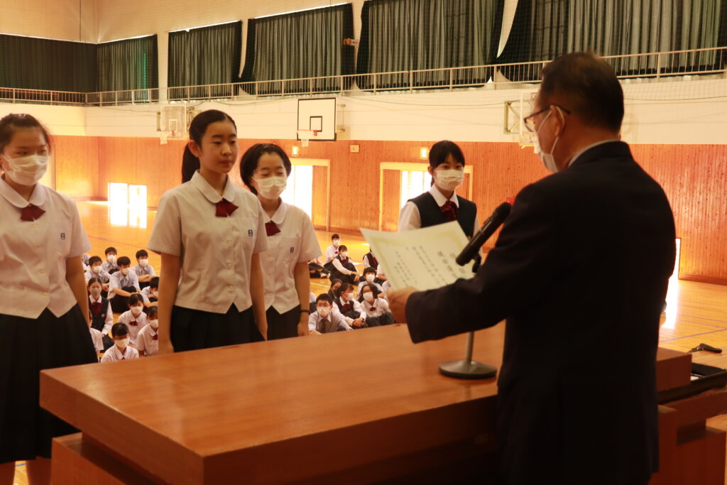 本日、生徒会新旧交代辞令交付式を行いました。先日行われた、生徒会役員演説会の結果を受け、新しい生徒会役員が決定しました。