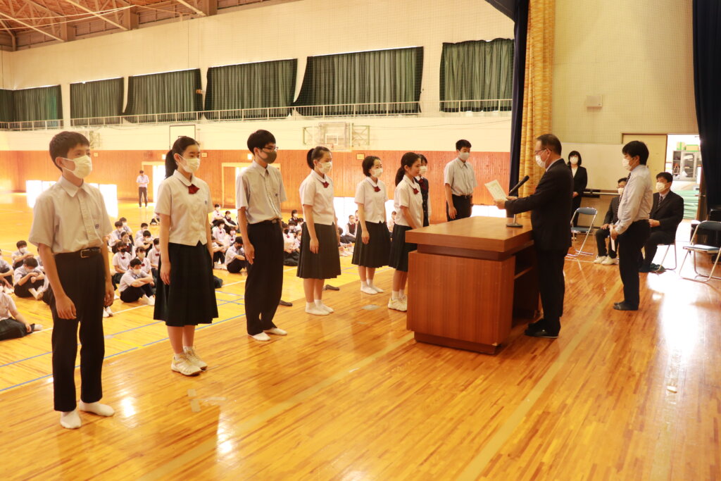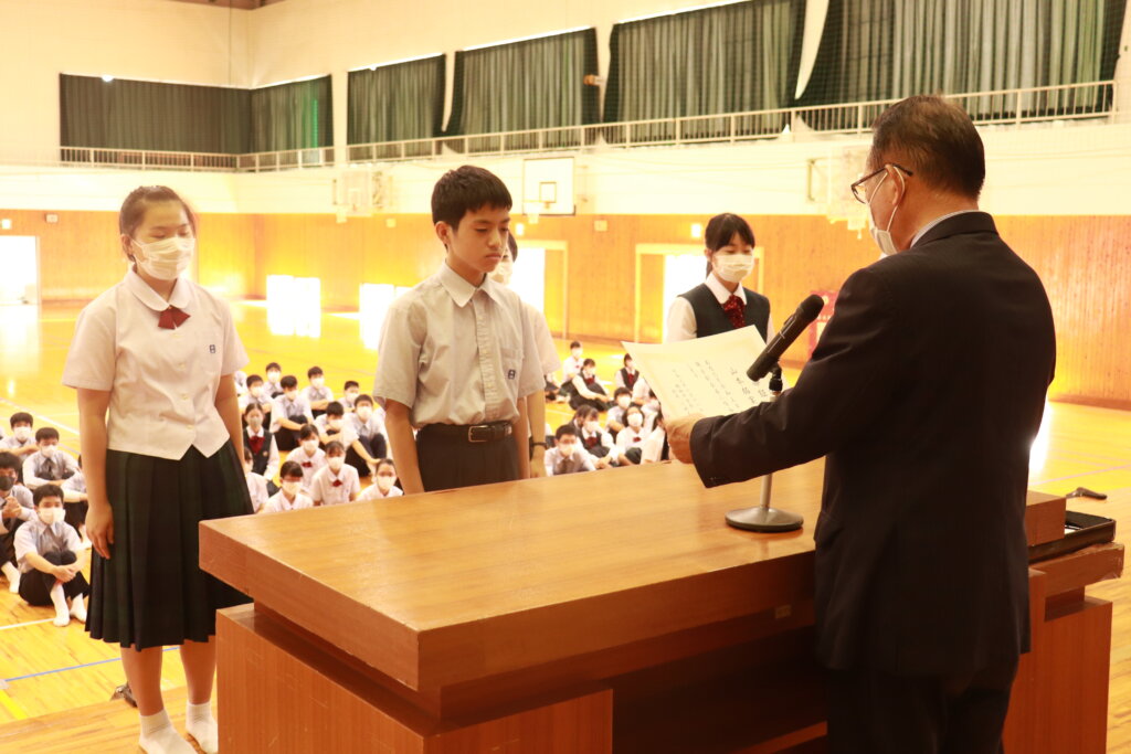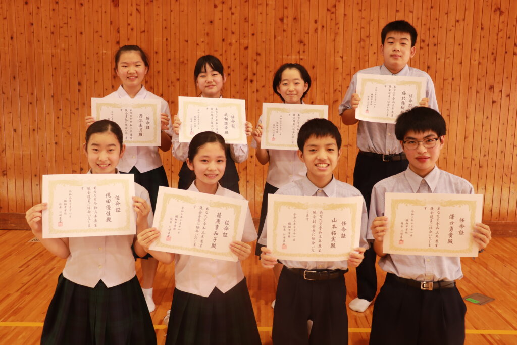 新生徒会役員への任命証授与が行われ、新しい鵬翔中学校がスタートしました。
