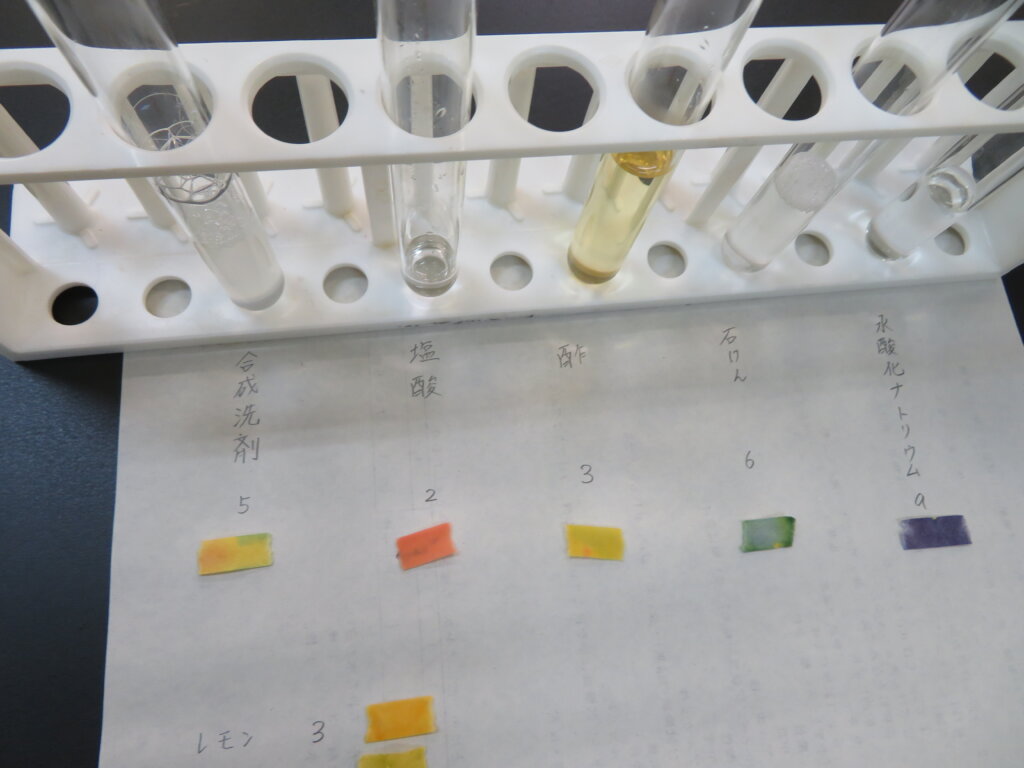 測定の前に、実際になめてみて、PHの順位を予測しました。酸性のものはすっぱく、アルカリ性のものは苦みを感じ、驚いていました。