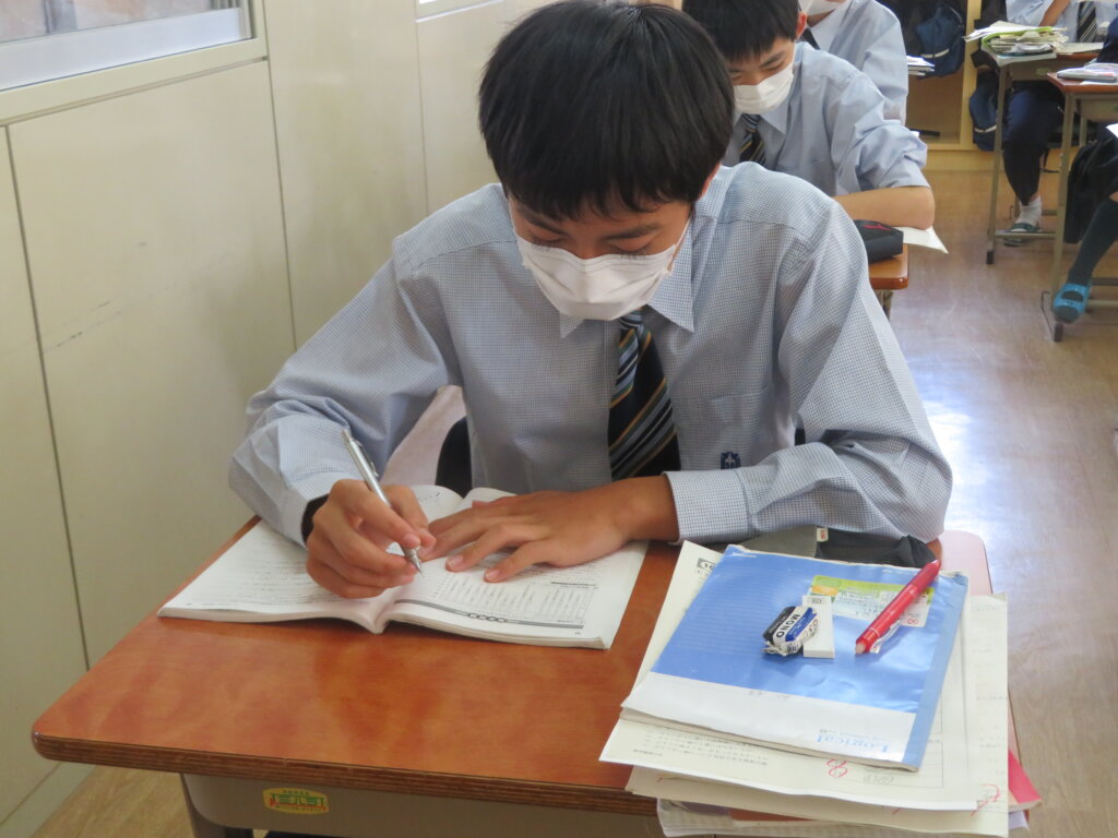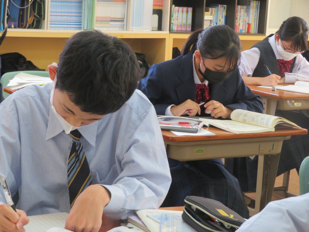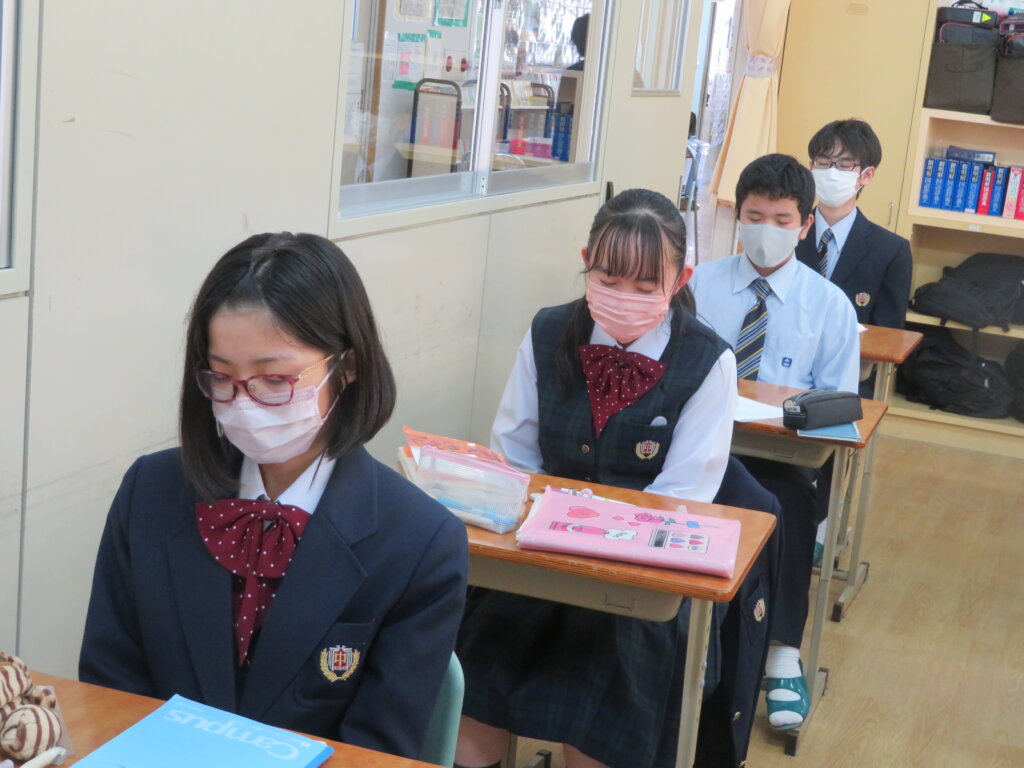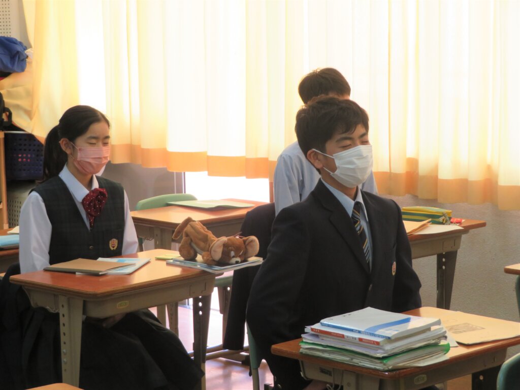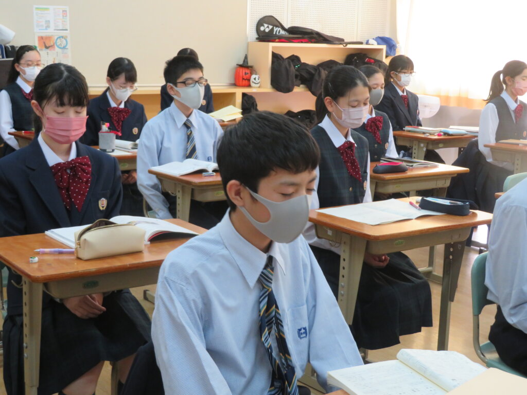 本日は、通常土曜授業です。黙想の様子を写真にて紹介します。毎時間、授業開始1分前に黙想をします。姿勢を正し、心を落ち着かせ授業に臨みます。