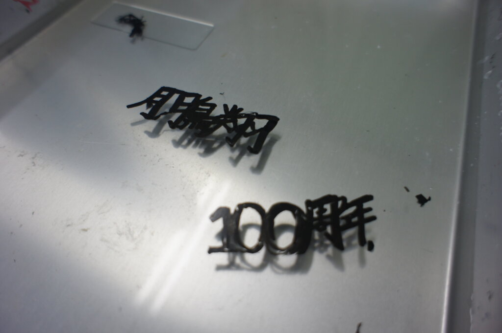 スライドガラスにホワイトマーカーで文字を書き、水の上に文字を浮かせる実験をしました。