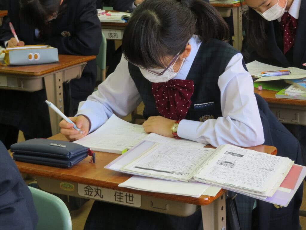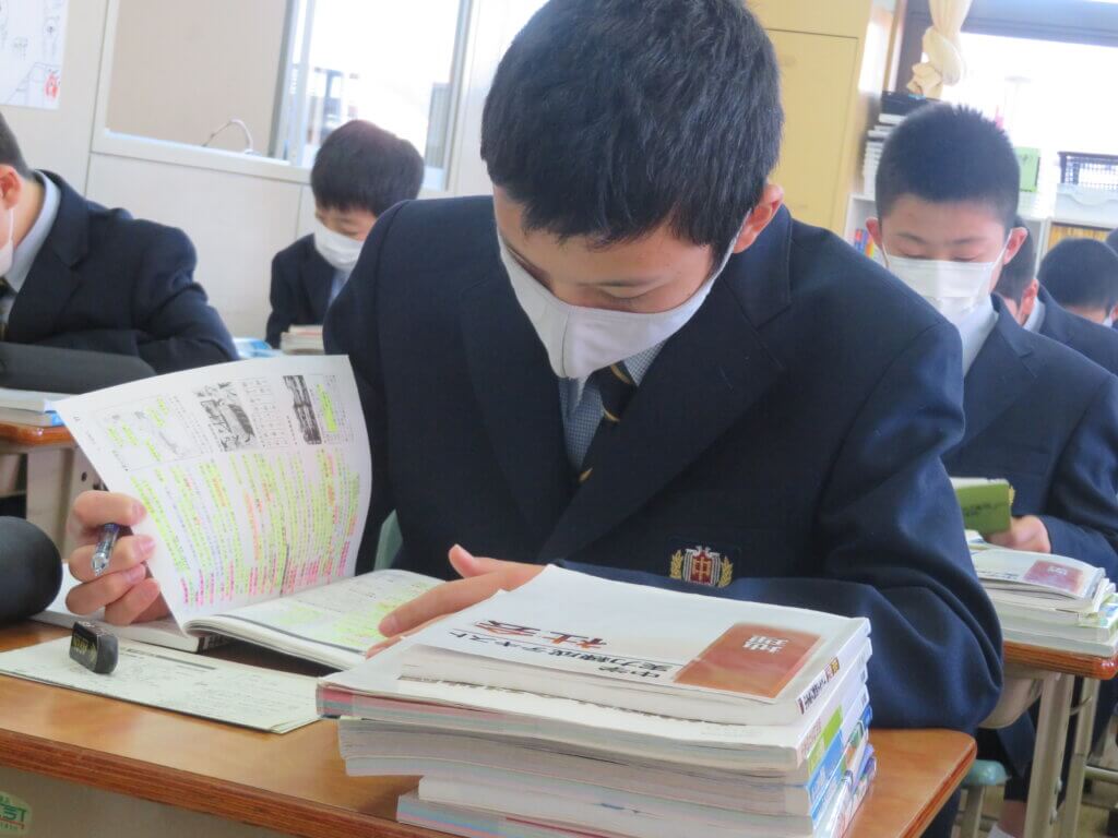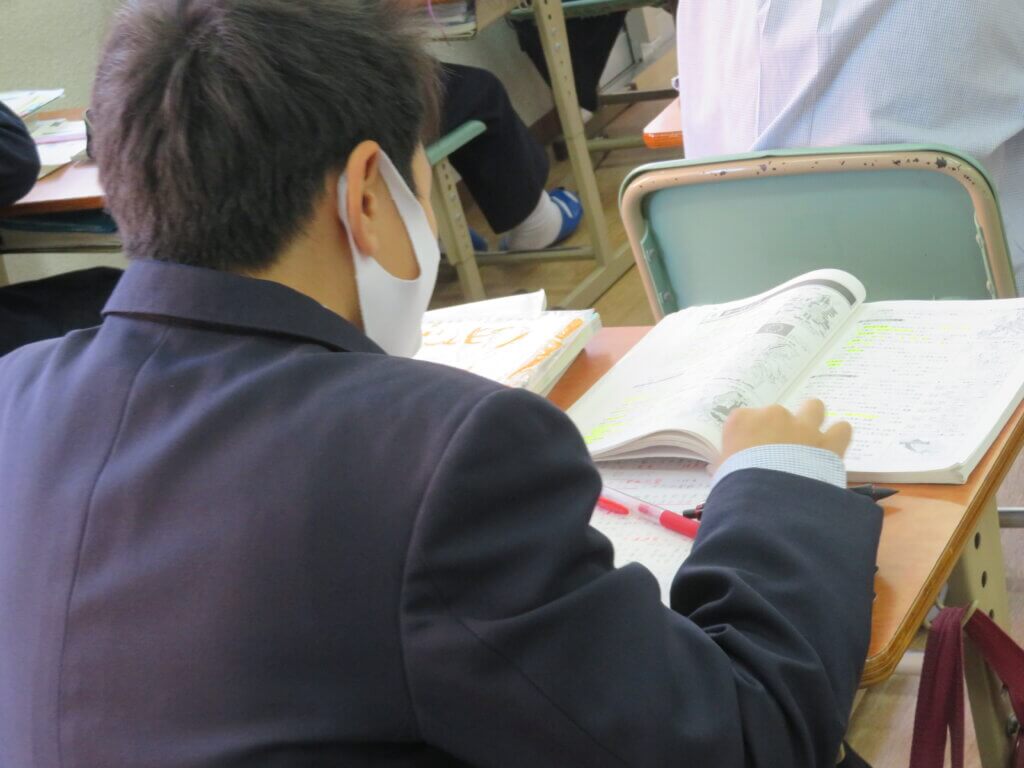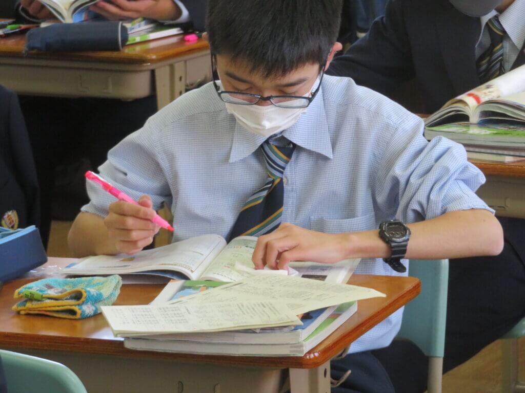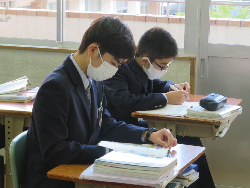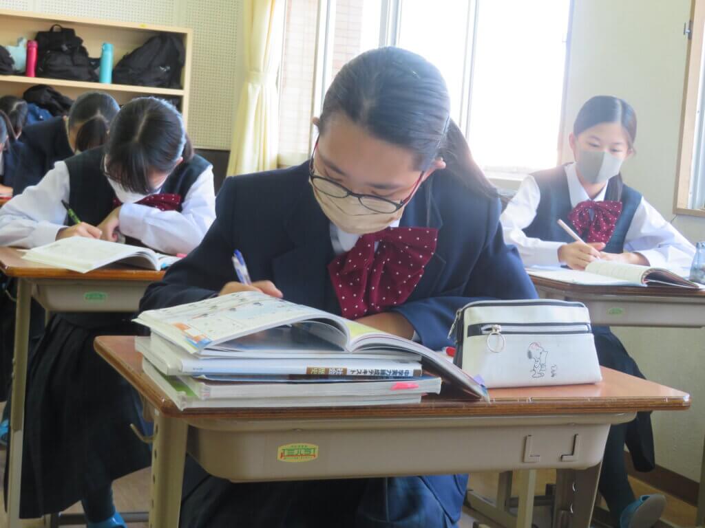 第4回定期考査3日目です。J1・J2生は、理科・音楽・英G。J3生は、物理・化学・音楽・英Gが行われました。午後は、自学自習の時間になります。各々自分でまとめたノートや、教科書、問題集を机いっぱいに広げ、学習しています。