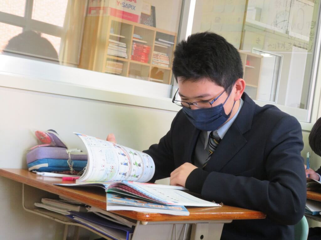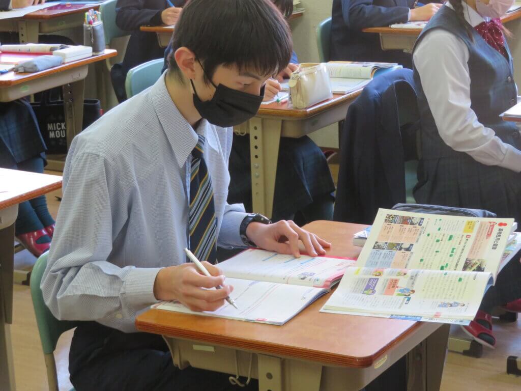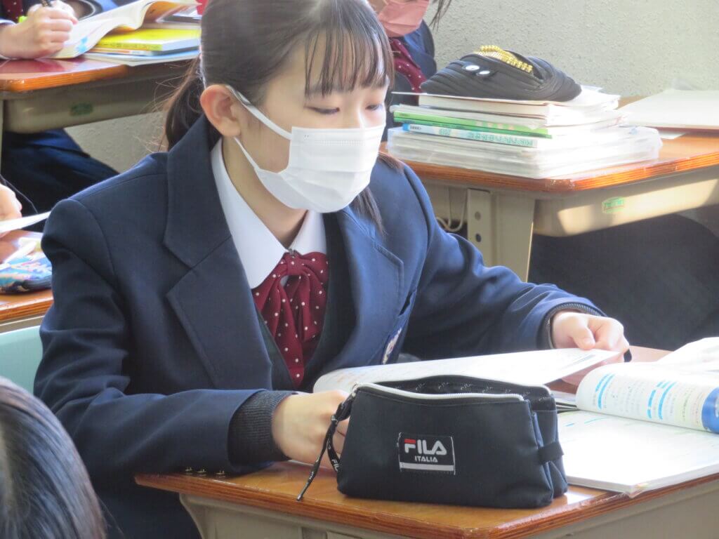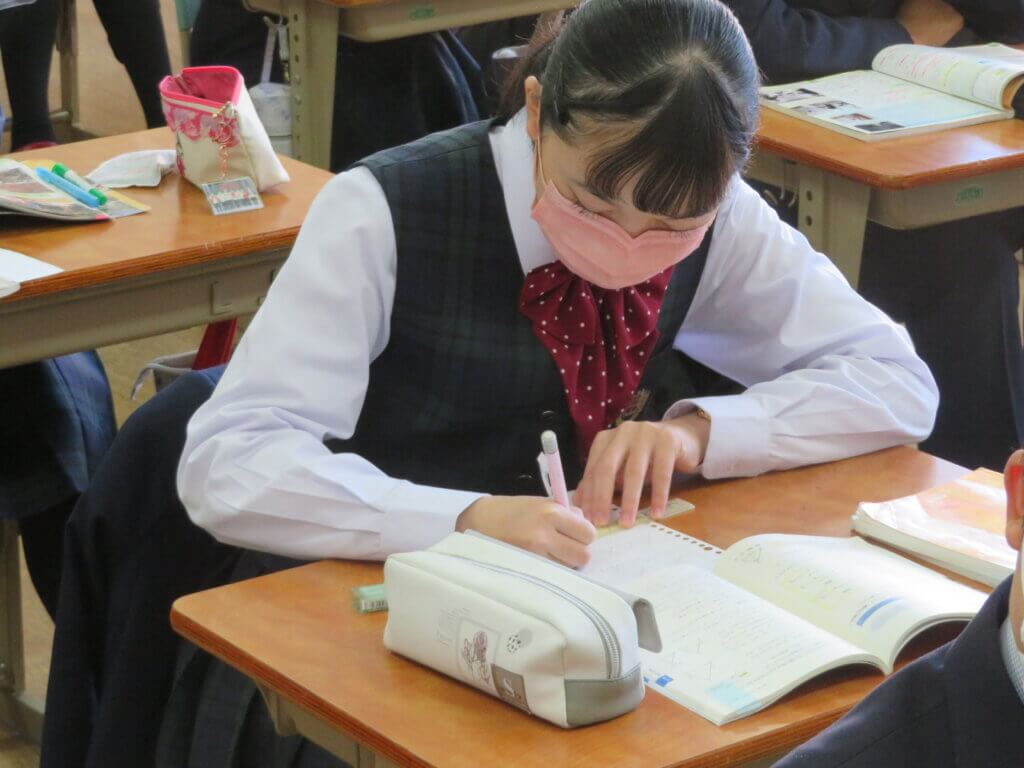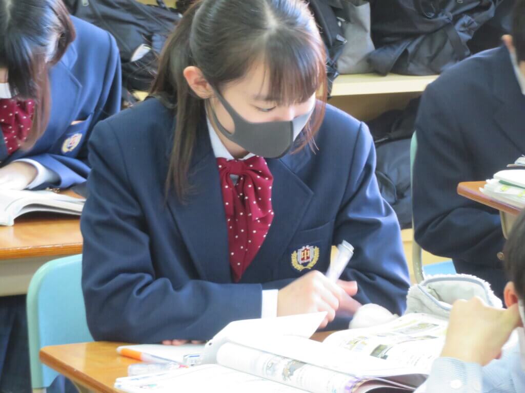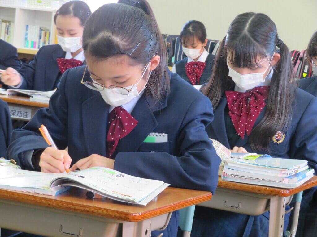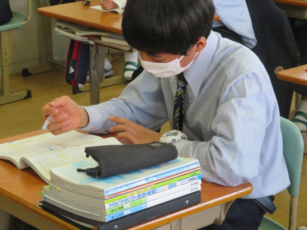 第4回定期考査3日目です。J1・J2生は、理科・音楽・英G。J3生は、物理・化学・音楽・英Gが行われました。午後は、自学自習の時間になります。各々自分でまとめたノートや、教科書、問題集を机いっぱいに広げ、学習しています。