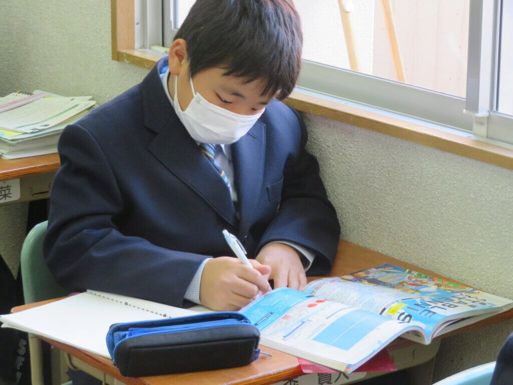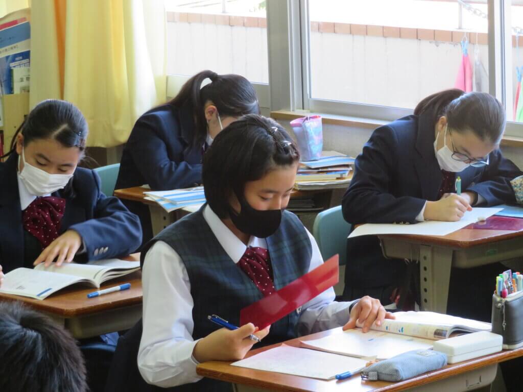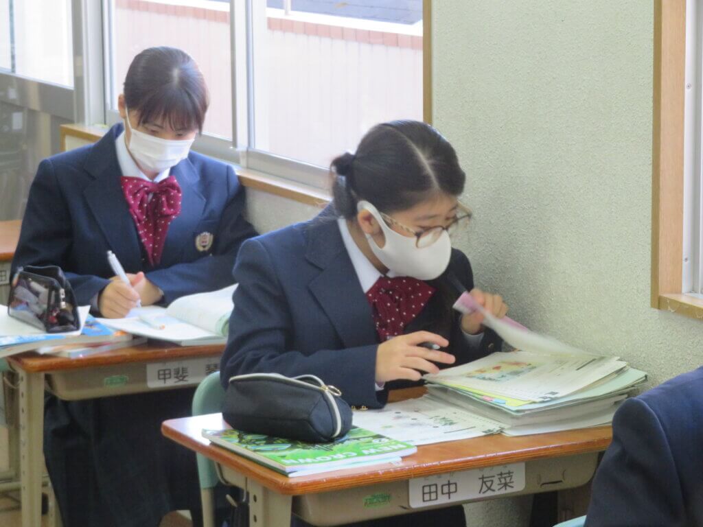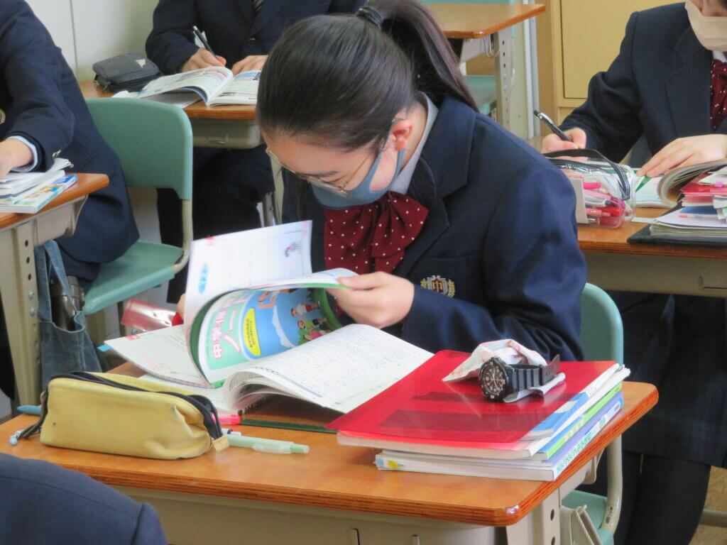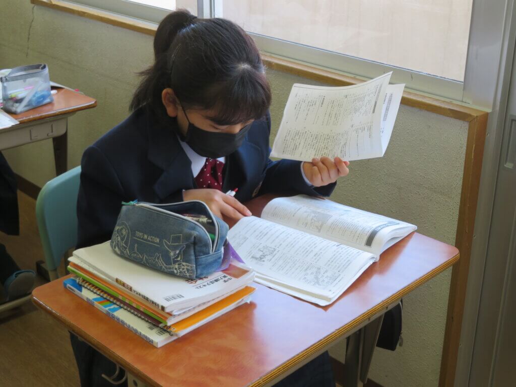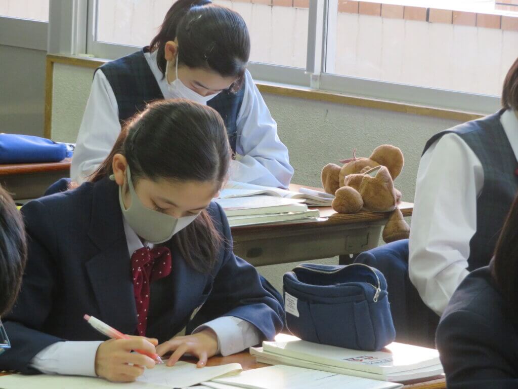 第4回定期考査3日目です。J1・J2生は、理科・音楽・英G。J3生は、物理・化学・音楽・英Gが行われました。午後は、自学自習の時間になります。各々自分でまとめたノートや、教科書、問題集を机いっぱいに広げ、学習しています。