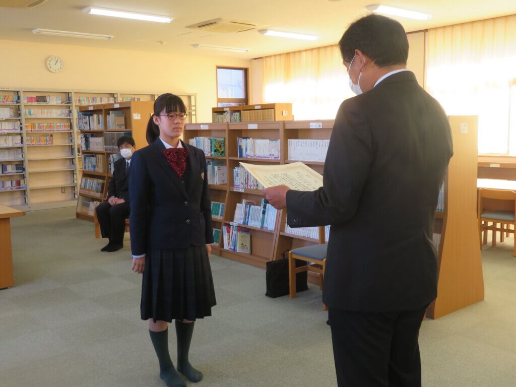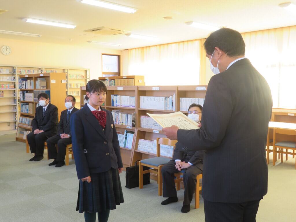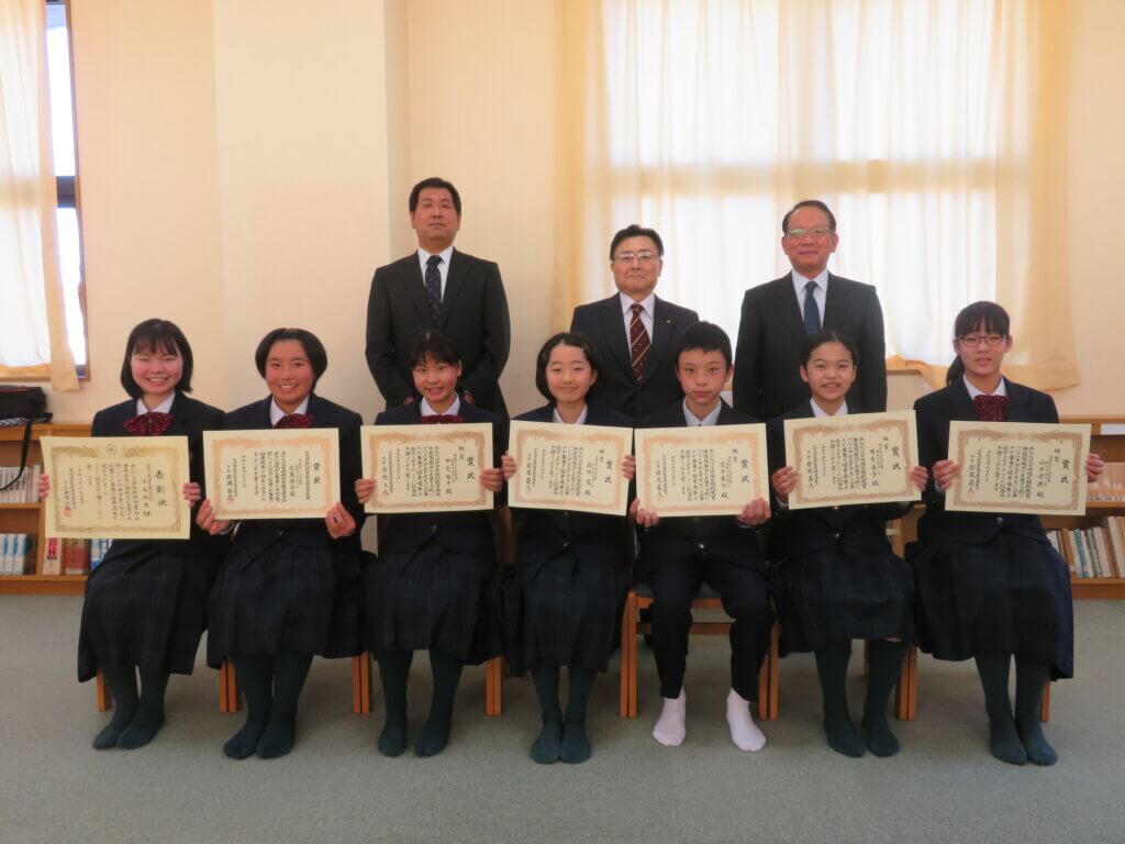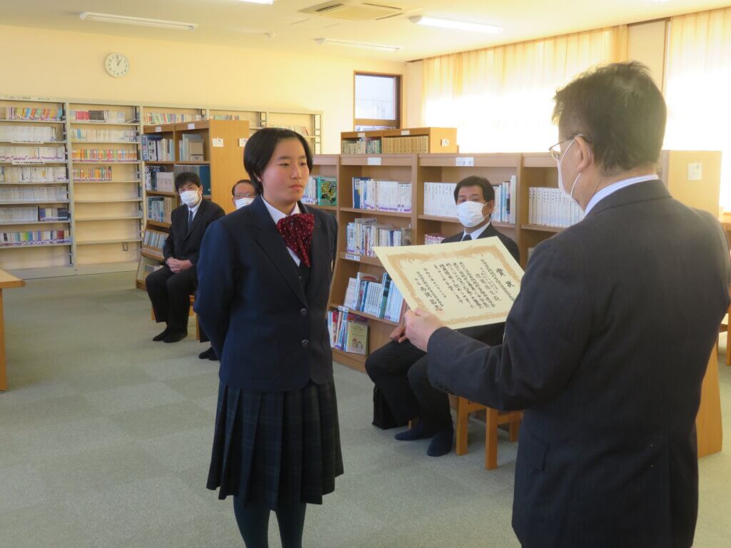 本日、「税についての作文」の表彰式が行われました。本校では、毎年租税教室を実施しています。また、夏休みの課題として税についての作文や標語を全校生徒で書き、応募しています。今回は、税についての作文の入賞者に表彰が行われました。