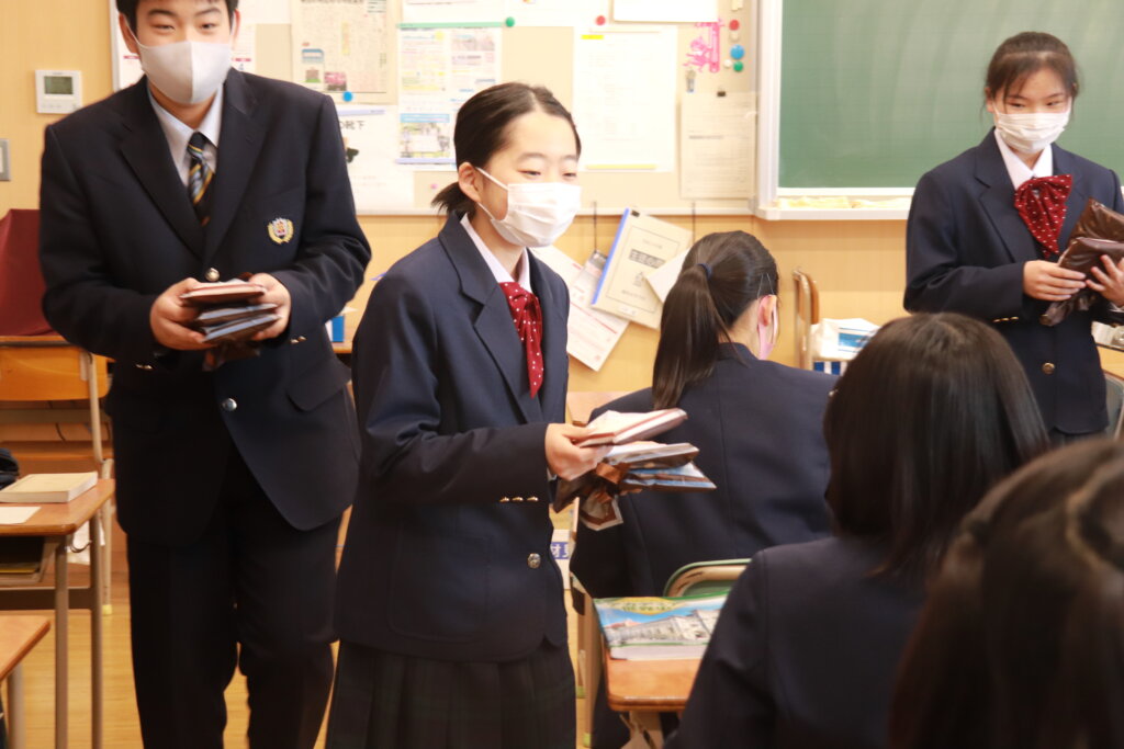 写真は、3年1組、2組の先輩方へタオルを手渡ししている様子です。
