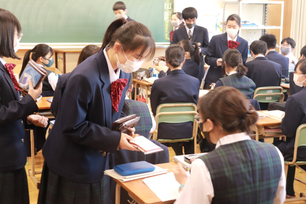 本日、特進英数科中高一貫3年生の先輩方のところへ、中学生を代表して生徒会のメンバーで大学受験の応援に行ってきました。毎年、激励の意味を込めて合格タオルをプレゼントしています。