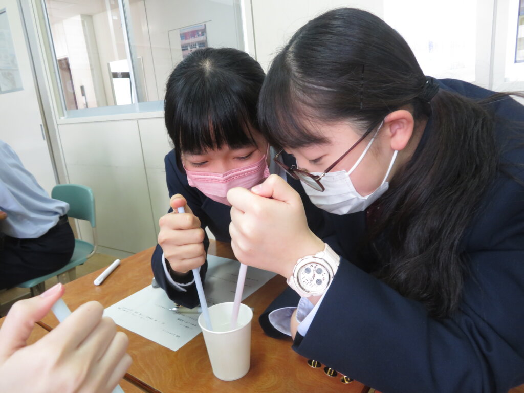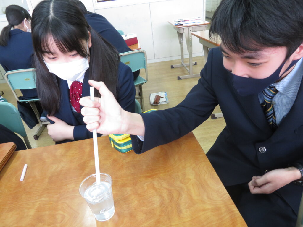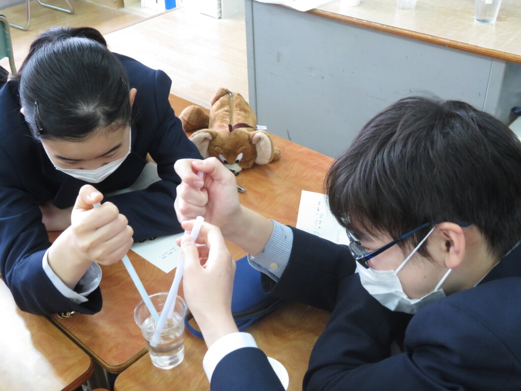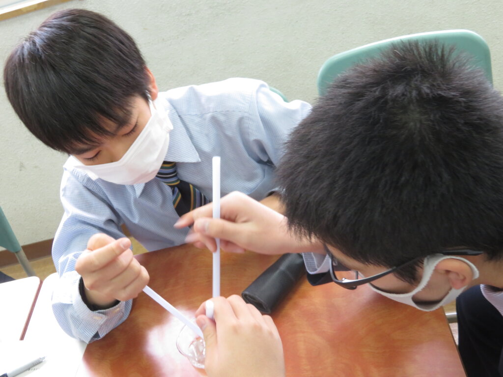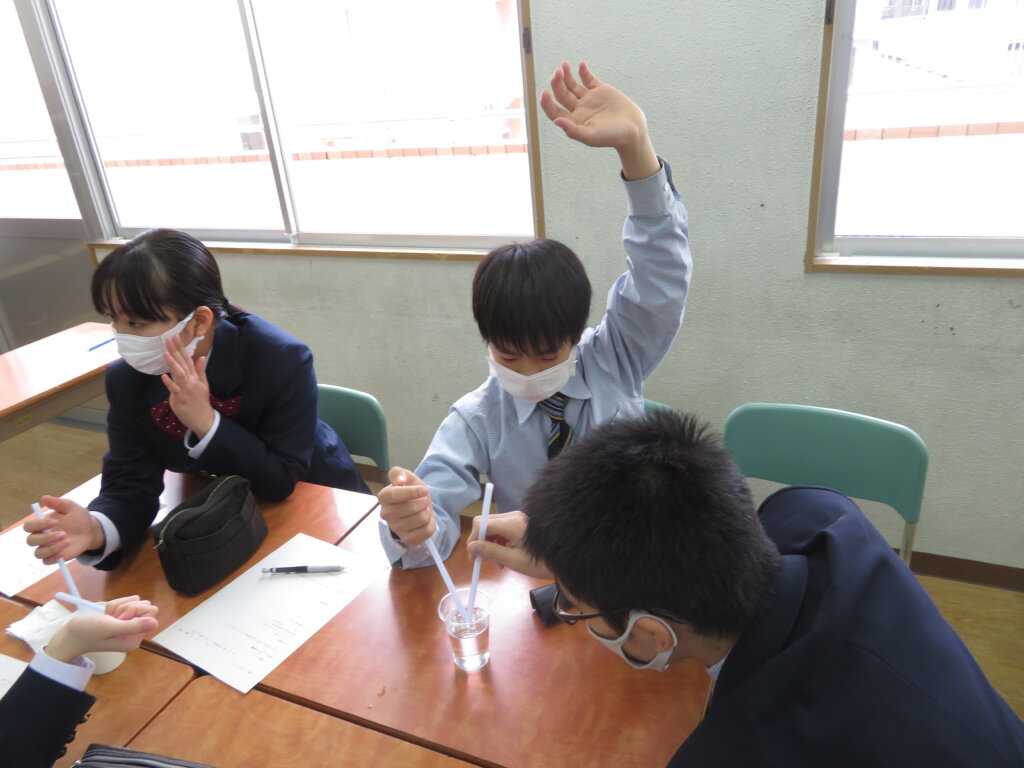 J2-Aから楽しそうな声が聞こえ覗いてみると、割れないシャボン玉を作る実験をしていました。生徒たちが興味を持って前向きに学習に取り組む様子が見られました。