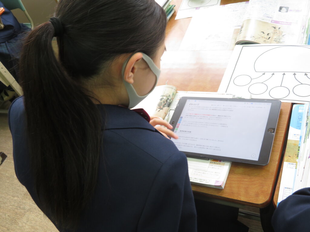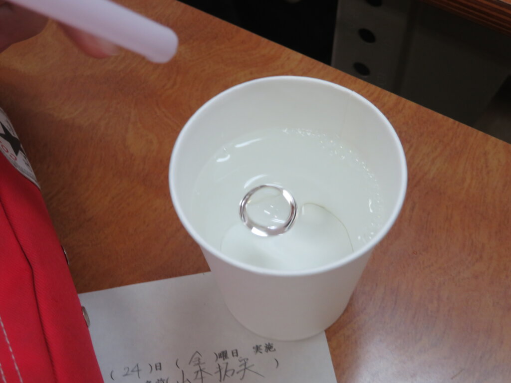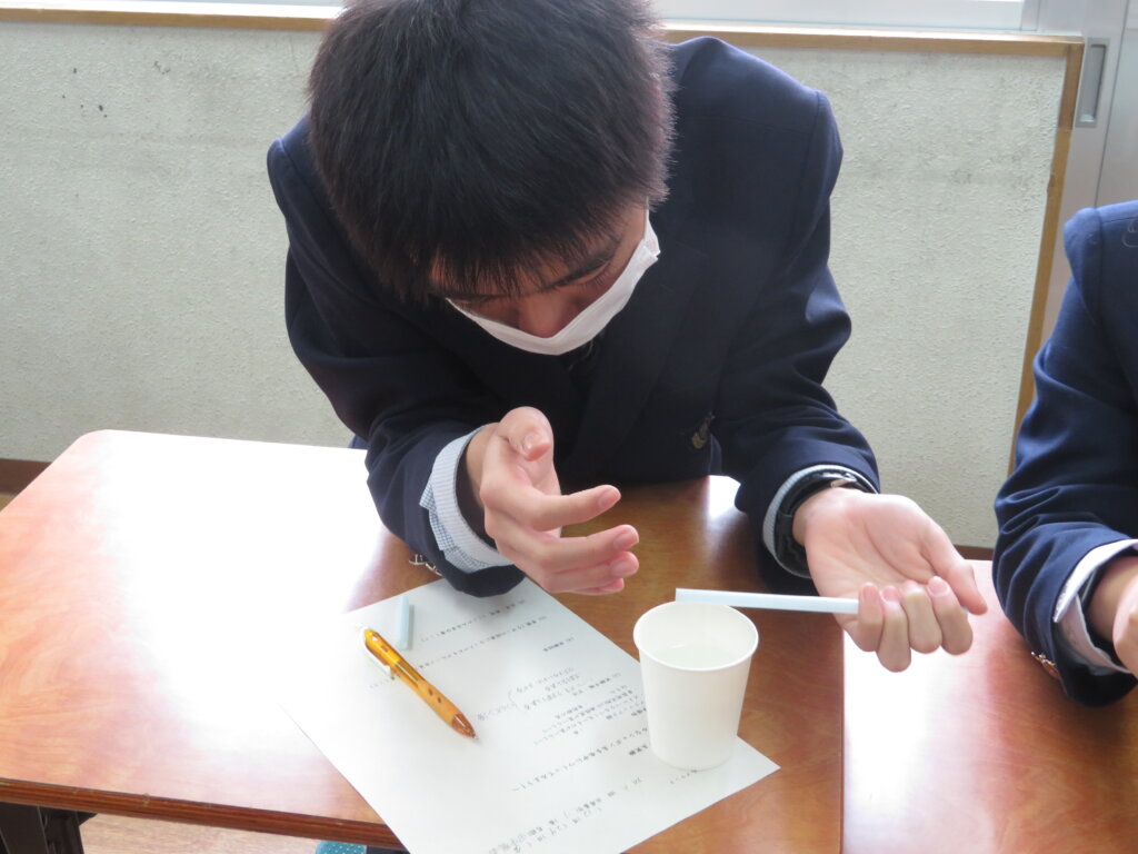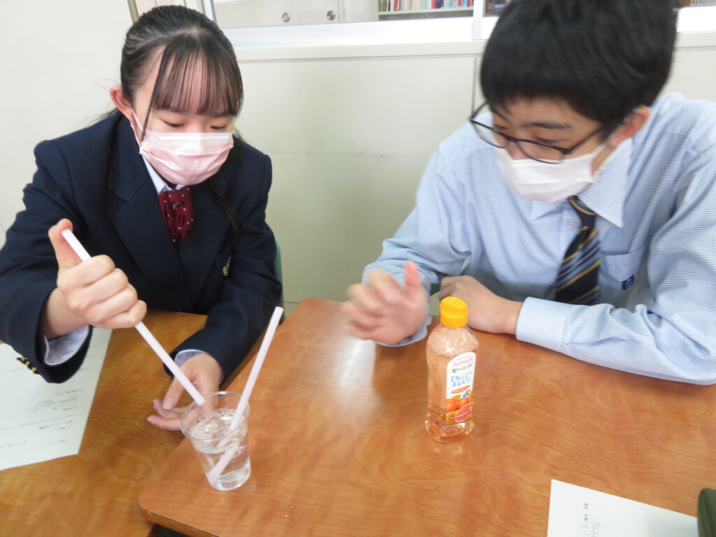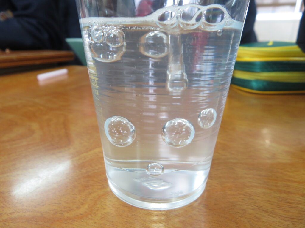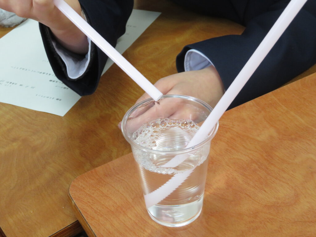 J2-Aから楽しそうな声が聞こえ覗いてみると、割れないシャボン玉を作る実験をしていました。生徒たちが興味を持って前向きに学習に取り組む様子が見られました。