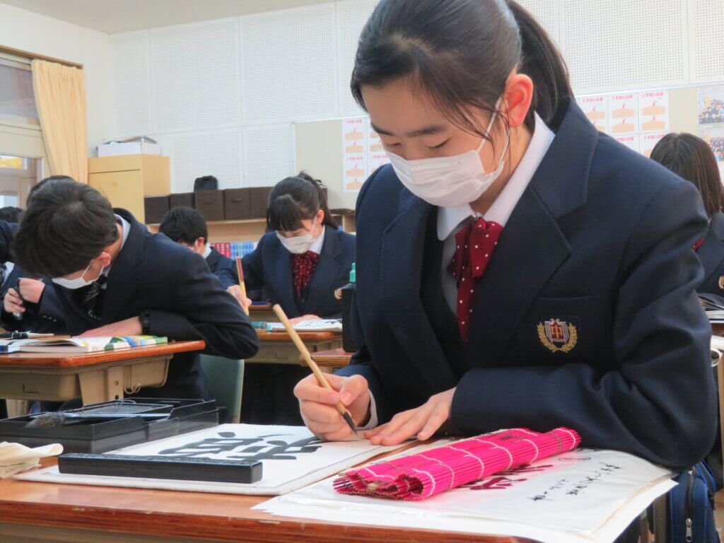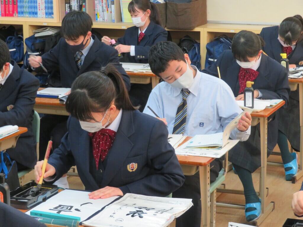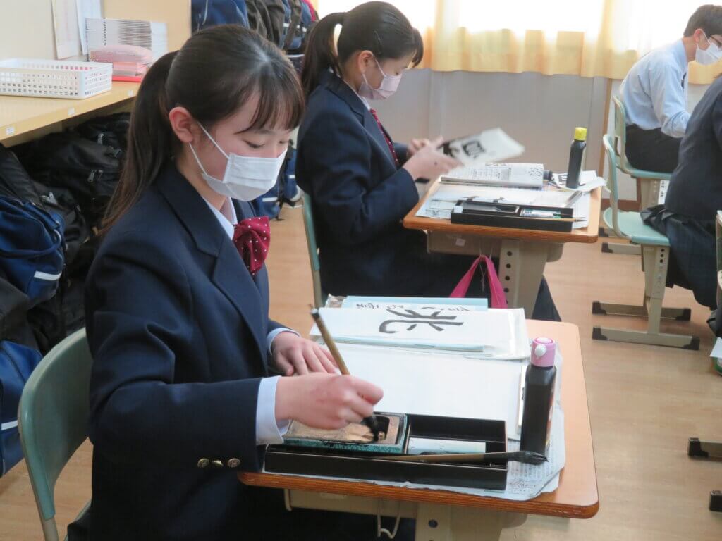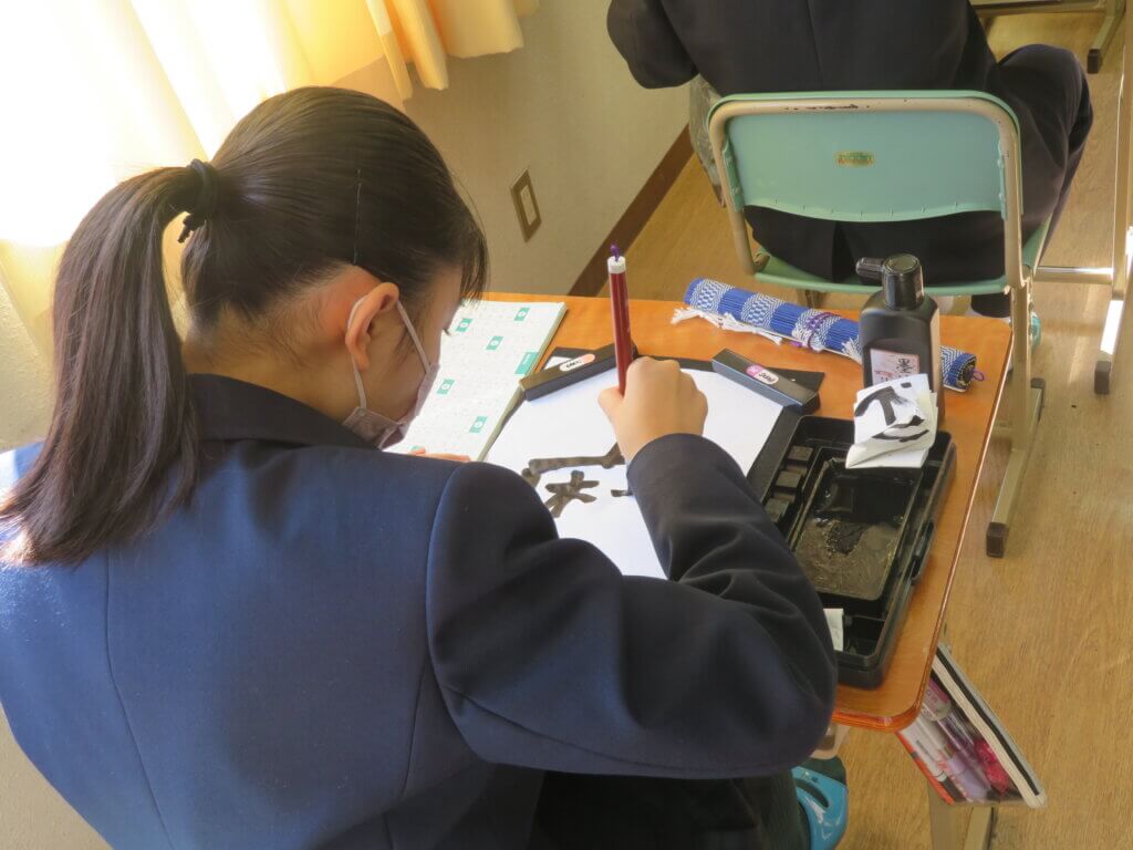 2月9日(水)に予定しています立志式に向け、J2生は書道の時間に自分で決めた一文字を清書していました。