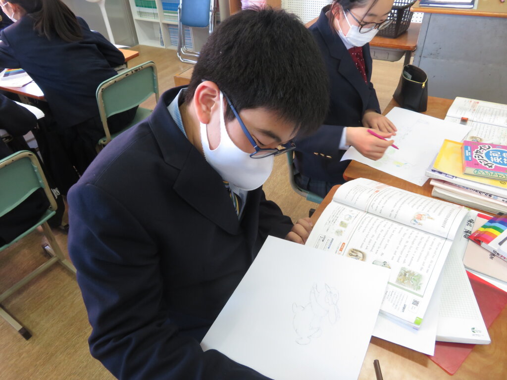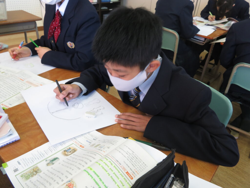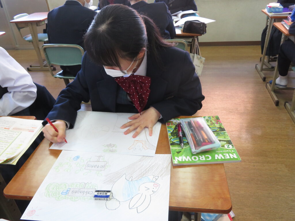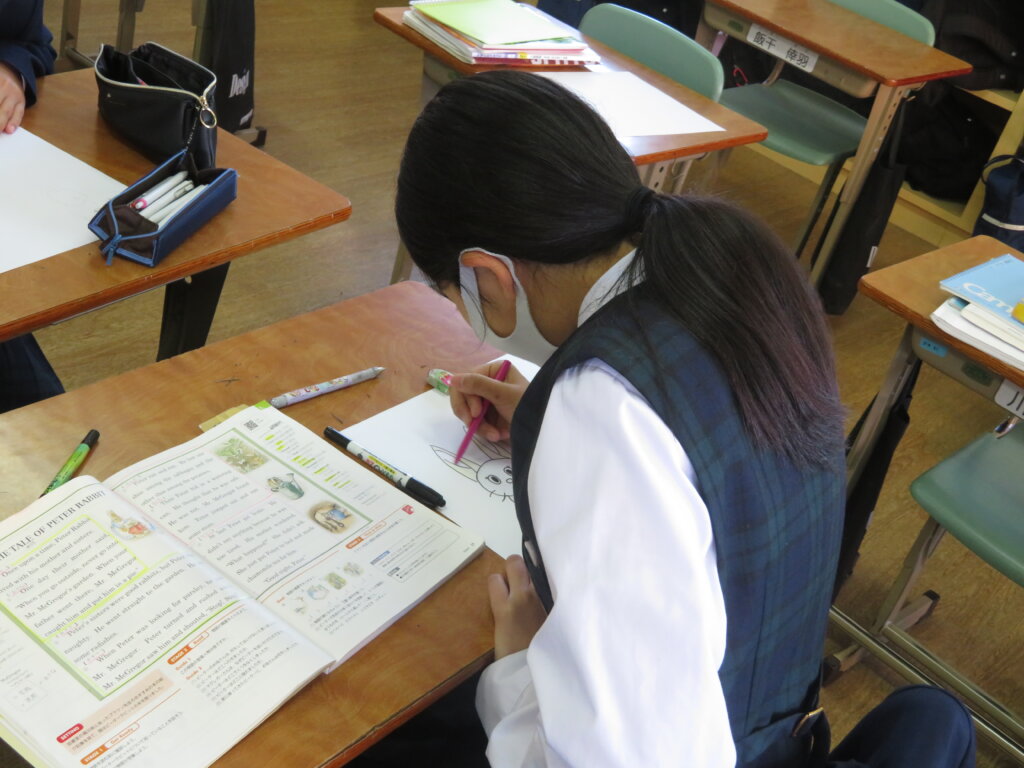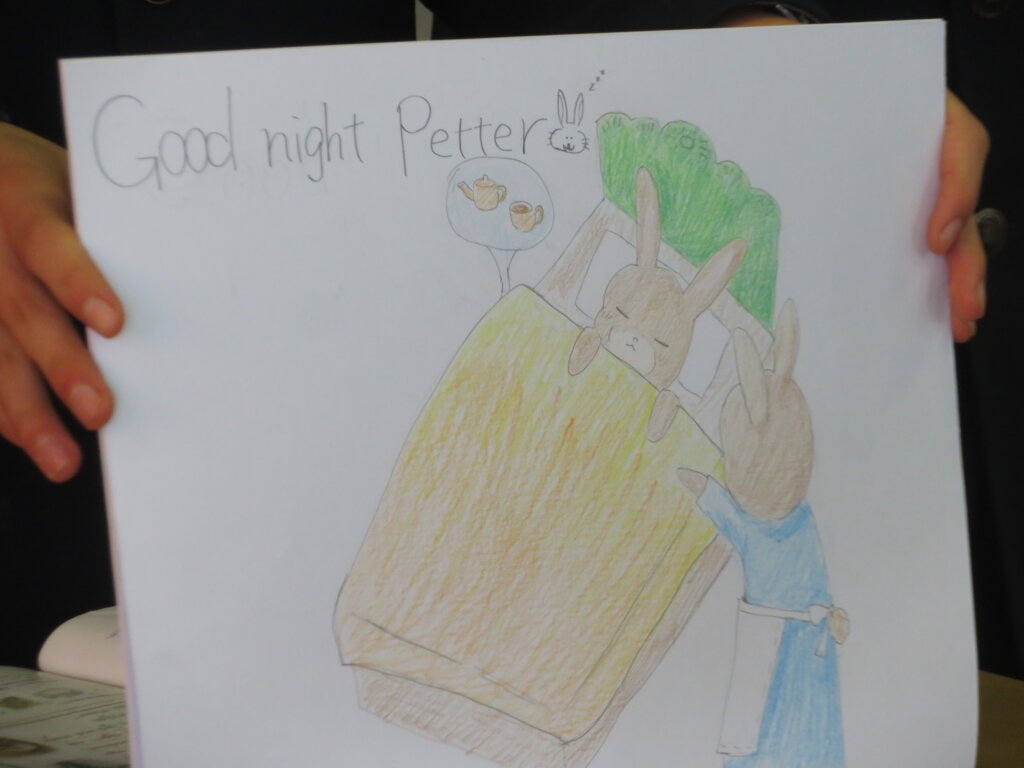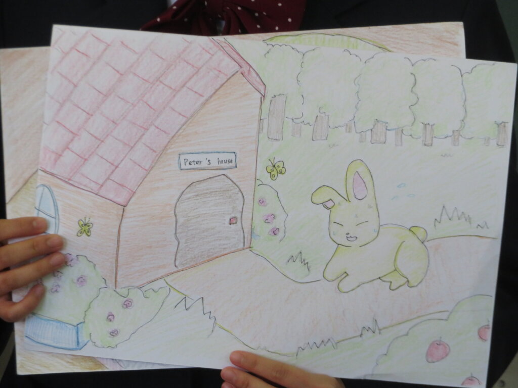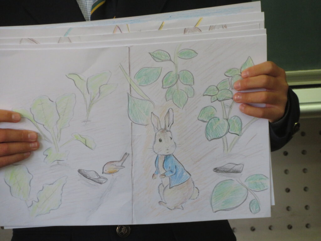 J1の英語発展クラスで、教科書に載っている「Peter Rabbit」の物語を読み、紙芝居の作成・発表をしました。