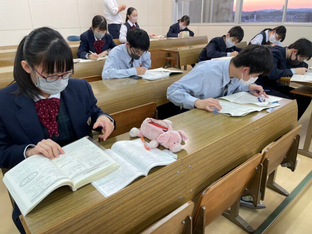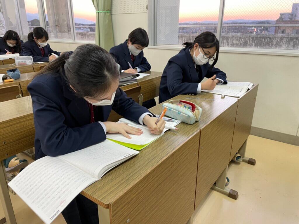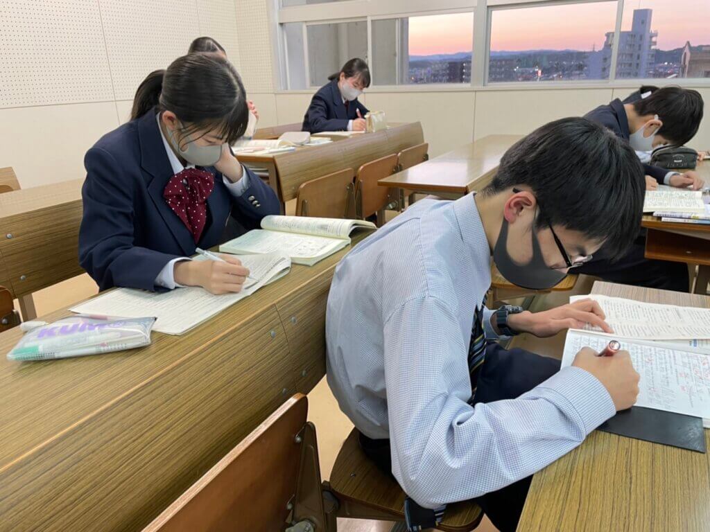 本日も、静かな環境の中黙々と学習に取り組む姿が見られました。会場である講義室からは、きれいな夕陽が見えました。