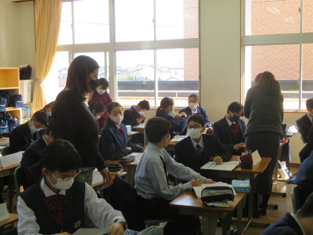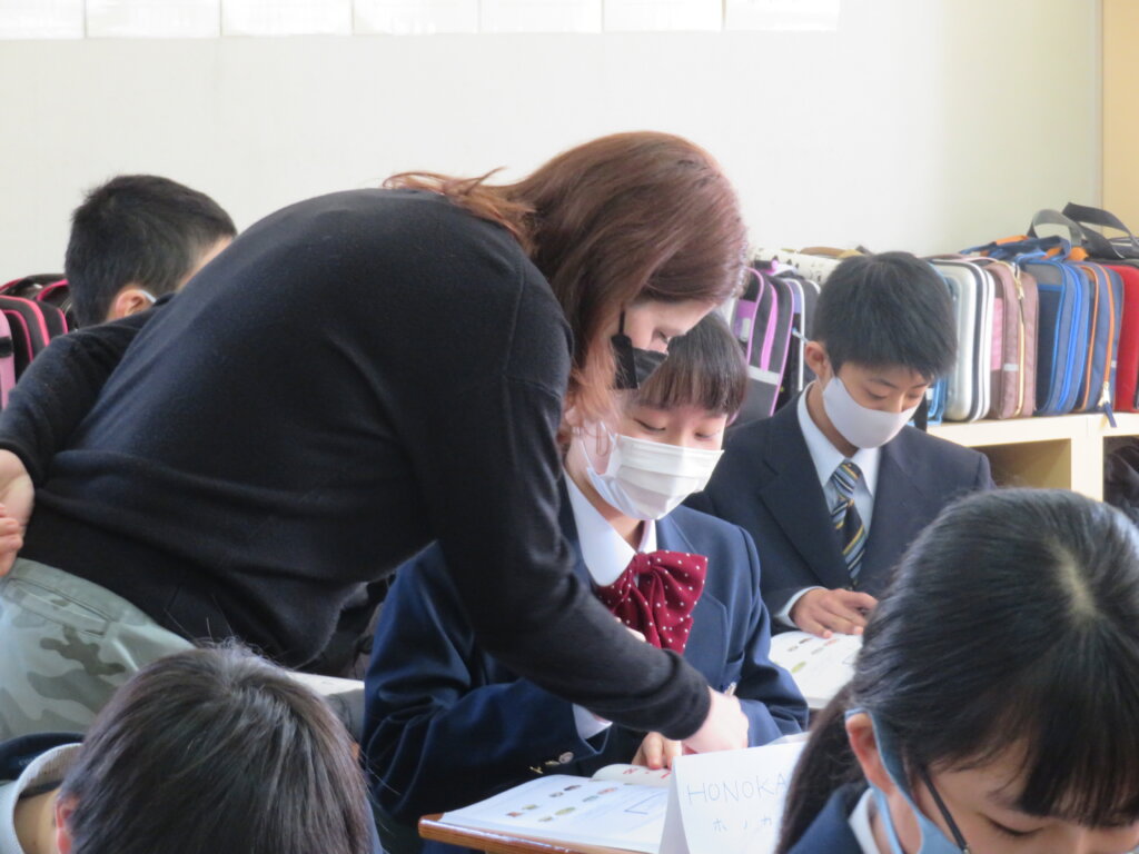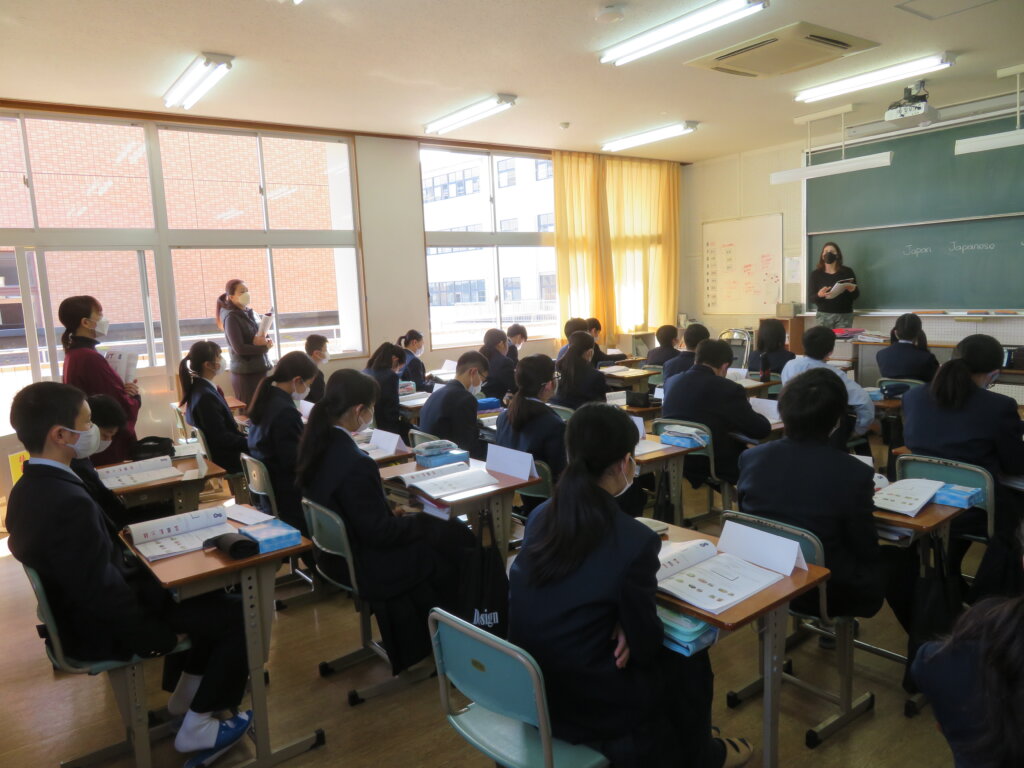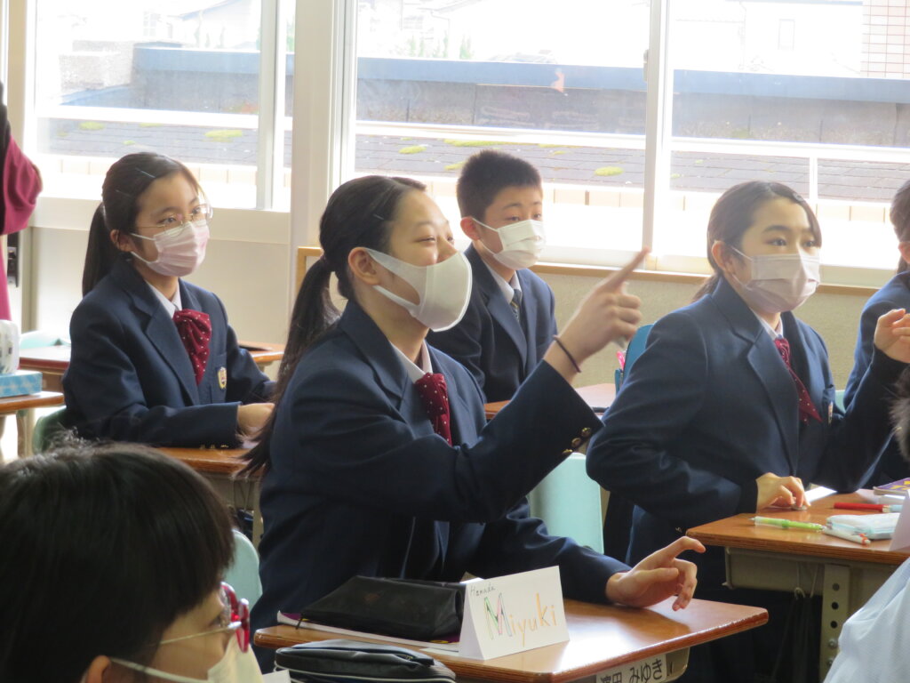 本日、教室から楽しそうな笑い声が聞こえてきたので、覗いてみると、ALTによる英会話の授業が行われていました。ジェニファー先生のクラスは、いろんな国についてクイズをしていました。デイビット先生のクラスは、1つの英単語から連想される単語を、クラスのみんなでどんどんつなげていく連想ゲームを通して、英単語の勉強をしていました。どちらも楽しそうに英会話の授業を行っていました。
