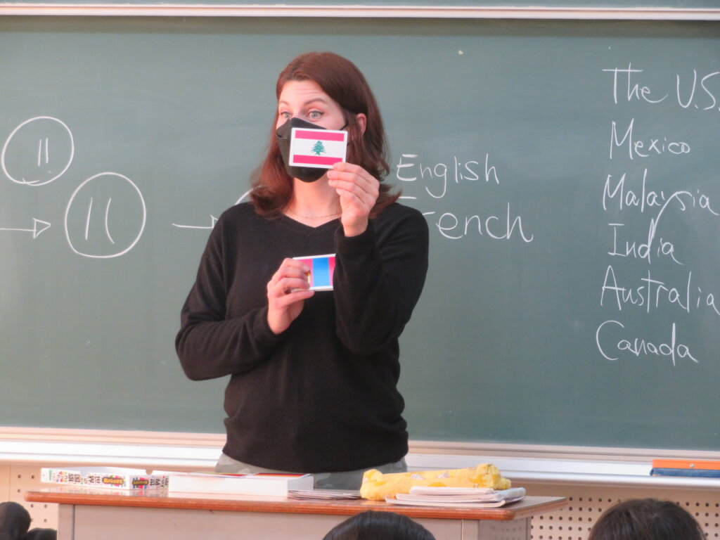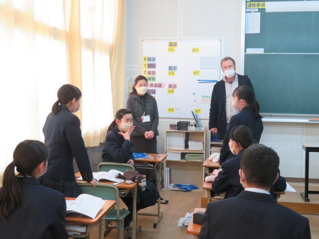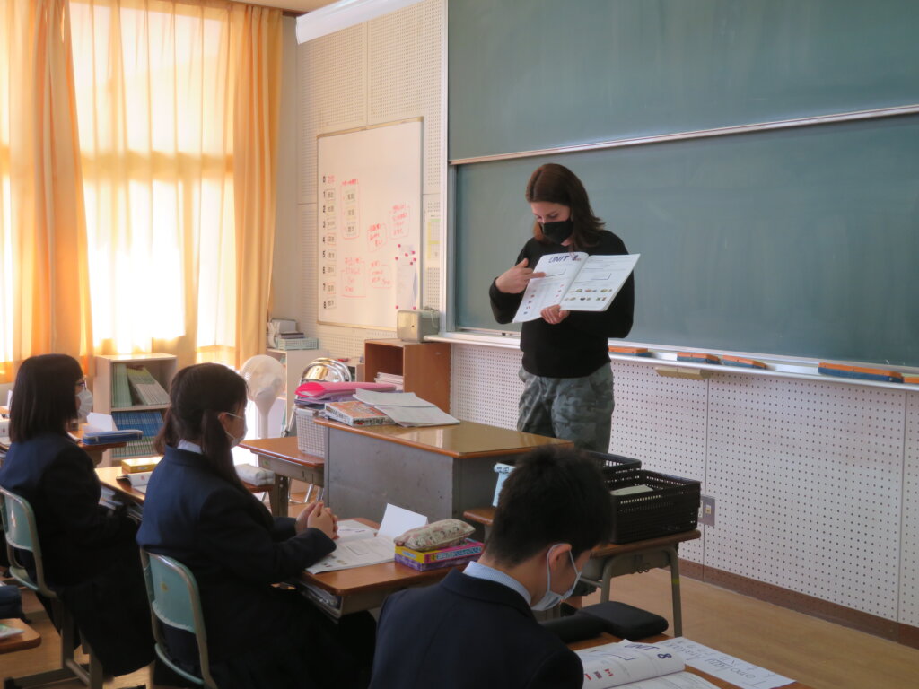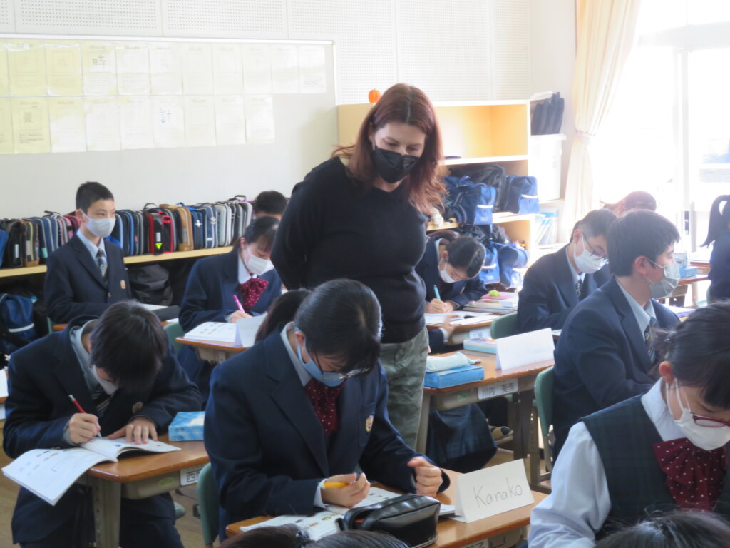本日、教室から楽しそうな笑い声が聞こえてきたので、覗いてみると、ALTによる英会話の授業が行われていました。ジェニファー先生のクラスは、いろんな国についてクイズをしていました。デイビット先生のクラスは、1つの英単語から連想される単語を、クラスのみんなでどんどんつなげていく連想ゲームを通して、英単語の勉強をしていました。どちらも楽しそうに英会話の授業を行っていました。