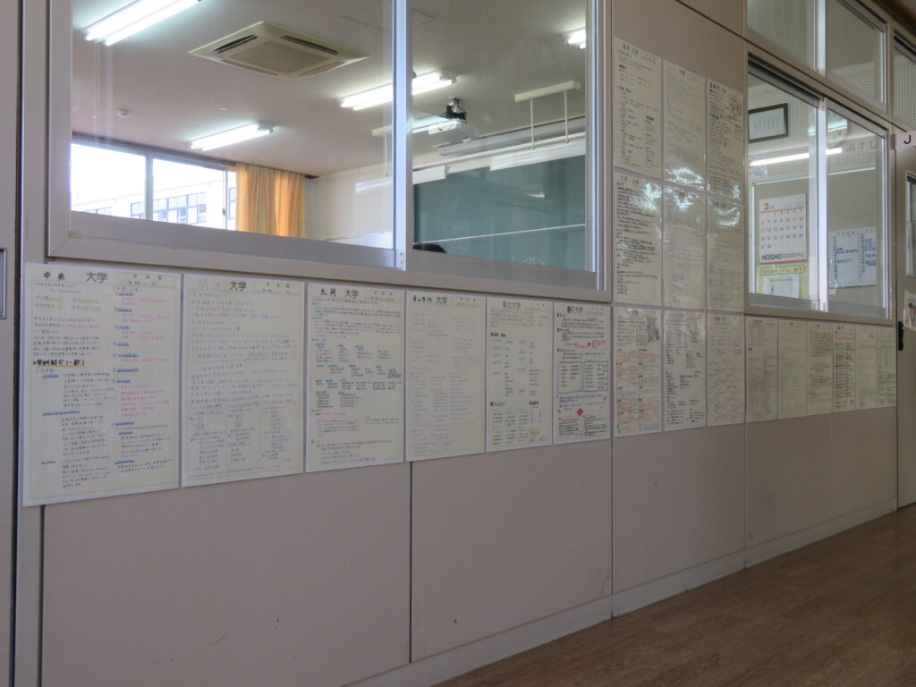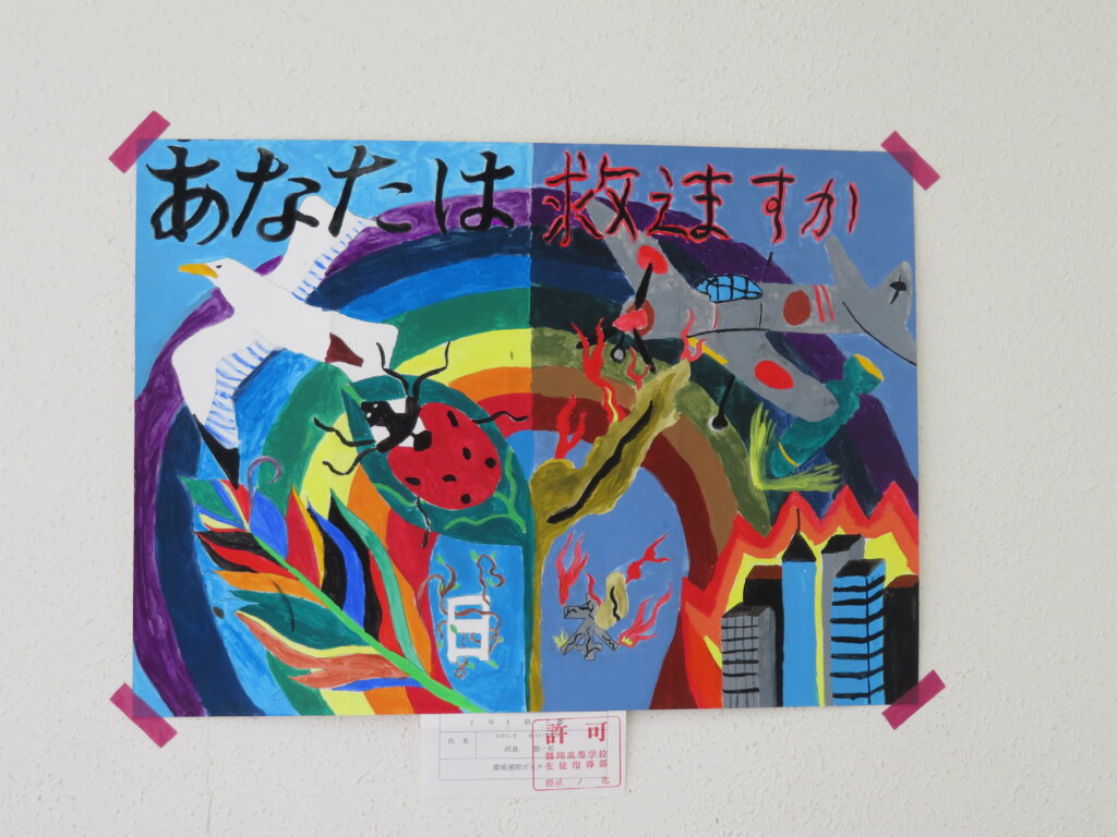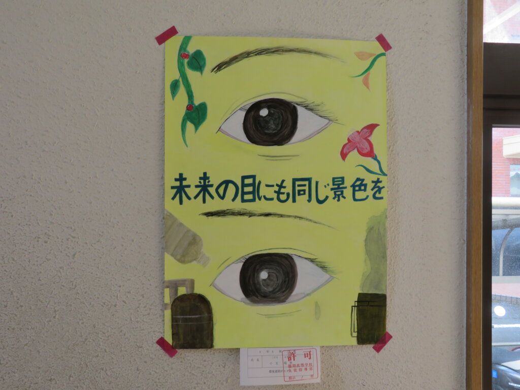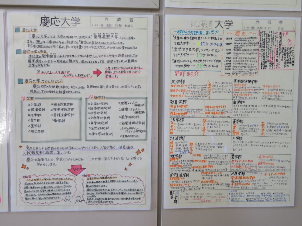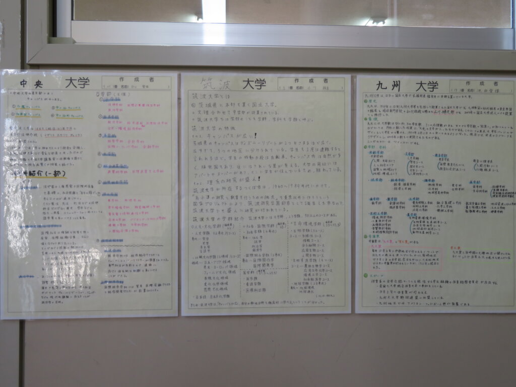 また、今日は廊下の掲示物を紹介します。2階には、大学調べのレポートや、人権週間・環境週間のポスターなどが掲示してあります。3階には、J3生の美術の作品を展示しています。
