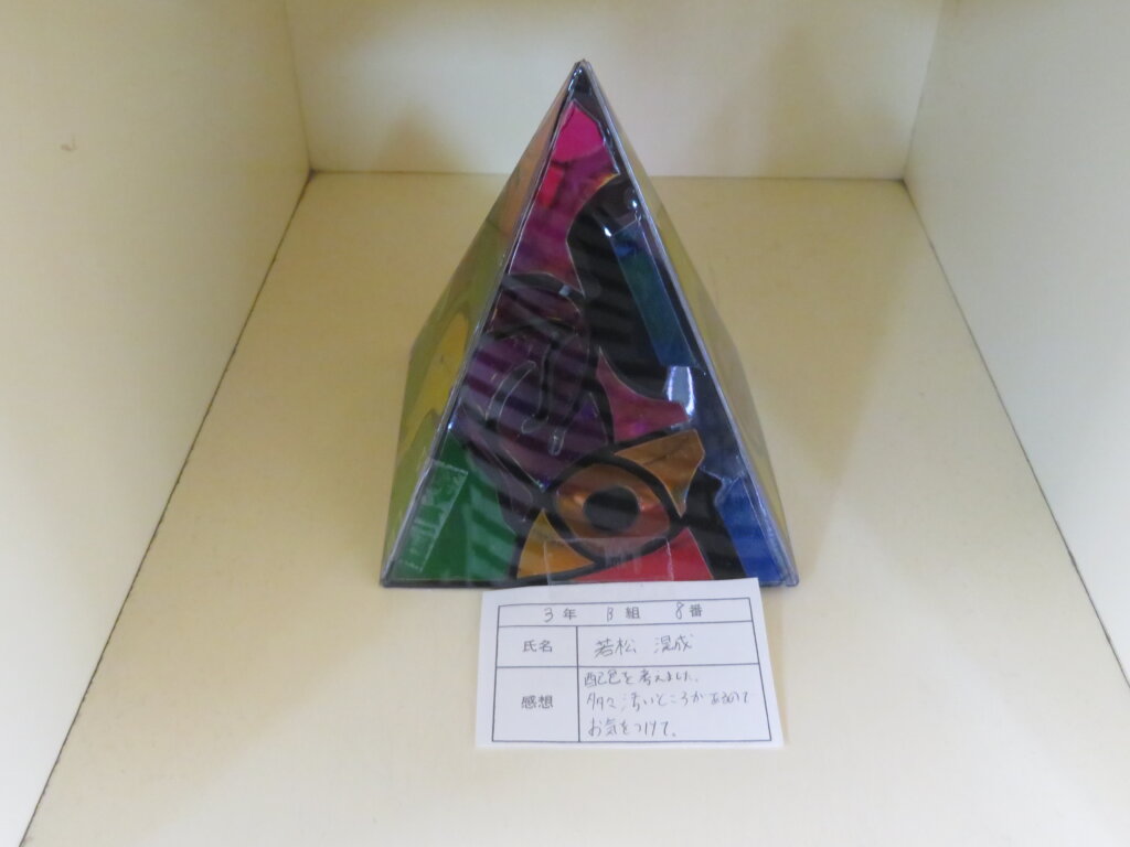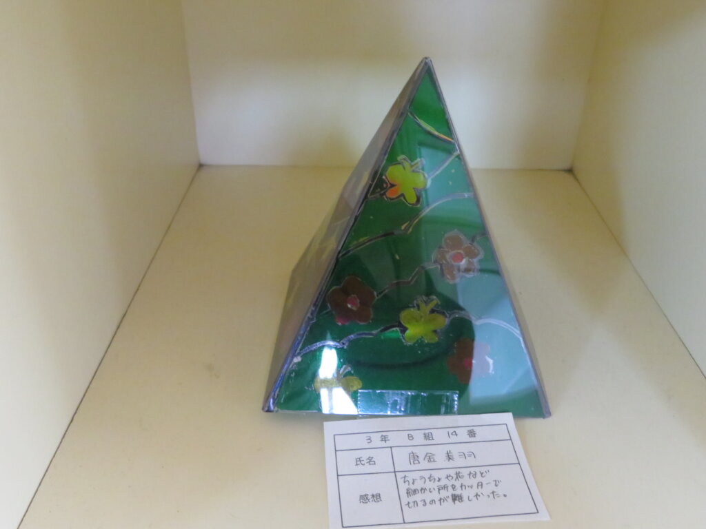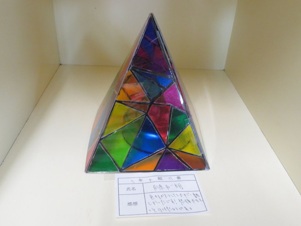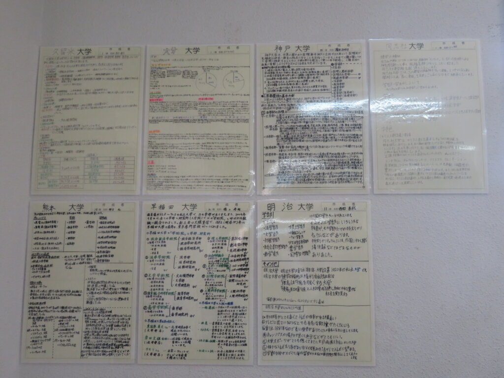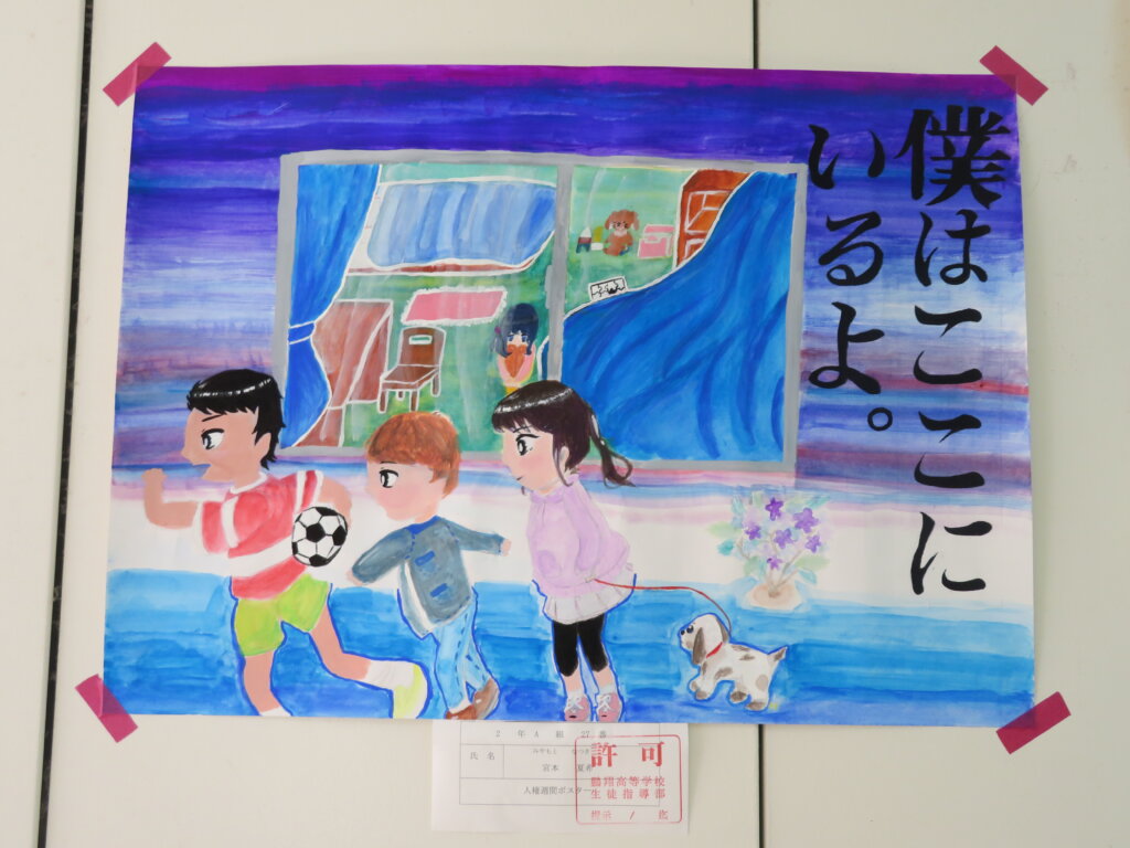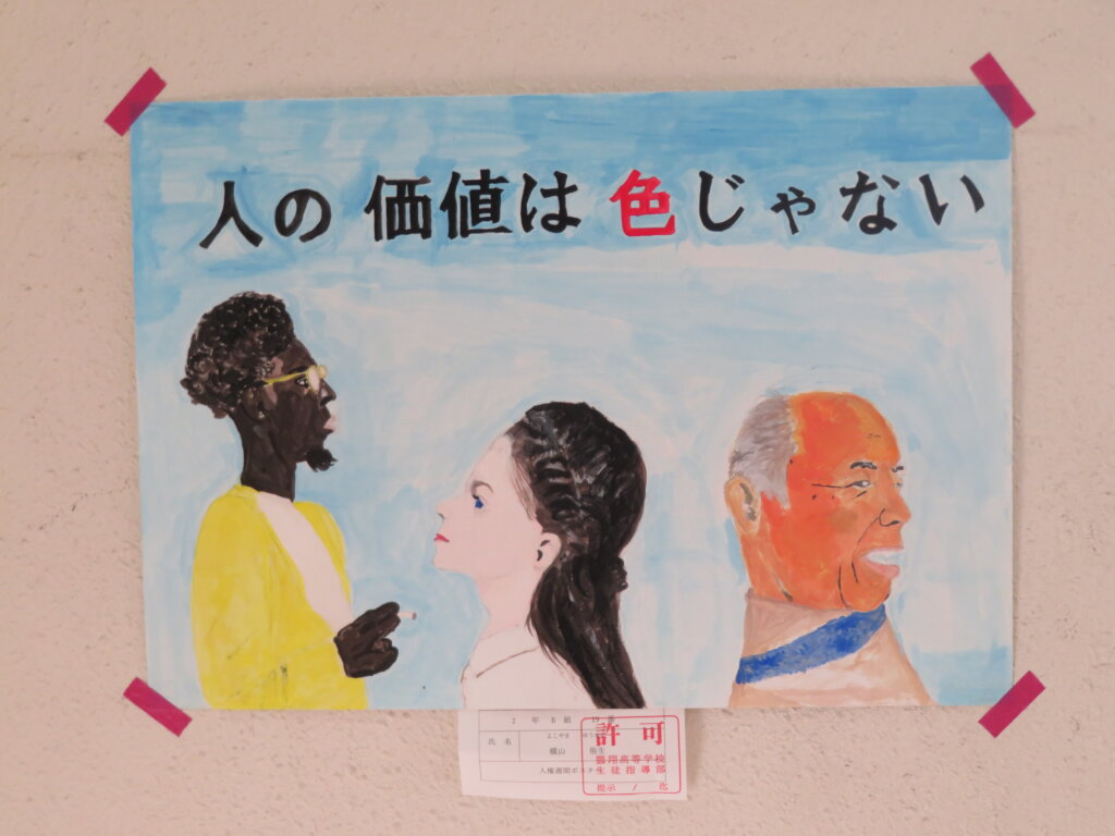 また、今日は廊下の掲示物を紹介します。2階には、大学調べのレポートや、人権週間・環境週間のポスターなどが掲示してあります。3階には、J3生の美術の作品を展示しています。