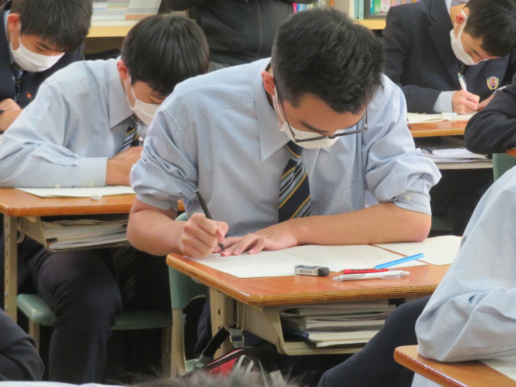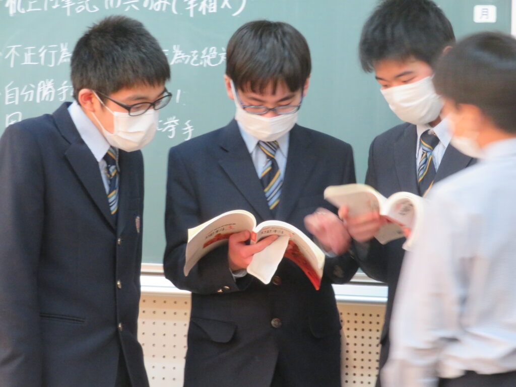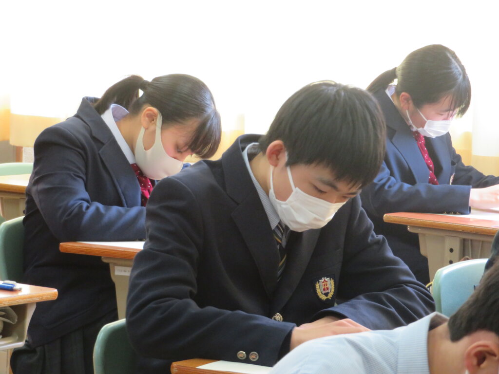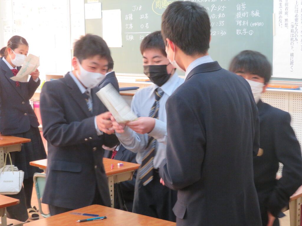 休み時間の様子です。黙々と自分でまとめたノートを確認する姿や、時間ぎりぎりまで友人たち同士で問題を出し合ったりする姿が各クラスで見られました。